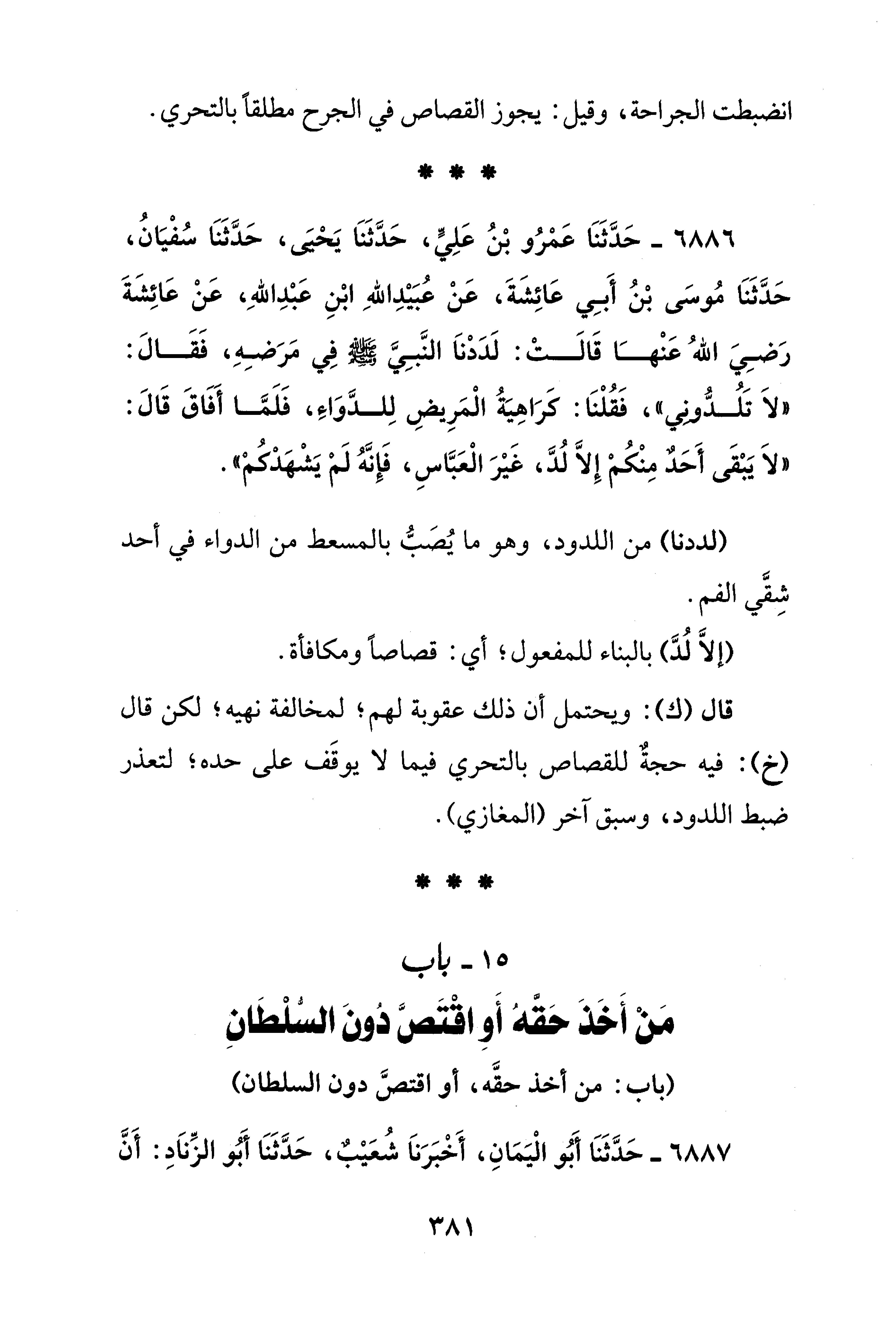 6886 - حَدَّثَنَا عَمْرُو بْنُ عَلِيٍّ، حَدَّثَنَا يَحْيَى، حَدَّثَنَا سُفْيَانُ، حَدَّثَنَا مُوسَى بْنُ أَبِي عَائِشَةَ، عَنْ عُبَيْدِ اللهِ بْنِ عَبْدِ اللهِ، عَنْ عَائِشَةَ رَضِيَ اللهُ عَنْهَا قَالَتْ: لَدَدْنَا النَّبِيَّ - صلى الله عليه وسلم - فِي مَرَضِهِ، فَقَالَ: "لَا تَلُدُّونِي"، فَقُلْنَا: كَرَاهِيةُ الْمَرِيضِ لِلدَّوَاءِ، فَلَمَّا أَفَاقَ قَالَ: "لَا يَبْقَى أَحَدٌ مِنْكُمْ إِلَّا لُدَّ، غَيْرَ الْعَبَّاسِ، فَإِنَّهُ لَمْ يَشْهَدْكُمْ".