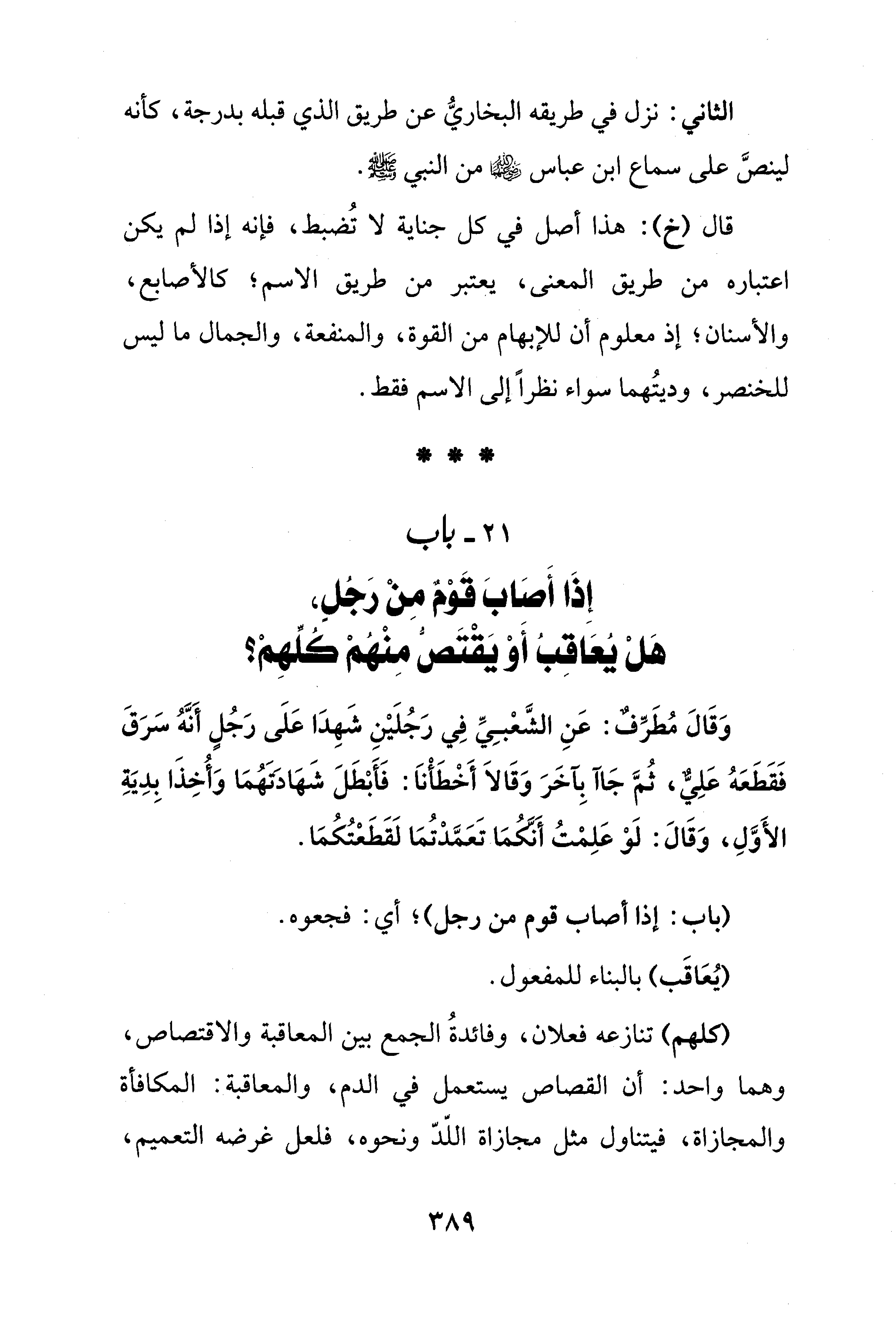 21 - باب إِذَا أَصَابَ قَوْمٌ مِنْ رَجُلٍ، هَلْ يُعَاقِبُ أَوْ يَقْتَصُّ مِنْهُمْ كلِّهِمْ؟