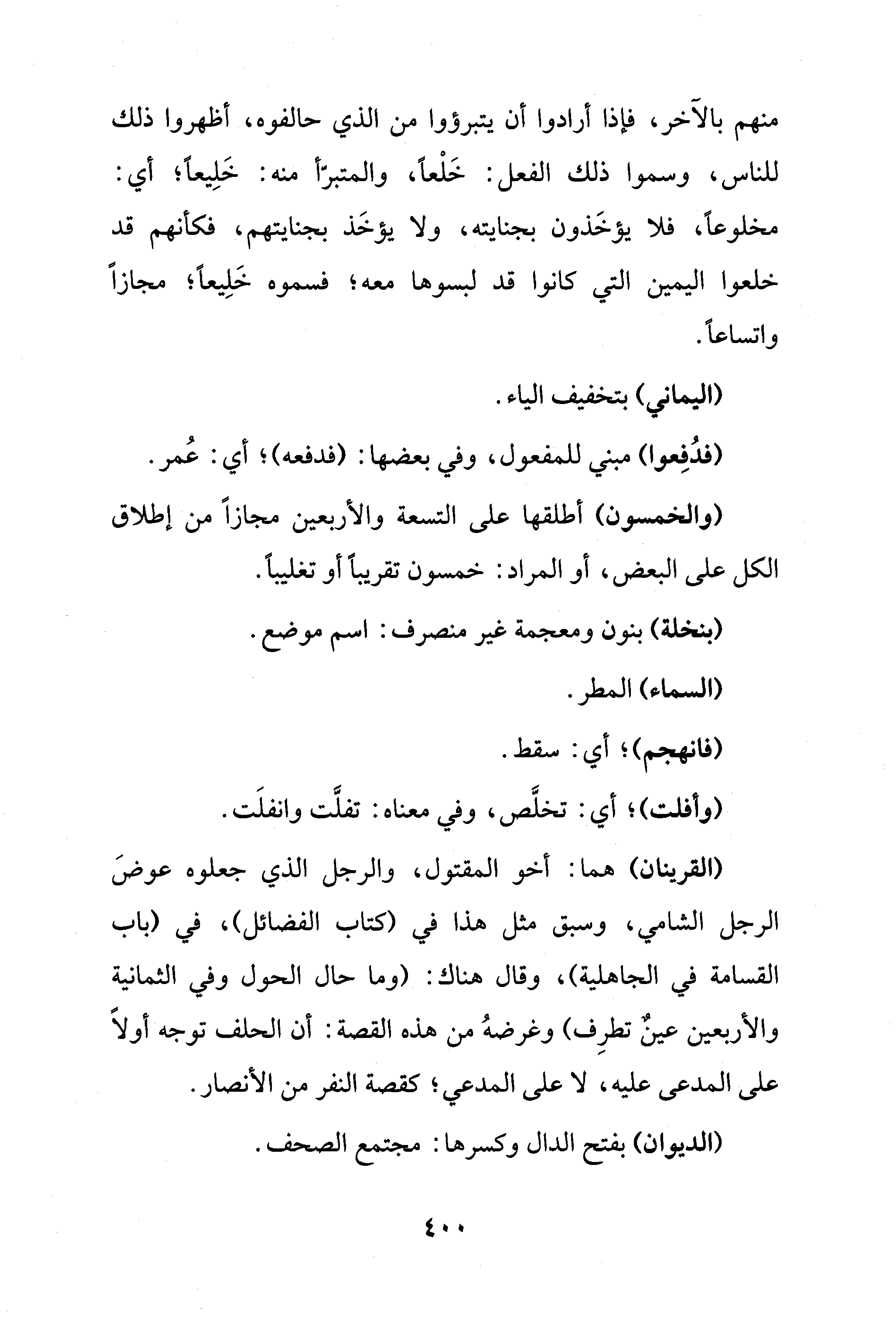 منهم بالآخر، فإذا أرادوا أن يتبرؤوا من الذي حالفوه، أظهروا ذلك للناس، وسموا ذلك الفعل: خَلْعًا، والمتبرّأ منه: خَلِيعًا؛ أي: مخلوعًا، فلا يؤخَذون بجنايته، ولا يؤخَذ بجنايتهم، فكأنهم قد خلعوا اليمين التي كانوا قد لبسوها معه؛ فسموه خَلِيعًا؛ مجازًا واتساعًا.