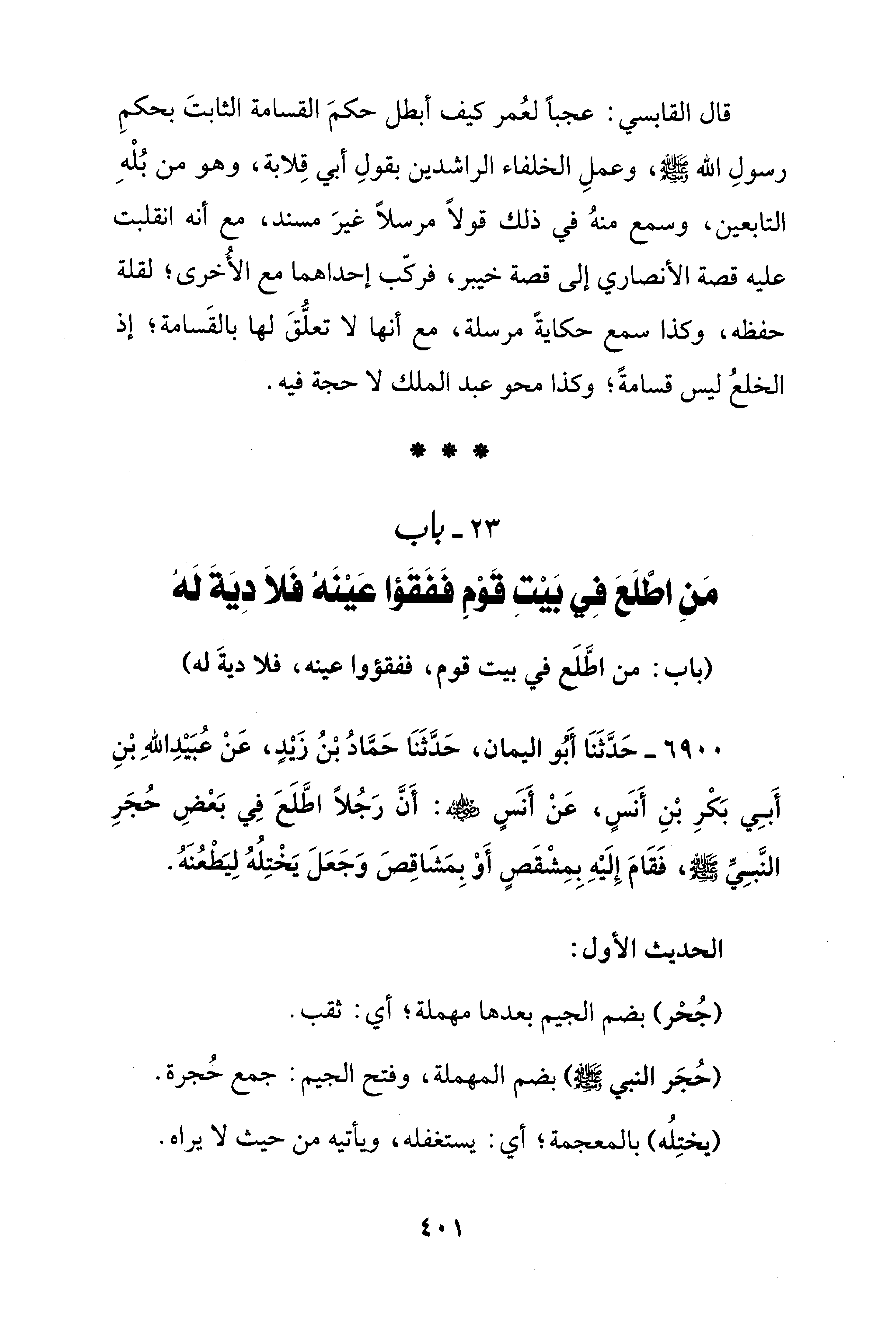 6900 - حَدَّثَنَا أَبُو اليمان، حَدَّثَنَا حَمَّادُ بْنُ زَيْدٍ، عَنْ عُبَيْدِ اللهِ بْنِ أَبِي بَكْرِ بْنِ أَنَسٍ، عَنْ أَنَسٍ - رضي الله عنه -: أَنَّ رَجُلًا اطَّلَعَ فِي بَعْضِ حُجَرِ النَّبِيِّ - صلى الله عليه وسلم -، فَقَامَ إِلَيْهِ بِمِشْقَصٍ أَوْ بِمَشَاقِصَ وَجَعَلَ يَخْتِلُهُ لِيَطْعُنَهُ.