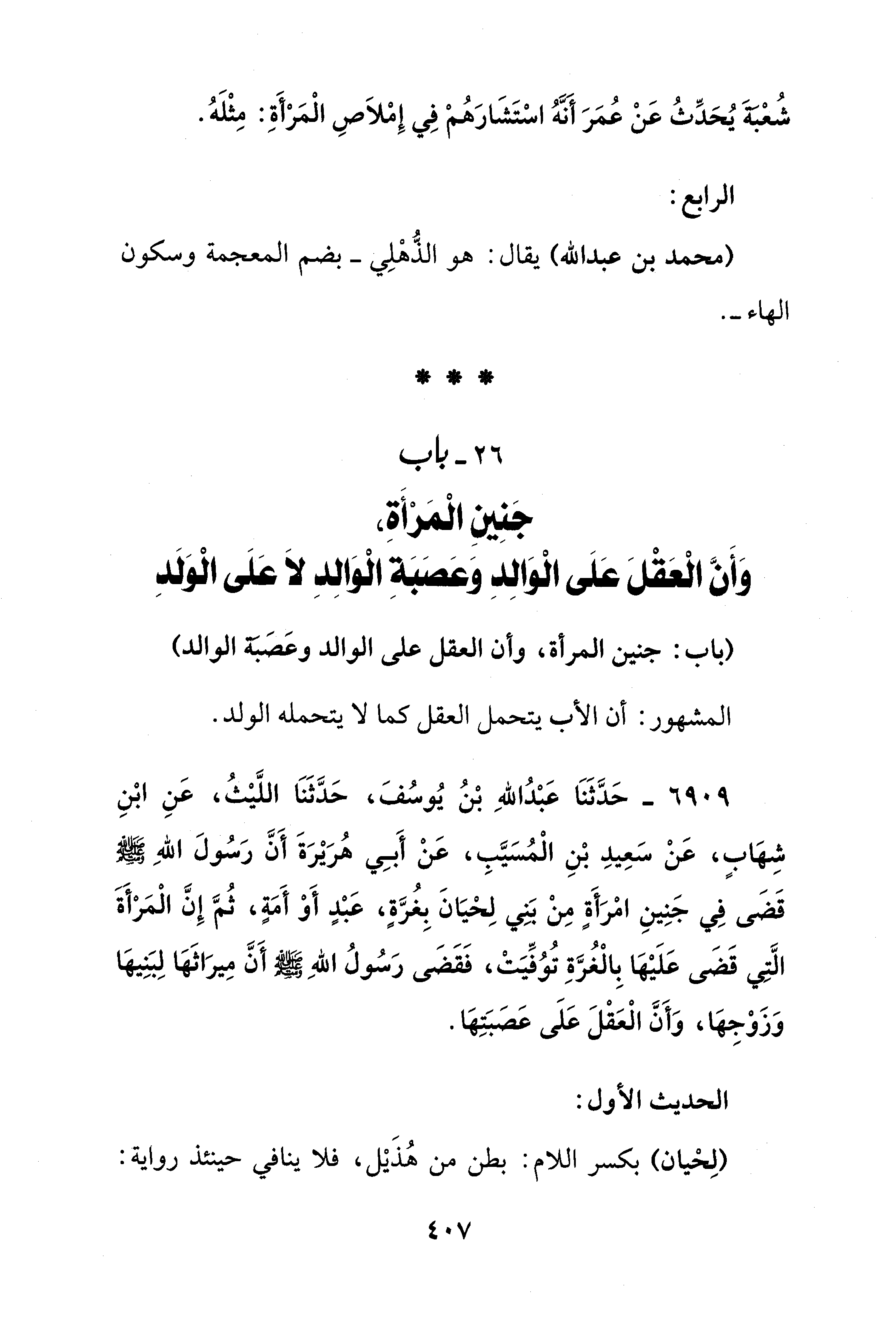 26 - باب جَنِينِ الْمَرْأَة، وَأَنَّ الْعَقْلَ عَلَى الْوَالِدِ وَعَصَبَةِ الْوَالِدِ لَا عَلَى الْوَلَدِ