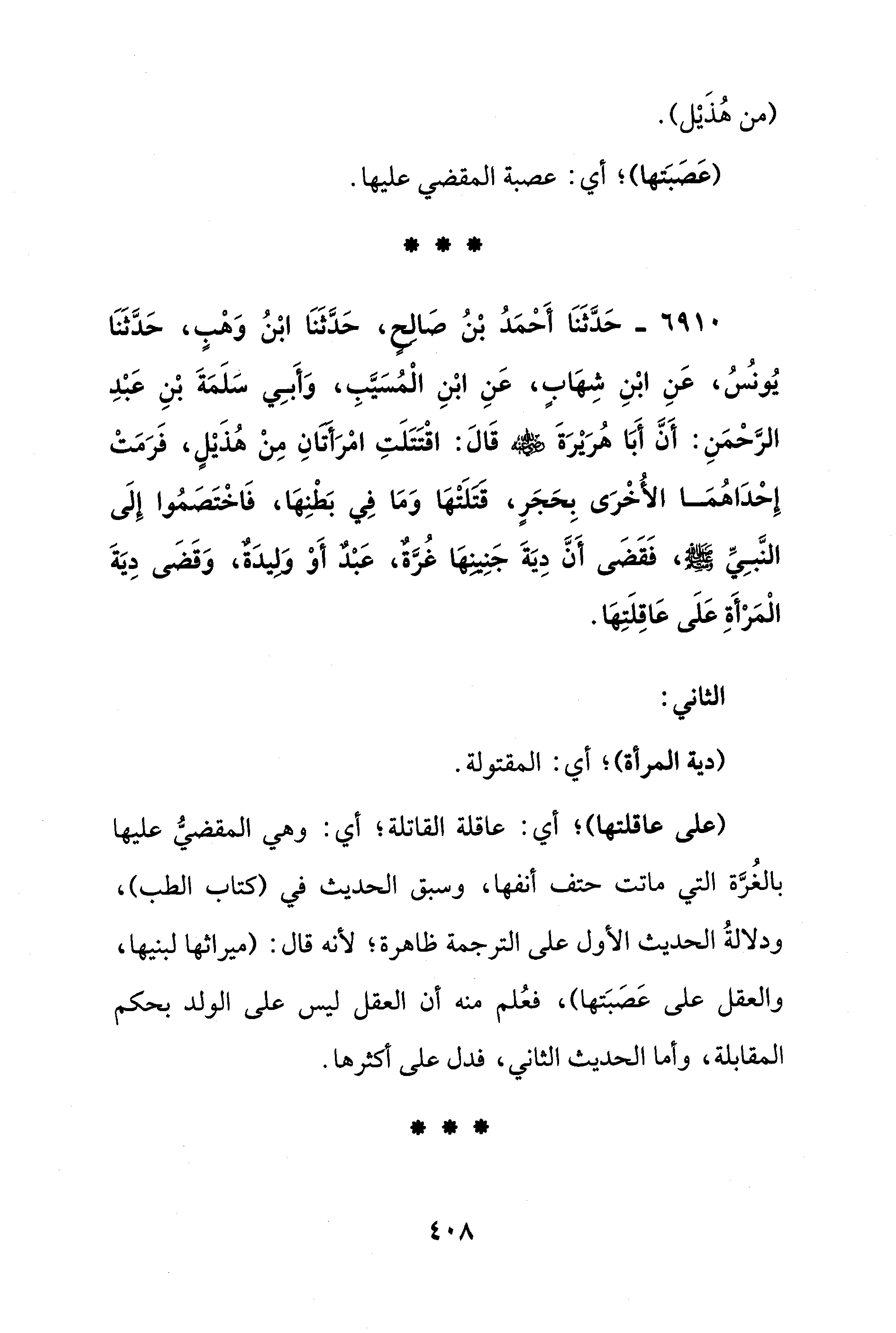 6910 - حَدَّثَنَا أَحْمَدُ بْنُ صَالِحٍ، حَدَّثَنَا ابْنُ وَهْبٍ، حَدَّثَنَا يُونُسُ، عَنِ ابْنِ شِهَابٍ، عَنِ ابْنِ الْمُسَيَّبِ، وَأَبِي سَلَمَةَ بْنِ عَبْدِ الرَّحْمَنِ: أَنَّ أَبَا هُرَيْرَةَ - رضي الله عنه - قَالَ: اقْتَتَلَتِ امْرَأَتَانِ مِنْ هُذَيْلٍ، فَرَمَتْ إِحْدَاهُمَا الأُخْرَى بِحَجَرٍ، قَتَلَتْهَا وَمَا فِي بَطْنِهَا، فَاخْتَصَمُوا إِلَى النَّبِيِّ - صلى الله عليه وسلم -، فَقَضَى أَنَّ دِيَةَ جَنِينِهَا غُرَّةٌ، عَبْدٌ أَوْ وَلِيدَةٌ، وَقَضَى دِيَةَ الْمَرْأَةِ عَلَى عَاقِلَتِهَا.
