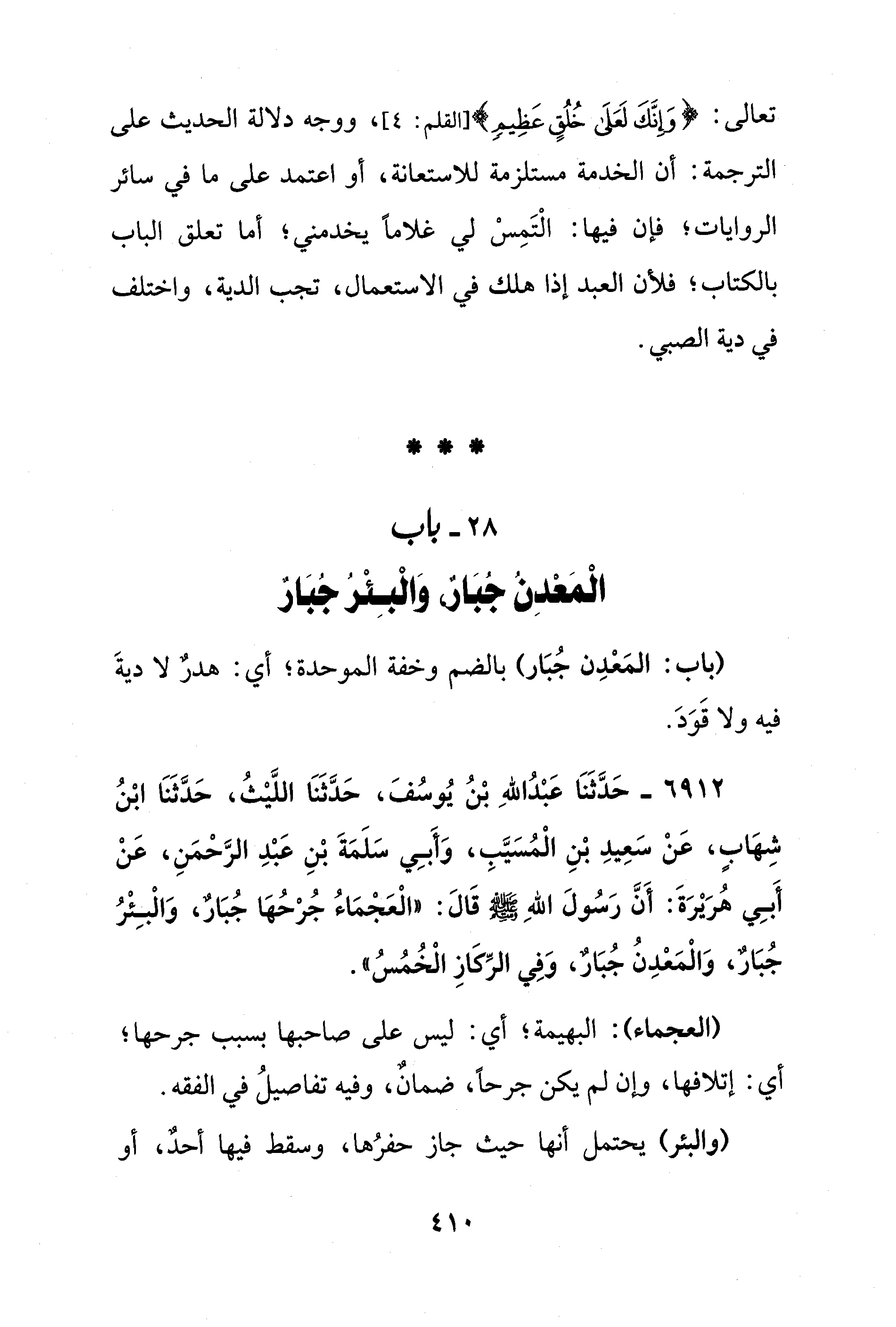 6912 - حَدَّثَنَا عَبْدُ اللهِ بْنُ يُوسُفَ، حَدَّثَنَا اللَّيْثُ، حَدَّثَنَا ابْنُ شِهَابٍ، عَنْ سَعِيدِ بْنِ الْمُسَيَّبِ، وَأَبِي سَلَمَةَ بْنِ عَبْدِ الرَّحْمَنِ، عَنْ أَبِي هُرَيْرَةَ: أَنَّ رَسُولَ اللهِ - صلى الله عليه وسلم - قَالَ: "الْعَجْمَاءُ جُرْحُهَا جُبَارٌ، وَالْبِئْرُ جُبَارٌ، وَالْمَعْدِنُ جُبَارٌ، وَفِي الرِّكَازِ الْخُمُسُ".