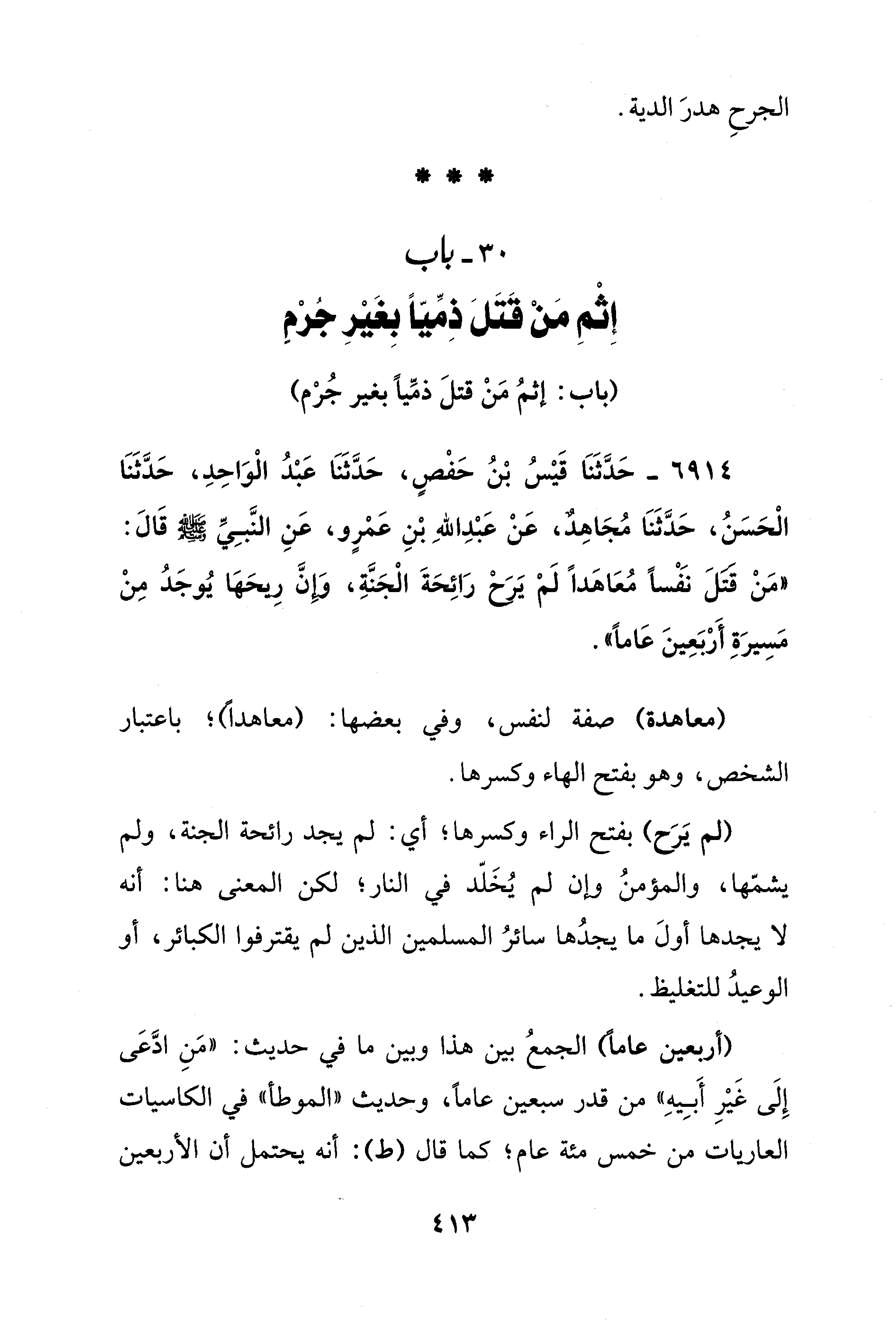 6914 - حَدَّثَنَا قَيْسُ بْنُ حَفْصٍ، حَدَّثَنَا عَبْدُ الْوَاحِدِ، حَدَّثَنَا الْحَسَنُ، حَدَّثَنَا مُجَاهِدٌ، عَنْ عَبْدِ اللهِ بْنِ عَمْرٍو، عَنِ النَّبِيِّ - صلى الله عليه وسلم - قَالَ: "مَنْ قتلَ نَفْسًا مُعَاهَدًا لَمْ يَرَحْ رَائِحَةَ الْجَنَّةِ، وَإِنَّ رِيحَهَا يُوجَدُ مِنْ مَسِيرَةِ أَرْبَعِينَ عَامًا".