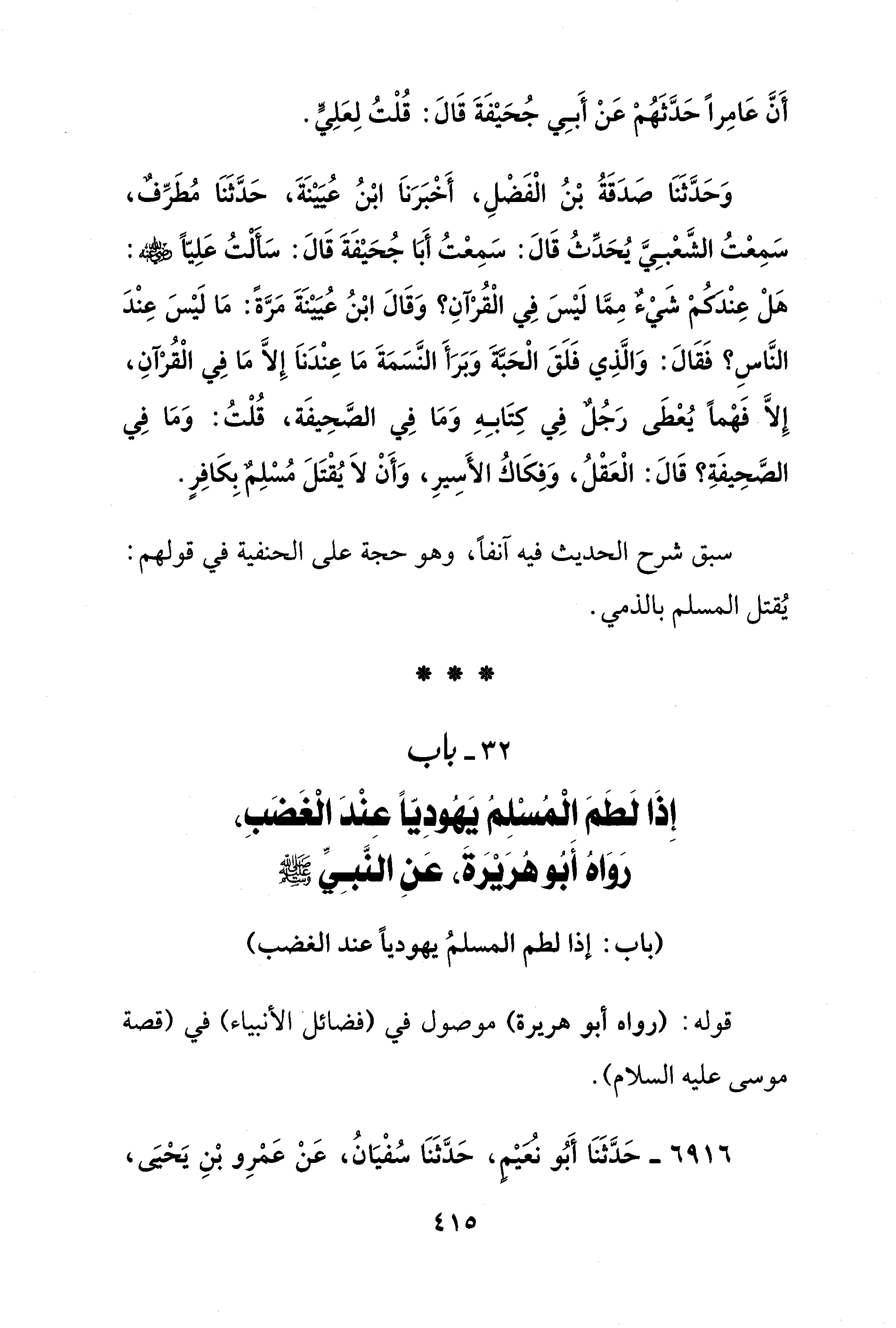 وَحَدَّثَنَا صَدَقَةُ بْنُ الْفَضْلِ، أَخْبَرَنَا ابْنُ عُيَيْنَةَ، حَدَّثَنَا مُطَرِّفٌ، سَمِعْتُ الشَّعْبِيَّ يُحَدِّثُ قَالَ: سَمِعْتُ أَبَا جُحَيْفَةَ قَالَ: سَأَلْتُ عَلِيًّا - رضي الله عنه -: هَلْ عِنْدَكُمْ شَيْءٌ مِمَّا لَيْسَ فِي الْقُرْآنِ؟ وَقَالَ ابْنُ عُيَيْنَةَ مَرَّةً: مَا لَيْسَ عِنْدَ النَّاسِ؟ فَقَالَ: وَالَّذِي فَلَقَ الْحَبَّةَ وَبَرَأَ النَّسَمَةَ مَا عِنْدَنَا إِلَّا مَا فِي الْقُرْآنِ، إِلَّا فَهْمًا يُعْطَى رَجُلٌ فِي كِتَابِهِ وَمَا فِي الصَّحِيفَة، قُلْتُ: وَمَا فِي الصَّحِيفَةِ؟ قَالَ: الْعَقْلُ، وَفِكَاكُ الأَسِيرِ، وَأَنْ لَا يُقْتَلَ مُسْلِمٌ بِكَافِرٍ.