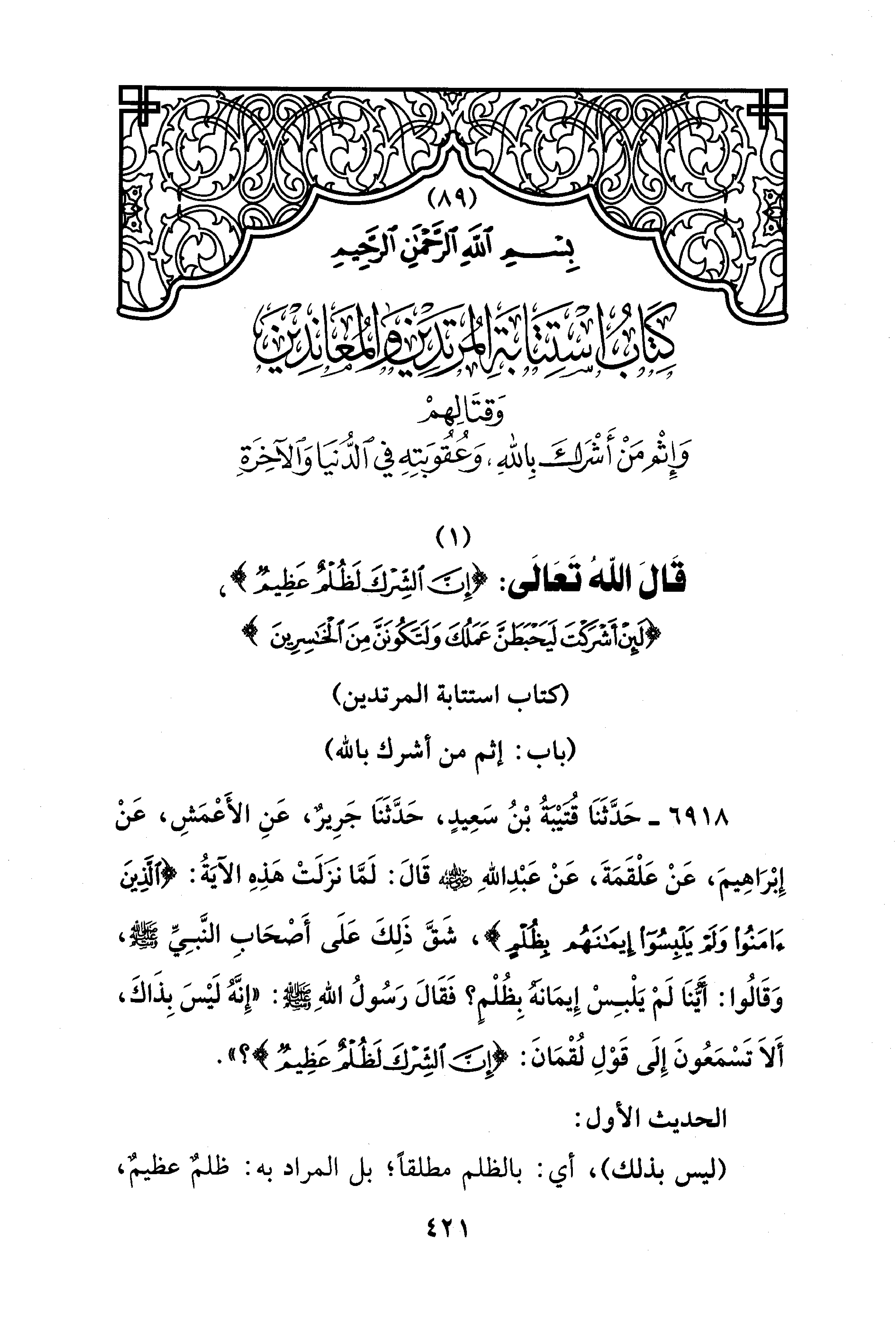 89 - كَتِابُ استِتَابَةِ المُرتَدِّينَ وَالمعَانِدينَ وَقتَالِهمْ وَإِثْم مَنْ أَشْرَكَ بِاللهِ، وَعُقُوَبِتِه في الدُّنَيا وَالآخِرَةِ