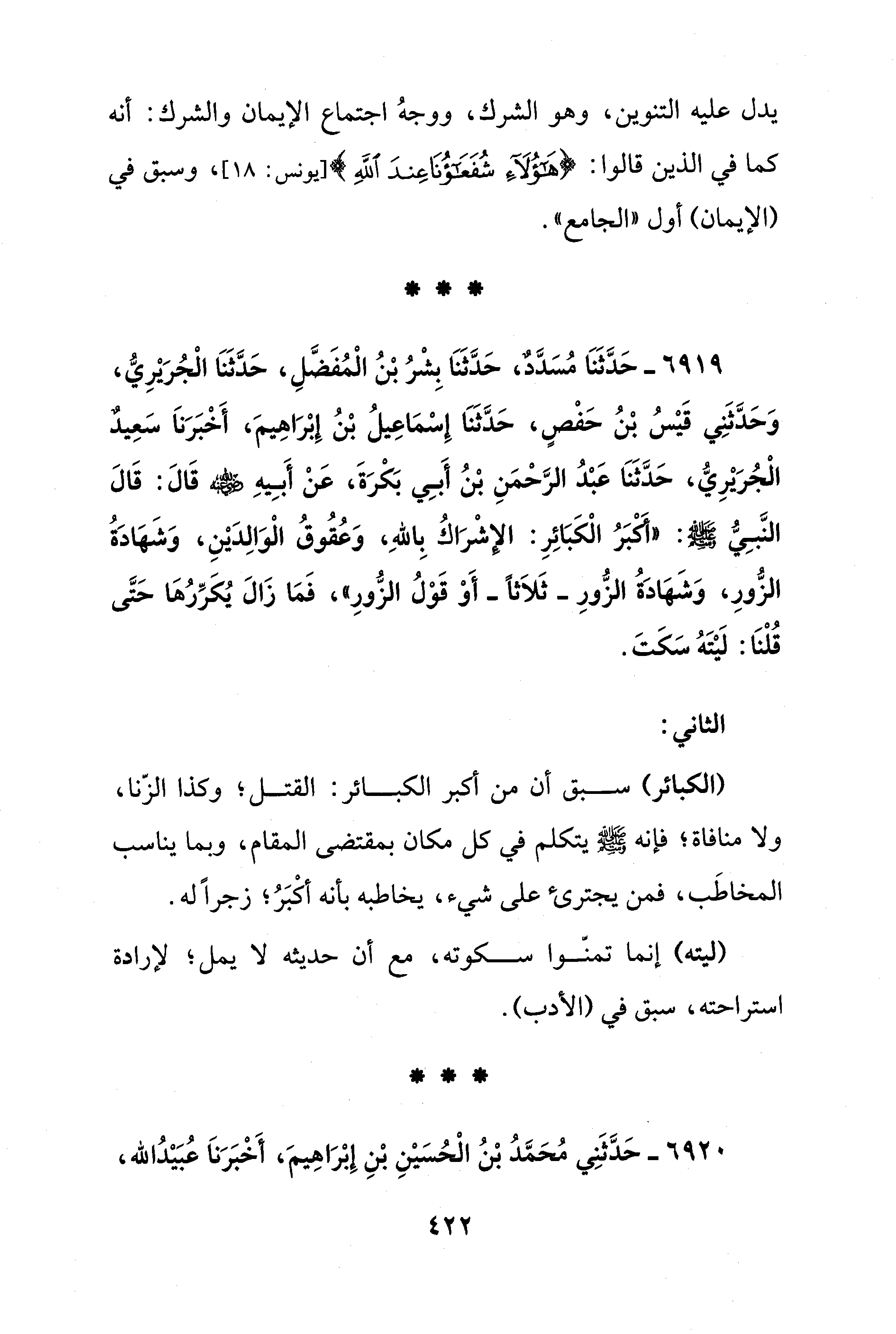 6919 - حَدَّثَنَا مُسَدَّدٌ، حَدَّثَنَا بِشْرُ بْنُ الْمُفَضَّلِ، حَدَّثَنَا الْجُرَيْرِيُّ، وَحَدَّثَنِي قَيْسُ بْنُ حَفْصٍ، حَدَّثَنَا إِسْمَاعِيلُ بْنُ إِبْرَاهِيمَ، أَخْبَرَنَا سَعِيدٌ الْجُرَيْرِيُّ، حَدَّثَنَا عَبْدُ الرَّحْمَنِ بْنُ أَبِي بَكْرَةَ، عَنْ أَبِيهِ - رضي الله عنه - قَالَ: قَالَ النَّبِيُّ - صلى الله عليه وسلم -: "أَكْبَرُ الْكَبَائِرِ: الإشْرَاكُ بِاللهِ، وَعُقُوقُ الْوَالِدَيْنِ، وَشَهَادَةُ الزُّورِ، وَشَهَادَةُ الزُّورِ -ثَلاَثًا- أَوْ قَوْلُ الزُّورِ"، فَمَا زَالَ يُكَرِّرُهَا حَتَّى قُلْنَا: لَيْتَهُ سَكَتَ.