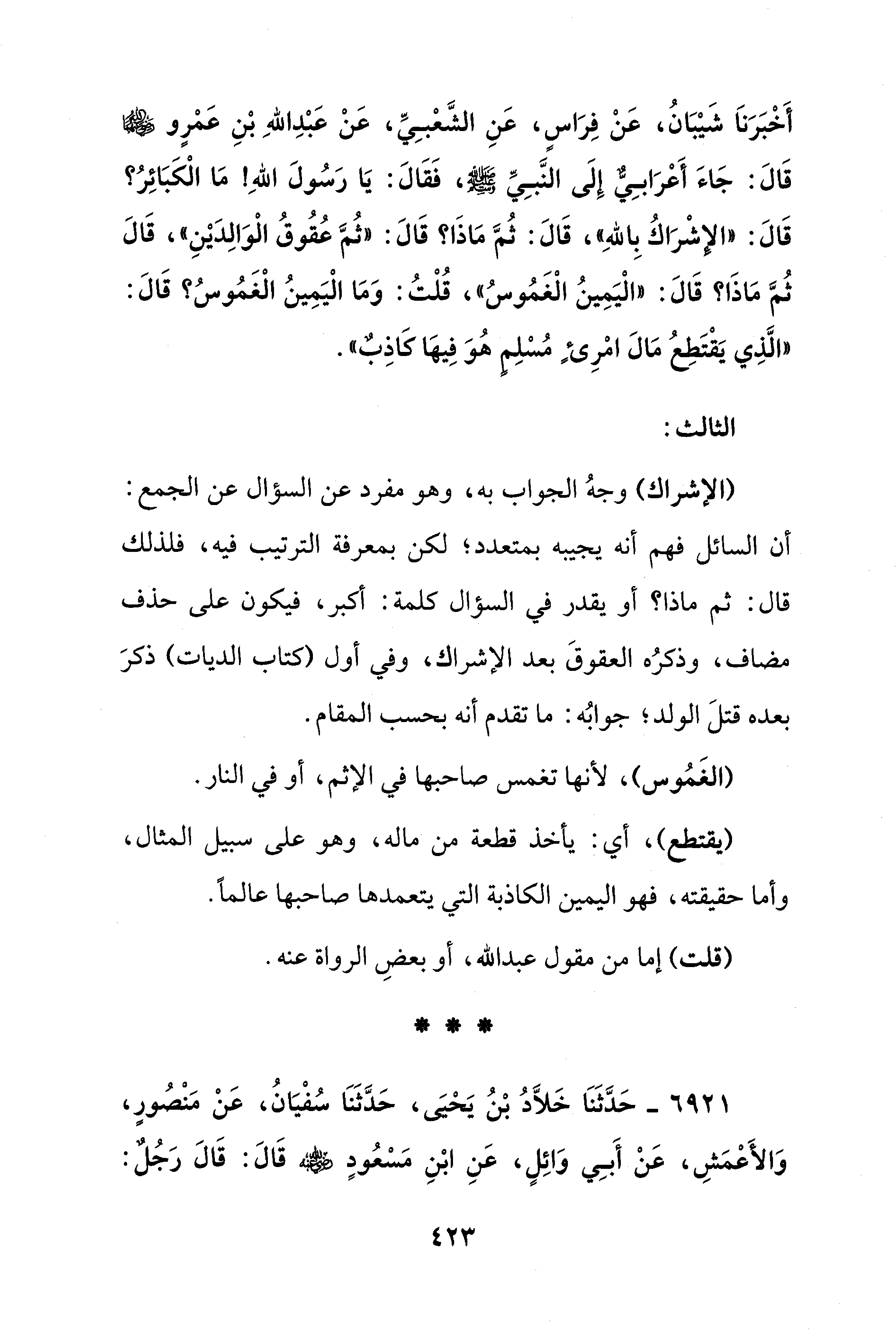 أَخْبَرَنَا شَيْبَانُ، عَنْ فِرَاسٍ، عَنِ الشَّعْبِي، عَنْ عَبْدِ اللهِ بْنِ عَمْرٍو - رضي الله عنهما - قَالَ: جَاءَ أَعْرَابِيٌّ إِلَى النَّبِيِّ - صلى الله عليه وسلم -، فَقَالَ: يَا رَسُولَ اللهِ! مَا الْكَبَائِرُ؟ قَالَ: "الإِشْرَاكُ بِاللهِ"، قَالَ: ثُمَّ مَاذَا؟ قَالَ: "ثُمَّ عُقُوقُ الْوَالِدَيْنِ"، قَالَ ثُمَّ مَاذَا؟ قَالَ: "الْيَمِينُ الْغَمُوسُ"، قُلْتُ: وَمَا الْيَمِينُ الْغَمُوسُ؟ قَالَ: "الَّذِي يَقْتَطِعُ مَالَ امْرِئٍ مُسْلِمٍ هُوَ فِيهَا كَاذِبٌ".