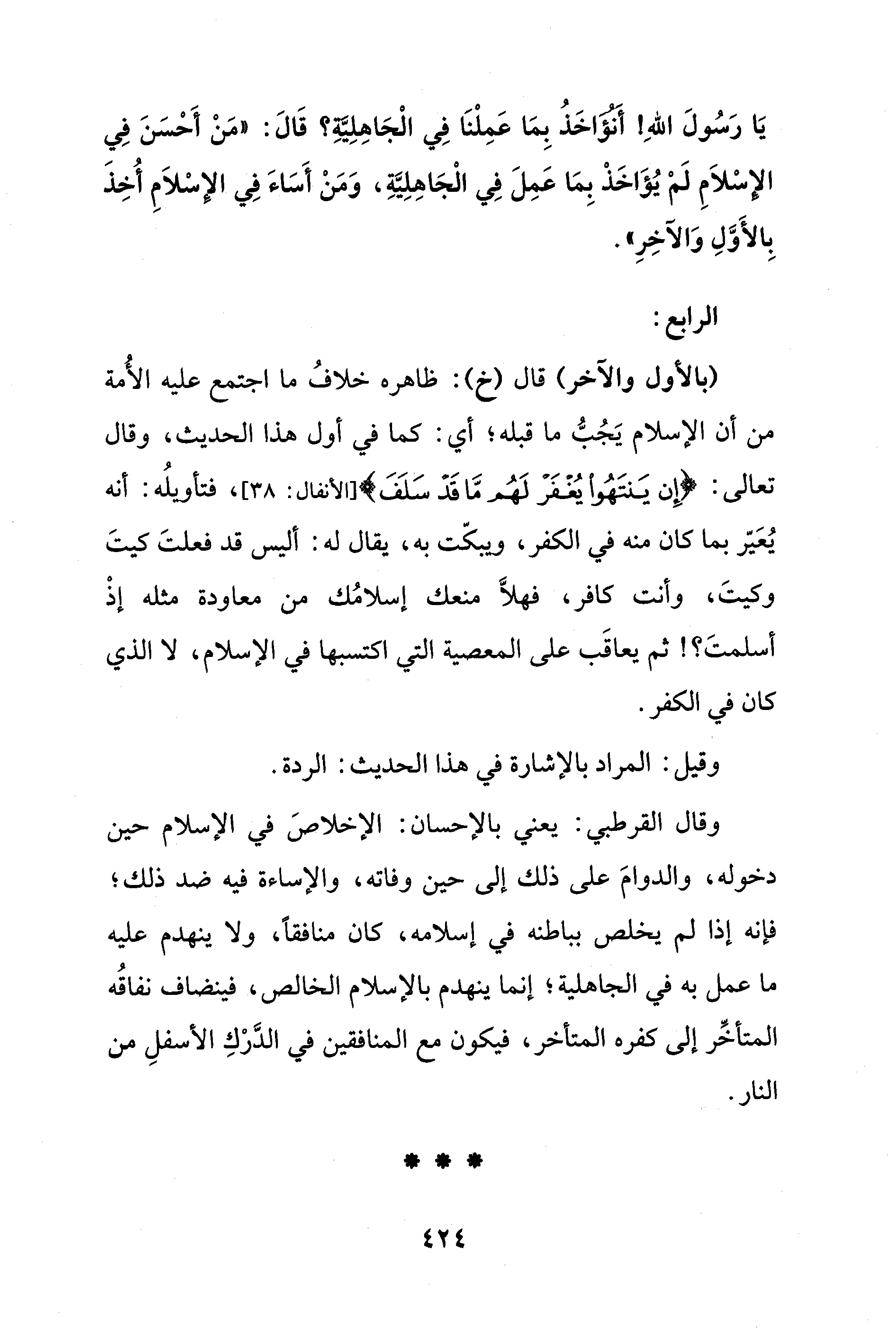وقال القرطبي: يعني بالإحسان: الإخلاصَ في الإسلام حين دخوله، والدوامَ على ذلك إلى حين وفاته، والإساءة فيه ضد ذلك؛ فإنه إذا لم يخلص بباطنه في إسلامه، كان منافقًا، ولا ينهدم عليه ما عمل به في الجاهلية؛ إنما ينهدم بالإسلام الخالص، فينضاف نفاقُه المتأخِّر إلى كفره المتأخر، فيكون مع المنافقين في الدَّرْكِ الأسفلِ من النار.