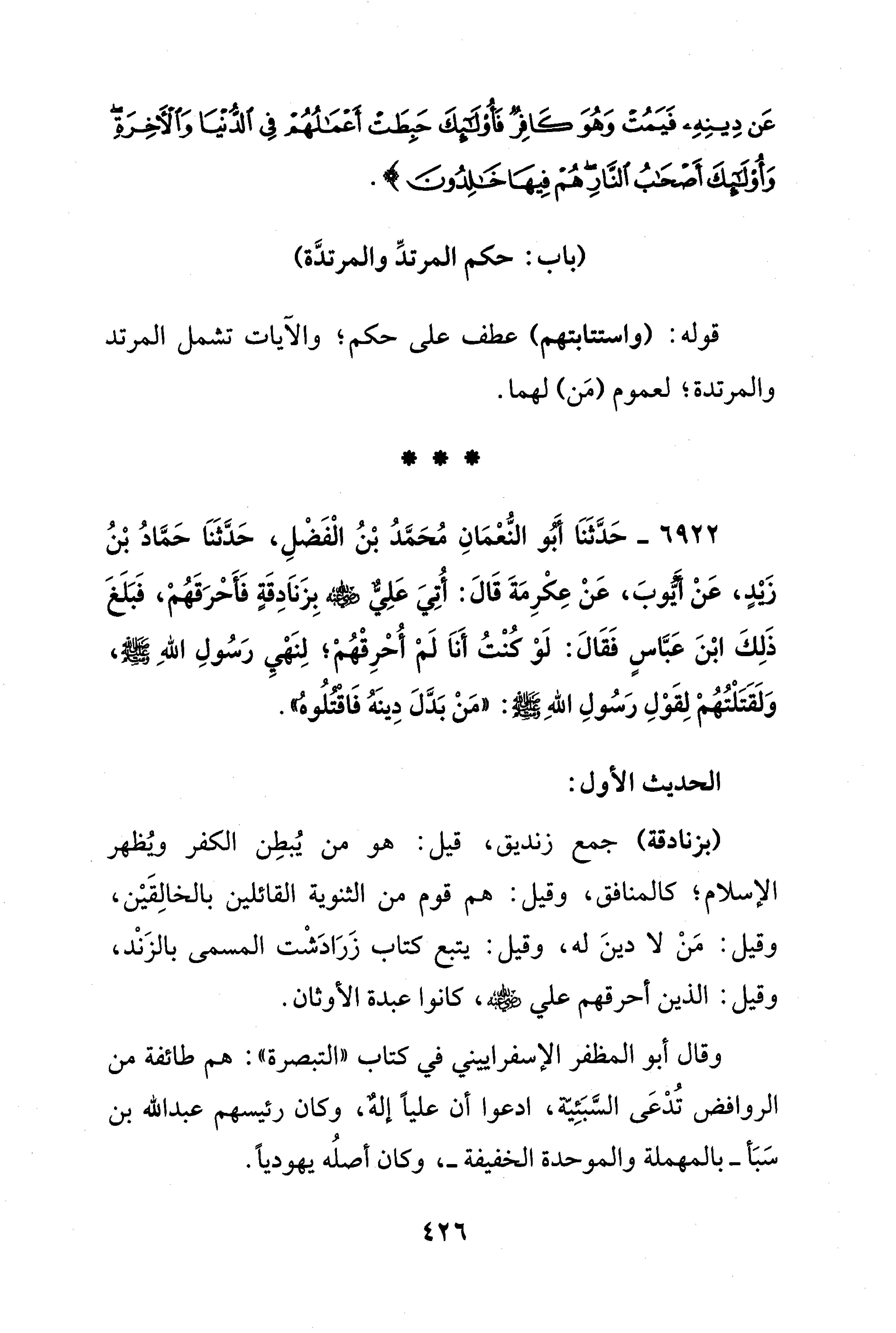6922 - حَدَّثَنَا أَبُو النُّعْمَانِ مُحَمَّدُ بْنُ الْفَضْلِ، حَدَّثَنَا حَمَّادُ بْنُ زَيْدٍ، عَنْ أَيُّوبَ، عَنْ عِكْرِمَةَ قَالَ: أُتِيَ عَلِيُّ - رضي الله عنه - بِزَنَادِقَةٍ فَأَحْرَقَهُمْ، فَبَلَغَ ذَلِكَ ابْنَ عَبَّاسٍ فَقَالَ: لَوْ كُنْتُ أَنَا لَمْ أُحْرِقْهُمْ؛ لِنَهْيِ رَسُولِ اللهِ - صلى الله عليه وسلم -، وَلَقتَلْتُهُمْ لِقَوْلِ رَسُولِ اللهِ - صلى الله عليه وسلم -: "مَنْ بَدَّلَ دِينَهُ فَاقْتُلُوه".