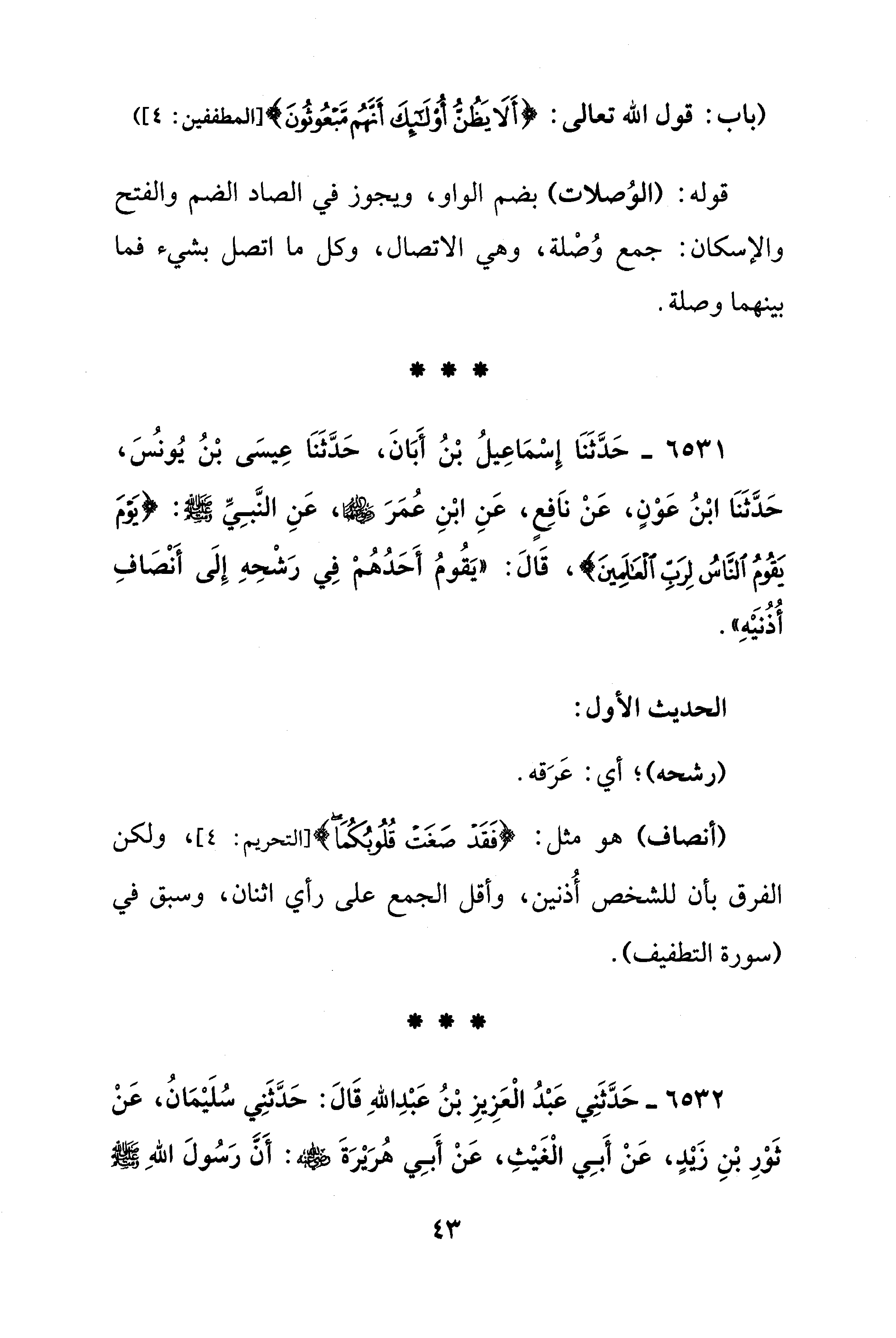 6531 - حَدَّثَنَا إِسْمَاعِيلُ بْنُ أَبَانَ، حَدَّثَنَا عِيسَى بْنُ يُونُسَ، حَدَّثَنَا ابْنُ عَوْنٍ، عَنْ ناَفِعٍ، عَنِ ابْنِ عُمَرَ - رضي الله عنهما -، عَنِ النَّبِيِّ - صلى الله عليه وسلم -: {يَوْمَ يَقُومُ النَّاسُ لِرَبِّ الْعَالَمِينَ} قَالَ: "يَقُومُ أَحَدُهُمْ فِي رَشْحِهِ إِلَى أَنْصَافِ أُذُنَيْهِ".