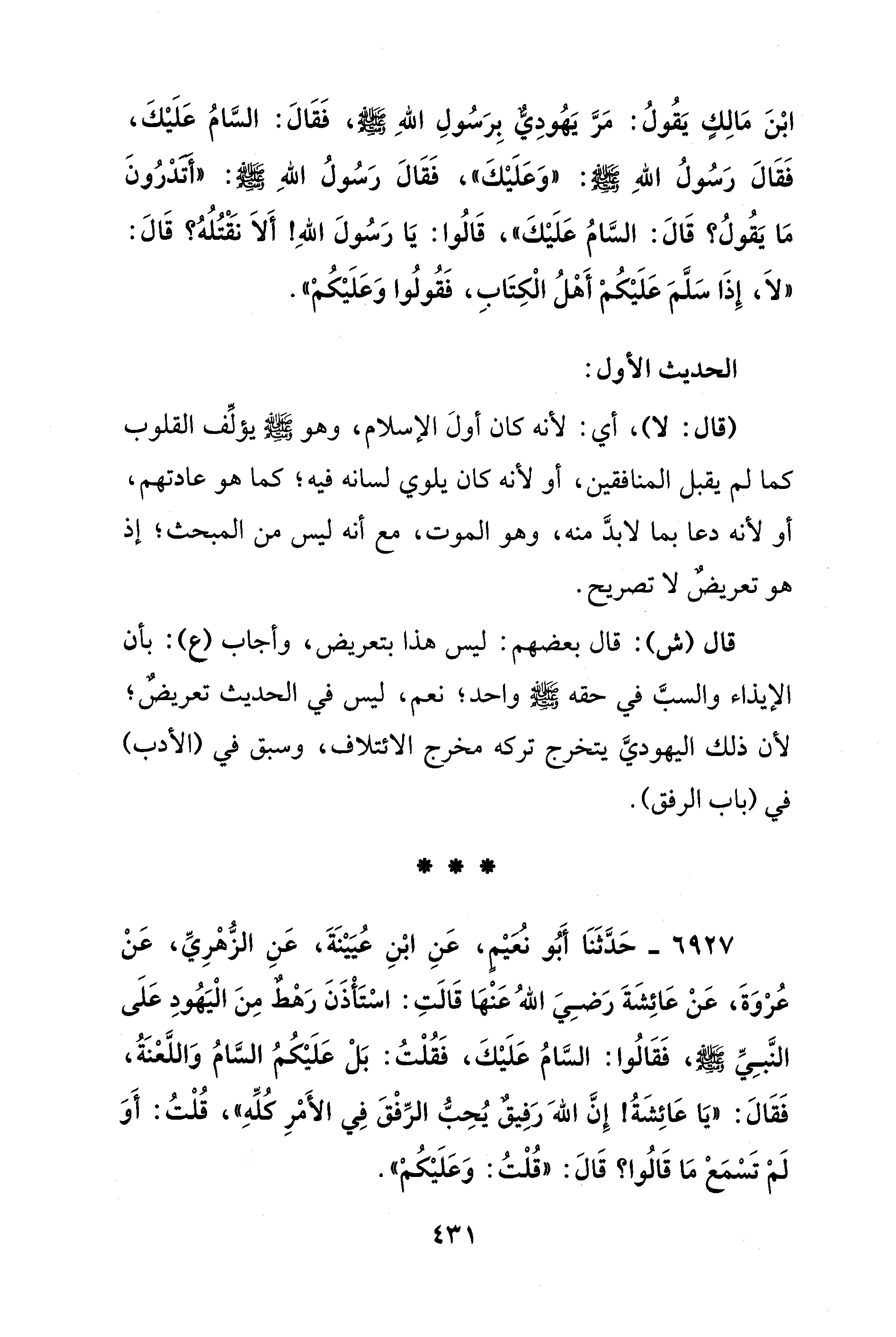 ابْنَ مَالِكٍ يَقُولُ: مَرَّ يَهُودِيٌّ بِرَسُولِ اللهِ - صلى الله عليه وسلم -، فَقَالَ: السَّامُ عَلَيْكَ، فَقَالَ رَسُولُ اللهِ - صلى الله عليه وسلم -: "وَعَلَيْكَ"، فَقَالَ رَسُولُ اللهِ - صلى الله عليه وسلم -: "أَتَدْرُونَ مَا يَقُولُ؟ قَالَ: السَّامُ عَلَيْكَ"، قَالُوا: يَا رَسُولَ اللهِ! أَلاَ نَقْتُلُهُ؟ قَالَ: "لَا، إِذَا سَلَّمَ عَلَيْكُمْ أَهْلُ الْكِتَابِ، فَقُولُوا وَعَلَيْكُمْ".