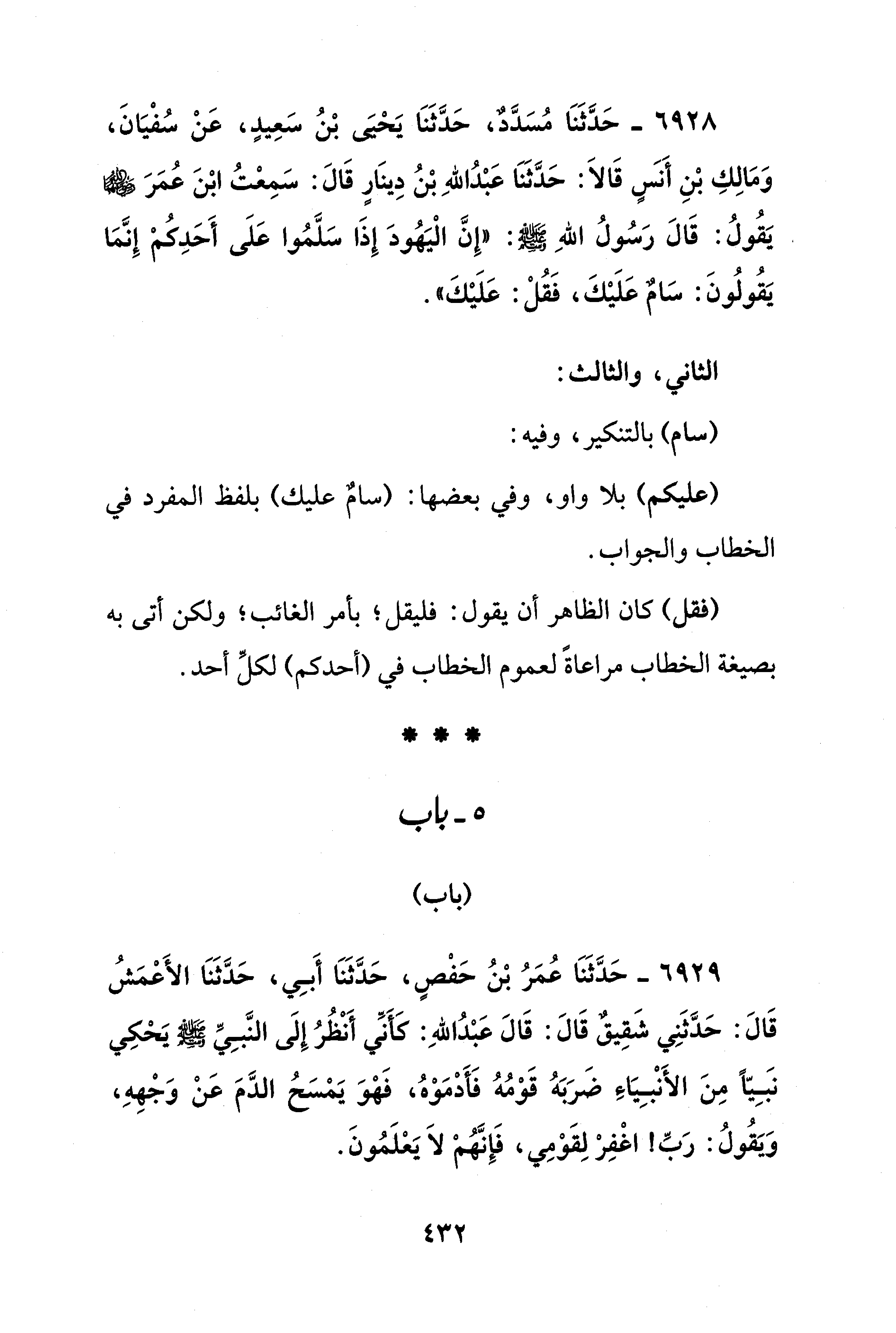 6928 - حَدَّثَنَا مُسَدَّدٌ، حَدَّثَنَا يَحْيَى بْنُ سَعِيدٍ، عَنْ سُفْيَانَ، وَمَالِكِ بْنِ أَنَسٍ قَالَا: حَدَّثَنَا عَبْدُ اللهِ بْنُ دِينَارٍ قَالَ: سَمِعْتُ ابْنَ عُمَرَ - رضي الله عنهما - يَقُولُ: قَالَ رَسُولُ اللهِ - صلى الله عليه وسلم -: "إِنَّ الْيَهُودَ إِذَا سَلَّمُوا عَلَى أَحَدِكُمْ إِنَّمَا يَقُولُونَ: سَامٌ عَلَيْكَ، فَقُلْ: عَلَيْكَ".