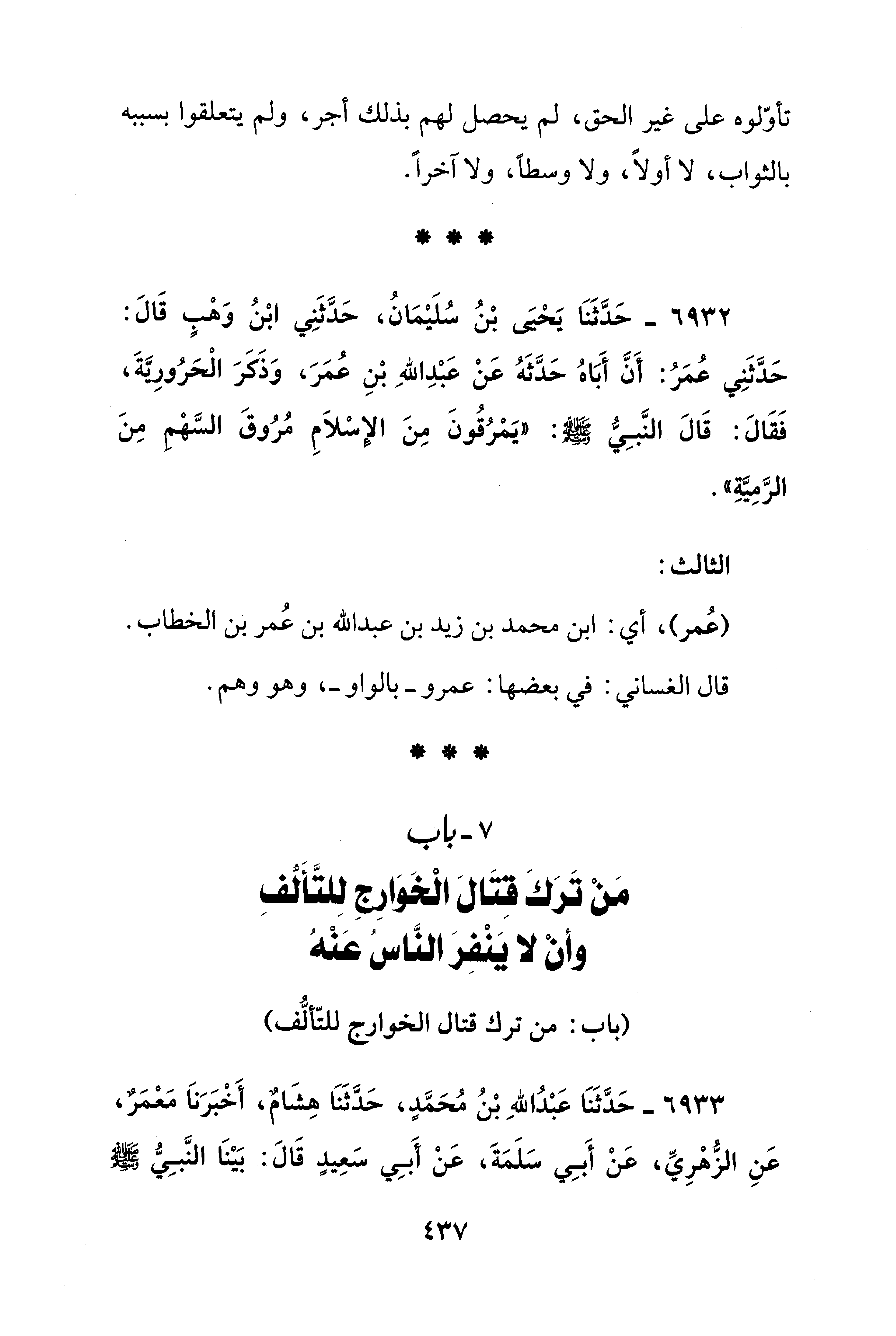 7 - باب مَنْ تَرَكَ قِتَالَ الْخَوَارِج لِلتَّأَلُّفِ وأنْ لا يَنْفِرَ النَّاسُ عَنْهُ