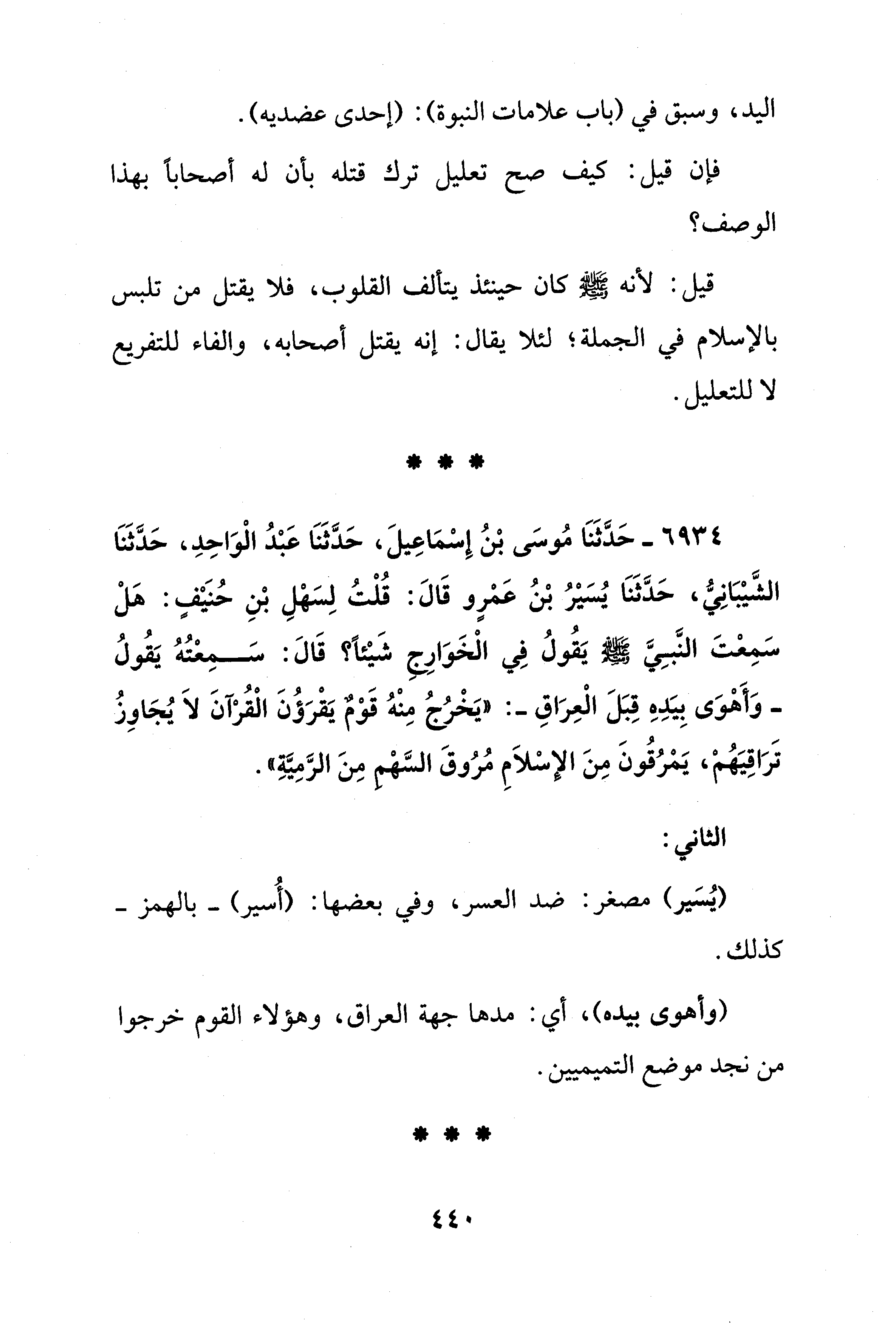 6934 - حَدَّثَنَا مُوسَى بْنُ إِسْمَاعِيلَ، حَدَّثَنَا عَبْدُ الْوَاحِدِ، حَدَّثَنَا الشَّيْبَانِيُّ، حَدَّثَنَا يُسَيْرُ بْنُ عَمْرٍو قَالَ: قُلْتُ لِسَهْلِ بْنِ حُنَيْفٍ: هَلْ سَمِعْتَ النَّبِيَّ - صلى الله عليه وسلم - يَقُولُ فِي الْخَوَارِجِ شَيْئًا؟ قَالَ: سَمِعْتُهُ يَقُولُ -وَأَهْوَى بِيَدِهِ قِبَلَ الْعِرَاقِ-: "يَخْرُجُ مِنْهُ قَوْمٌ يَقْرَؤُنَ الْقُرْآنَ لَا يُجَاوِزُ تَرَاقِيَهُمْ، يَمْرُقُونَ مِنَ الإسْلاَمِ مُرُوقَ السَّهْم مِنَ الرَّمِيَّةِ".