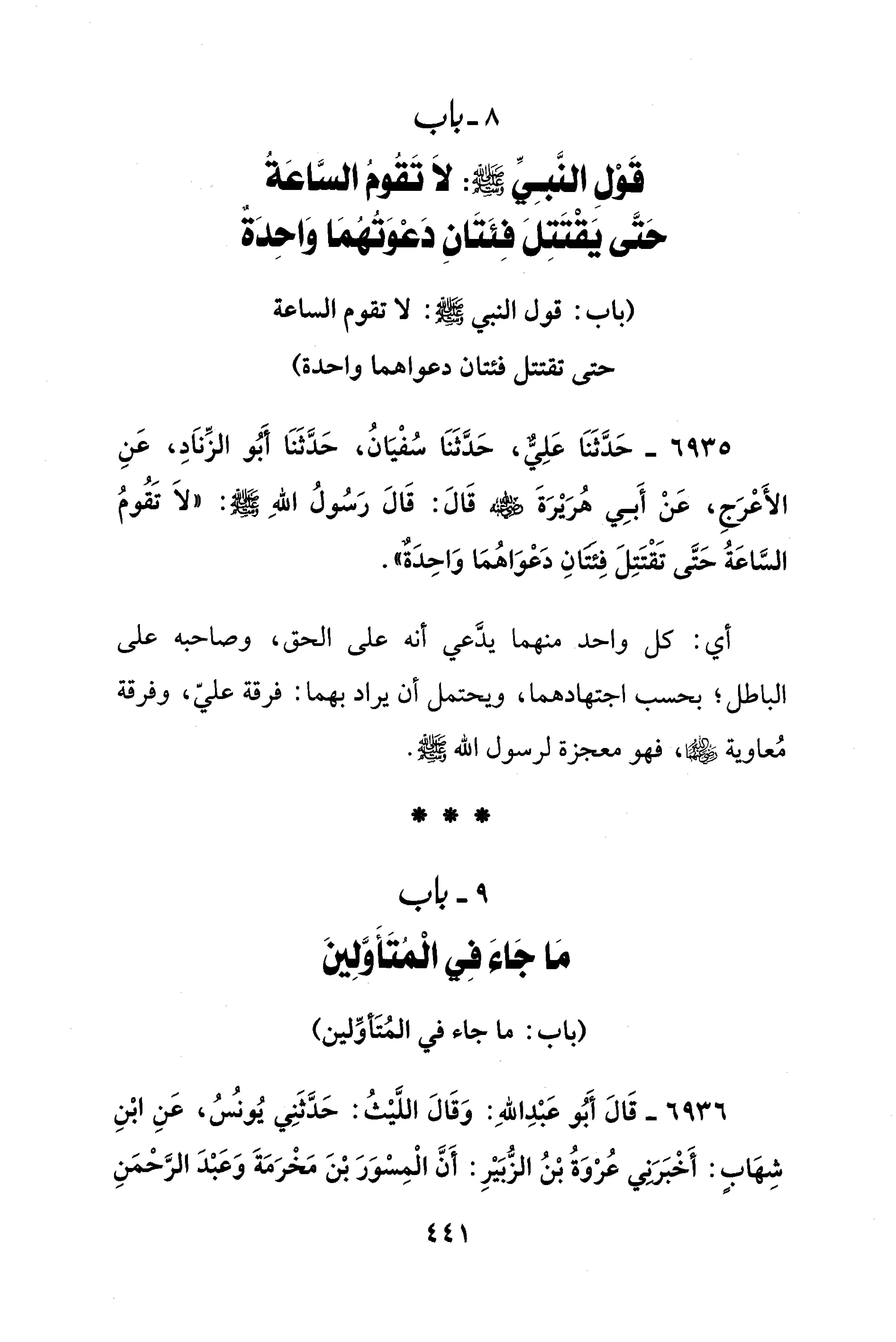 8 - باب قَوْلِ النَّبِيِّ - صلى الله عليه وسلم -: لَا تَقُومُ السَّاعَةُ حَتَّى يَقْتَتِلَ فِئَتَانِ دَعْوَتُهُمَا وَاحِدَةٌ