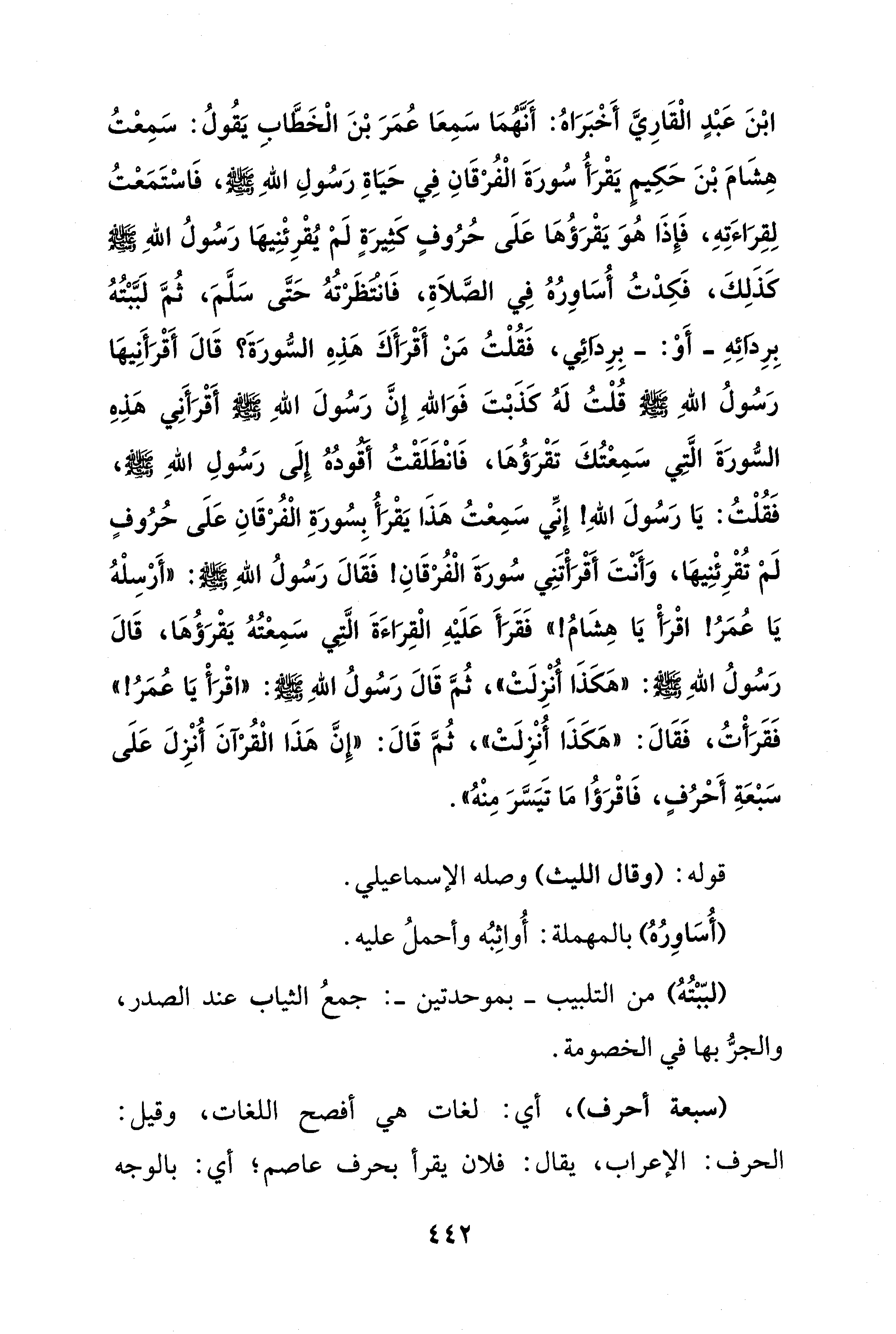 ابْنَ عَبْدٍ الْقَارِيَّ أَخْبَرَاهُ: أَنَّهُمَا سَمِعَا عُمَرَ بْنَ الْخَطَّابِ يَقُولُ: سَمِعْتُ هِشَامَ بْنَ حَكِيمٍ يَقْرَأُ سُورَةَ الْفُرْقَانِ فِي حَيَاةِ رَسُولِ اللهِ - صلى الله عليه وسلم -، فَاسْتَمَعْتُ لِقِرَاءَتِهِ، فَإِذَا هُوَ يَقْرَؤُهَا عَلَى حُرُوفٍ كَثِيرَةٍ لَمْ يُقْرِئْنِيهَا رَسُولُ اللهِ - صلى الله عليه وسلم - كَذَلِكَ، فَكِدْتُ أُسَاوِرُهُ فِي الصَّلاَةِ، فَانتظَرْتُهُ حَتَّى سَلَّمَ، ثُمَّ لَبَّبْتُهُ بِرِدَائِهِ -أَوْ:- بِرِدَائِي، فَقُلْتُ مَنْ أَقْرَأَكَ هَذِهِ السُّورَةَ؟ قَالَ أَقْرَأَنِيهَا رَسُولُ اللهِ - صلى الله عليه وسلم - قُلْتُ لَهُ كَذَبْتَ فَوَاللهِ إِنَّ رَسُولَ اللهِ - صلى الله عليه وسلم - أَقْرَأَنِي هَذِهِ السُّورَةَ الَّتِي سَمِعْتُكَ تَقْرَؤُهَا، فَانْطَلَقْتُ أقودُهُ إِلَى رَسُولِ اللهِ - صلى الله عليه وسلم -، فَقُلْتُ: يَا رَسُولَ اللهِ! إِنِّي سَمِعْتُ هَذَا يَقْرَأُ بِسُورَةِ الْفُرْقَانِ عَلَى حُرُوفٍ لَمْ تُقْرِئْنِيهَا، وَأَنْتَ أَقْرَأْتَنِي سُورَةَ الْفُرْقَانِ! فَقَالَ رَسُولُ اللهِ - صلى الله عليه وسلم -: "أَرْسِلْهُ يَا عُمَرُ! اقْرَأْ يَا هِشَامُ! " فَقَرَأَ عَلَيْهِ الْقِرَاءَةَ الَّتِي سَمِعْتُهُ يَقْرَؤُهَا، قَالَ رَسُولُ اللهِ - صلى الله عليه وسلم -: "هَكَذَا أُنْزِلَتْ"، ثُمَّ قَالَ رَسُولُ اللهِ - صلى الله عليه وسلم -: "اقْرَأْ يَا عُمَرُ! " فَقَرَأْتُ، فَقَالَ: "هَكَذَا أُنْزِلَتْ"، ثُمَّ قَالَ: "إِنَّ هَذَا الْقُرْآنَ أُنْزِلَ عَلَى سَبْعَةِ أَحْرُفٍ، فَاقْرَؤُا مَا تَيَسَّرَ مِنْهُ".