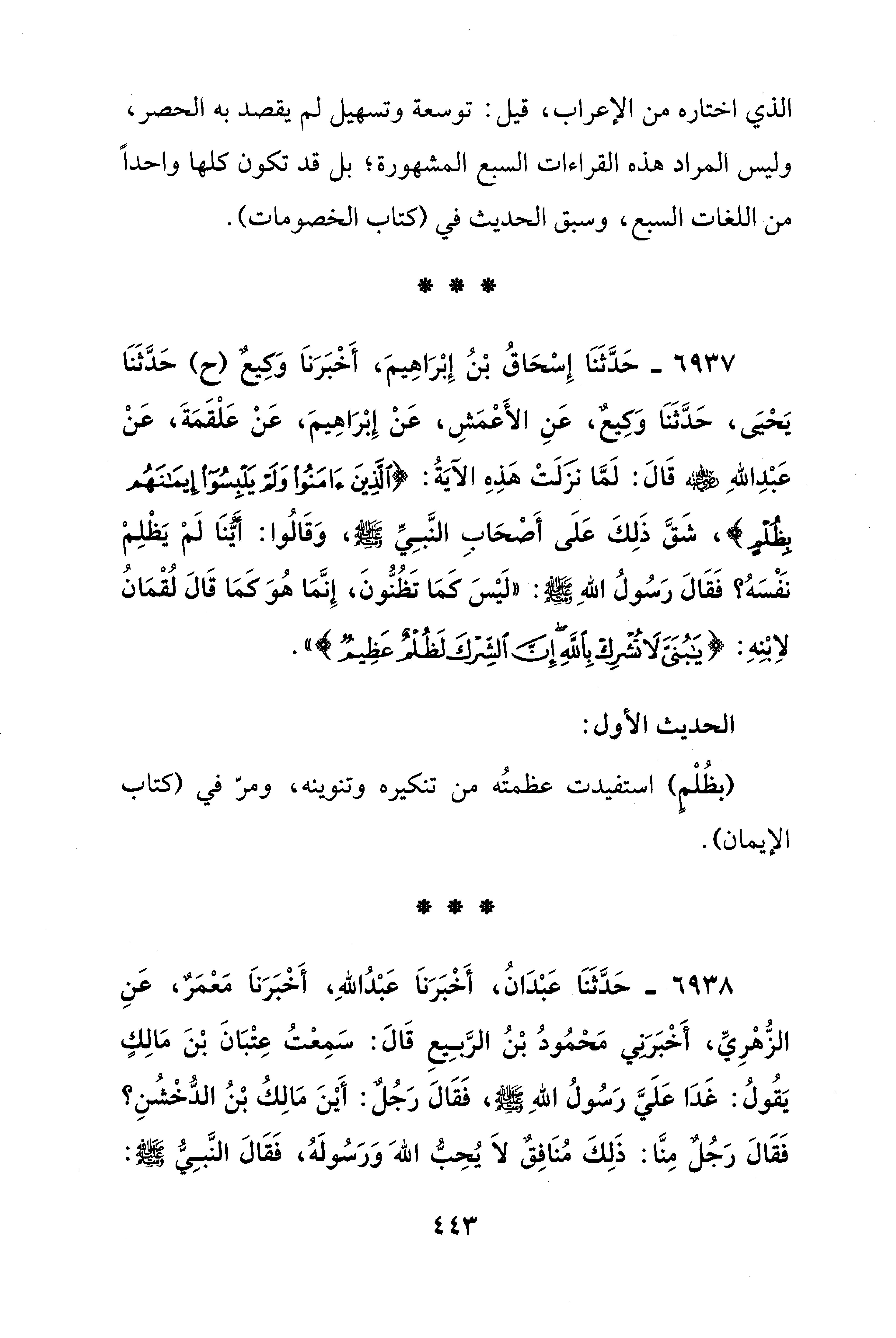 6937 - حَدَّثَنَا إِسْحَاقُ بْنُ إِبْرَاهِيمَ، أَخْبَرَنَا وَكِيعٌ (ح) حَدَّثَنَا يَحْيَى، حَدَّثَنَا وَكِيعٌ، عَنِ الأَعْمَشِ، عَنْ إِبْرَاهِيمَ، عَنْ عَلْقَمَةَ، عَنْ عَبْدِ اللهِ - رضي الله عنه - قَالَ: لَمَّا نزَلَتْ هَذ الآيَةُ: {الَّذِينَ آمَنُوا وَلَمْ يَلْبِسُوا إِيمَانَهُمْ بِظُلْمٍ}، شَقَّ ذَلِكَ عَلَى أَصْحَابِ النَّبِيِّ - صلى الله عليه وسلم -، وَقَالُوا: أَيُّنَا لَمْ يَظْلِمْ نَفْسَهُ؟ فَقَالَ رَسُولُ اللهِ - صلى الله عليه وسلم -: "لَيْسَ كَمَا تَظُنُّونَ، إِنَّمَا هُوَ كَمَا قَالَ لُقْمَانُ لاِبْنِهِ: {يَابُنَيَّ لَا تُشْرِكْ بِاللَّهِ إِنَّ الشِّرْكَ لَظُلْمٌ عَظِيمٌ} ".