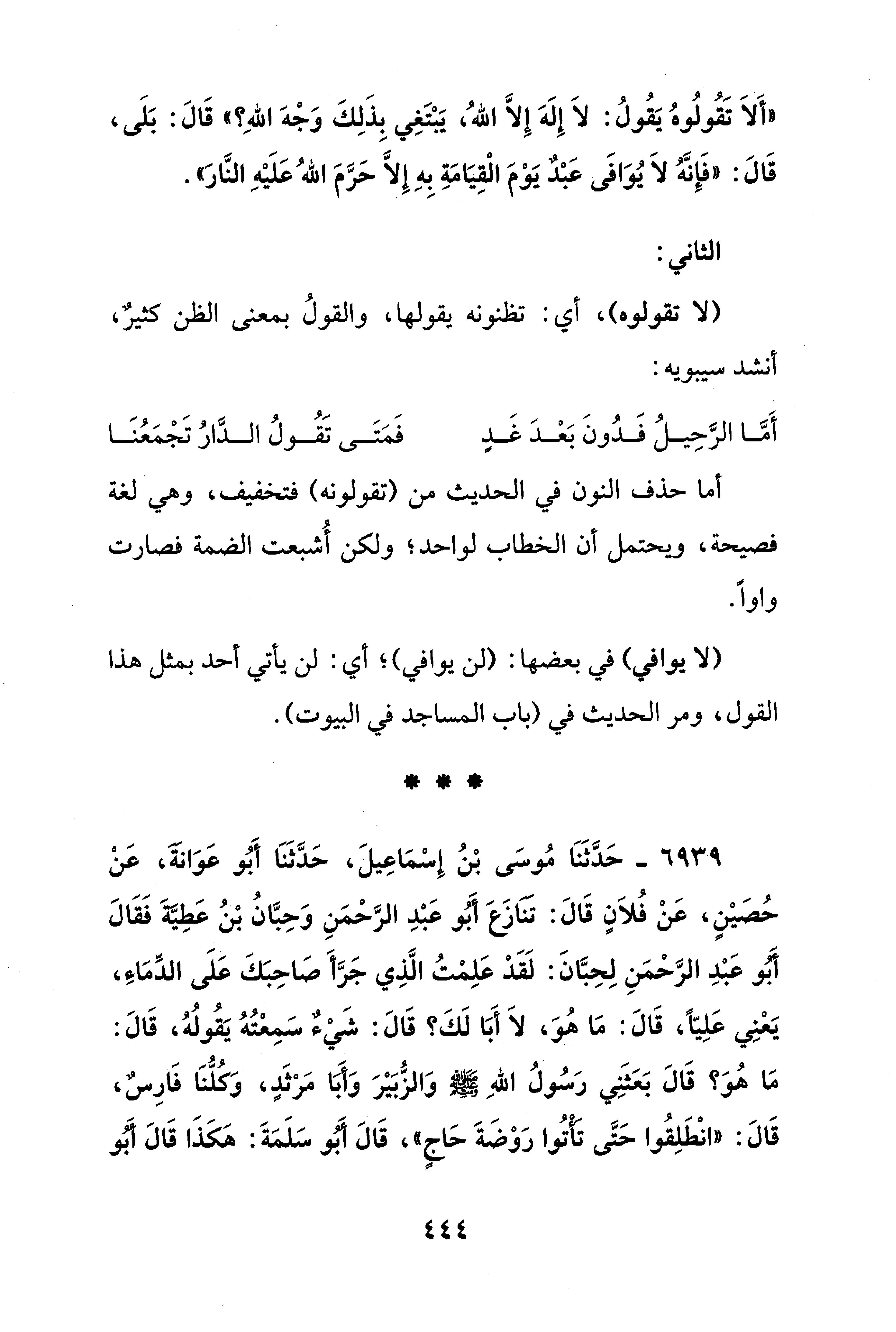 "أَلاَ تَقُولُوهُ يَقُولُ: لَا إِلَهَ إلا اللهُ، يَبْتَغِي بِذَلِكَ وَجْهَ اللهِ؟ " قَالَ: بَلَى، قَالَ: "فَإِنَّهُ لَا يُوَافَى عَبْدٌ يَوْمَ الْقِيَامَةِ بِهِ إلا حَرَّمَ اللهُ عَلَيْهِ النَّارَ".