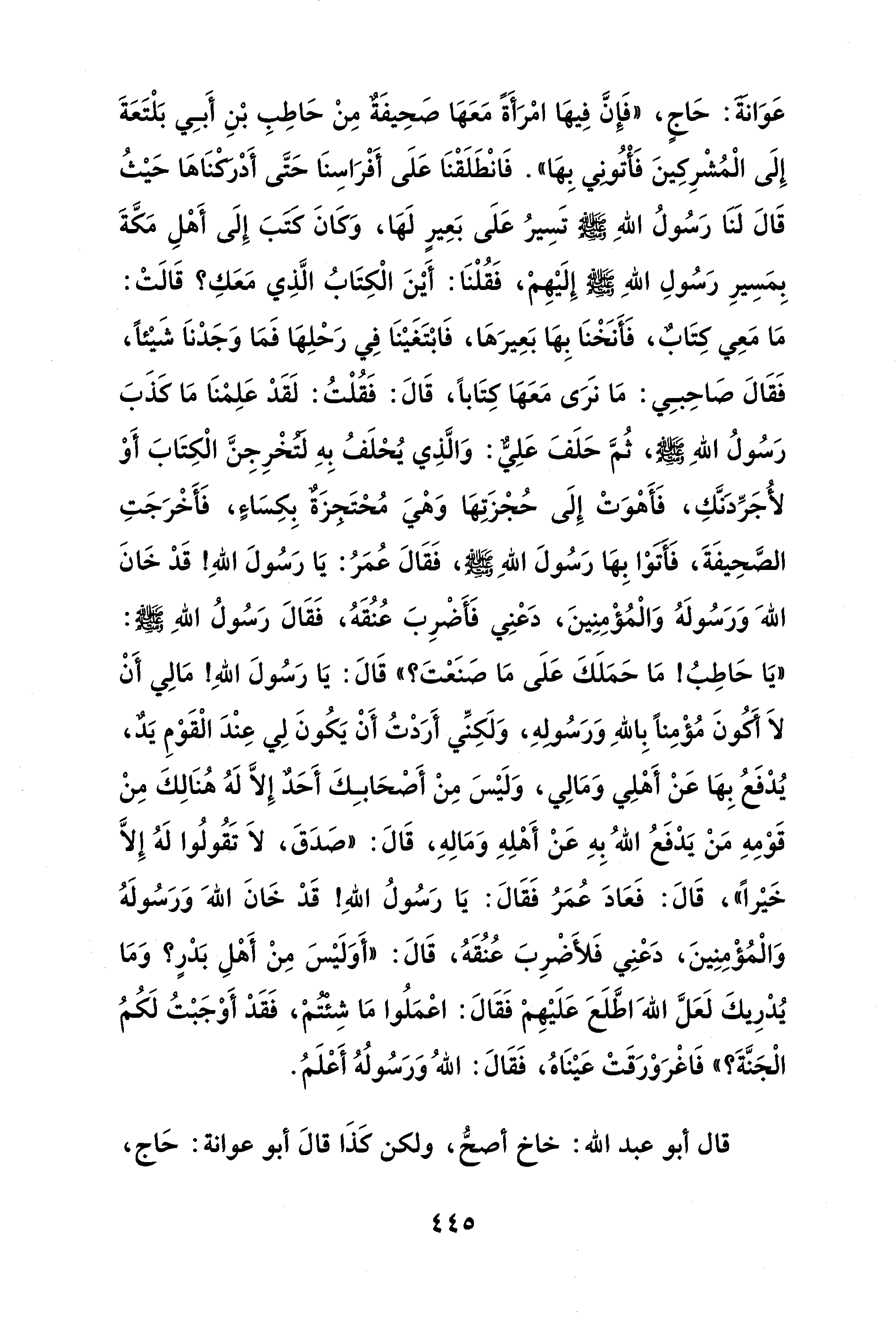 عَوَانة: حَاجٍ، "فَإِنَّ فِيهَا امْرَأَةً مَعَهَا صَحِيفَةٌ مِنْ حَاطِبِ بْنِ أَبِي بَلْتَعَةَ إِلَى الْمُشْرِكينَ فَأْتُونِي بِهَا". فَانْطَلَقْنَا عَلَى أَفْرَاسِنَا حَتَّى أَدْركْنَاهَا حَيْثُ قَالَ لَنَا رَسُولُ اللهِ - صلى الله عليه وسلم - تَسِيرُ عَلَى بَعِيرٍ لَهَا، وَكَانَ كتَبَ إِلَى أَهْلِ مَكَّةَ بِمَسِيرِ رَسُولِ اللهِ - صلى الله عليه وسلم - إِلَيْهِمْ، فَقُلْنَا: أَيْنَ الْكِتَابُ الَّذِي مَعَكِ؟ قَالَتْ: مَا مَعِي كِتَابٌ، فَأَنَخْنَا بِهَا بَعِيرَهَا، فَابْتَغَيْنَا فِي رَحْلِهَا فَمَا وَجَدْناَ شَيْئًا، فَقَالَ صَاحِبِي: مَا نَرَى مَعَهَا كِتَابًا، قَالَ: فَقُلْتُ: لَقَدْ عَلِمْنَا مَا كَذَبَ رَسُولُ اللهِ - صلى الله عليه وسلم -، ثُمَّ حَلَفَ عَلِيٌّ: وَالَّذِي يُحْلَفُ بِهِ لَتُخْرِجِنَّ الْكِتَابَ أَوْ لأُجَرِّدَنَّكِ، فَأَهْوَتْ إِلَى حُجْزَتِهَا وَهْيَ مُحْتَجزَةٌ بِكِسَاءٍ، فَأَخْرَجَتِ الصَّحِيفَةَ، فَأَتَوْا بِهَا رَسُولَ اللهِ - صلى الله عليه وسلم -، فَقَالَ عُمَرُ: يَا رَسُولَ اللهِ! قَدْ خَانَ اللهَ وَرَسُولَهُ وَالْمُؤْمِنِينَ، دَعْنِي فَأَضْرِبَ عُنُقَهُ، فَقَالَ رَسُولُ اللهِ - صلى الله عليه وسلم -: "يَا حَاطِبُ! مَا حَمَلَكَ عَلَى مَا صَنَعْتَ؟ " قَالَ: يَا رَسُولَ اللهِ! مَا لِي أَنْ لَا أَكُونَ مُؤْمِنًا بِاللهِ وَرَسُولِهِ، وَلَكِنِّي أَرَدْتُ أَنْ يَكُونَ لِي عِنْدَ الْقَوْمِ يَدٌ، يُدْفَعُ بِهَا عَنْ أَهْلِي وَمَالِي، وَلَيْسَ مِنْ أَصْحَابِكَ أَحَدٌ إلا لَهُ هُنَالِكَ مِنْ قَوْمِهِ مَنْ يَدْفَعُ اللهُ بِهِ عَنْ أَهْلِهِ وَمَالِهِ، قَالَ: "صَدَقَ، لَا تَقُولُوا لَهُ إلا خَيْرًا"، قَالَ: فَعَادَ عُمَرُ فَقَالَ: يَا رَسُولُ اللهِ! قَدْ خَانَ اللهَ وَرَسُولَهُ وَالْمُؤْمِنِينَ، دَعْنِي فَلأَضْرِبَ عُنُقَهُ، قَالَ: "أَوَلَيْسَ مِنْ أَهْلِ بَدْرٍ؟ وَمَا يُدْرِيكَ لَعَلَّ اللهَ اطَّلَعَ عَلَيْهِمْ فَقَالَ: اعْمَلُوا مَا شِئْتُمْ، فَقَدْ أَوْجَبْتُ لَكُمُ الْجَنَّةَ؟ " فَاغْرَوْرَقَتْ عَيْنَاهُ، فَقَالَ: اللهُ وَرَسُولُهُ أَعْلَمُ.