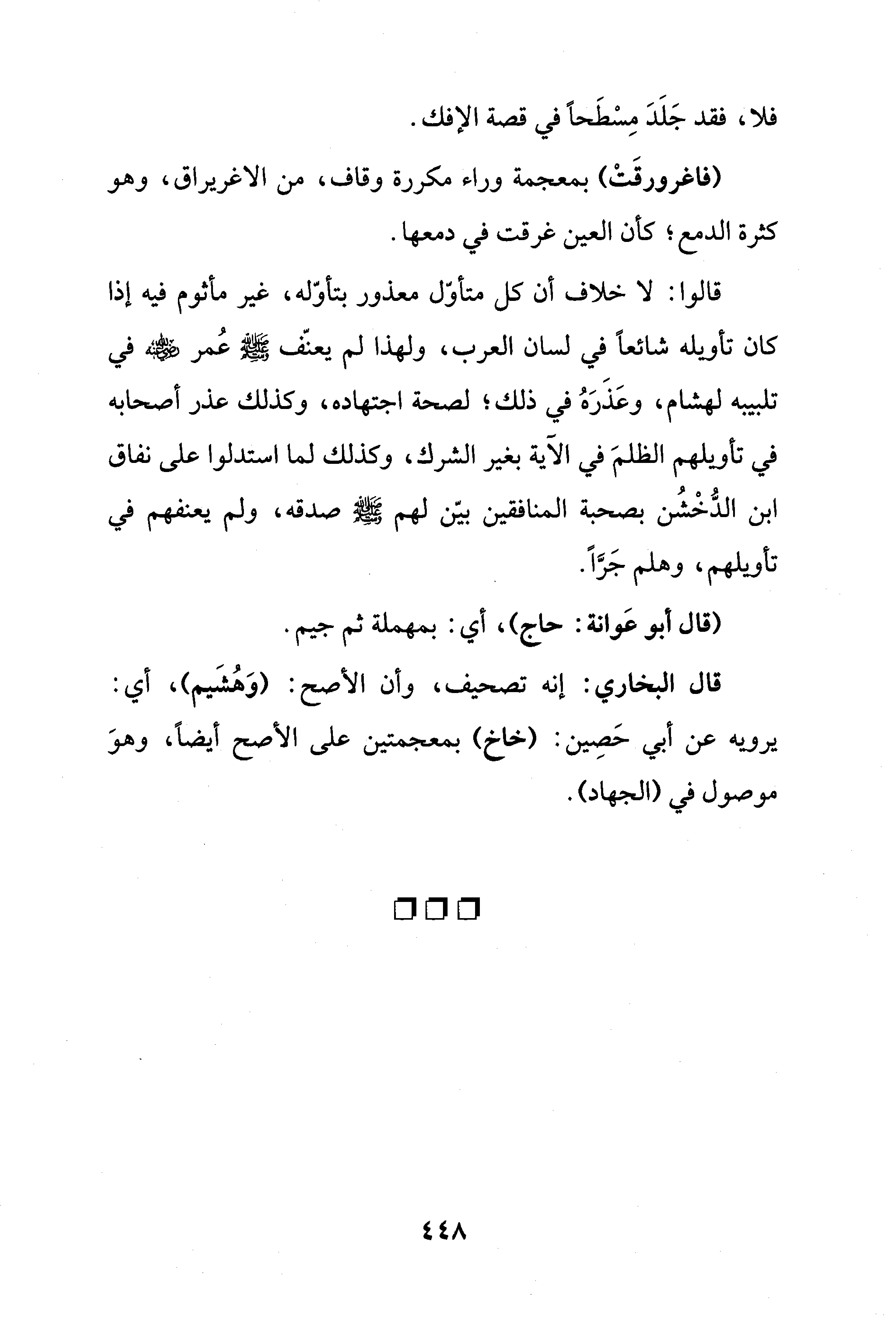 قالوا: لا خلاف أن كل متأوّل معذور بتأوّله، غير مأثوم فيه إذا كان تأويله شائعًا في لسان العرب، ولهذا لم يعنّف - صلى الله عليه وسلم - عُمر - رضي الله عنه - في تلبيبه لهشام، وعَذَرَهُ في ذلك؛ لصحة اجتهاده، وكذلك عذر أصحابه في تأويلهم الظلمَ في الآية بغير الشرك، وكذلك لما استدلوا على نفاق ابن الدُّخْشُن بصحبة المنافقين بيّن لهم - صلى الله عليه وسلم - صدقه، ولم يعنفهم في تأويلهم، وهلم جَرًّا.