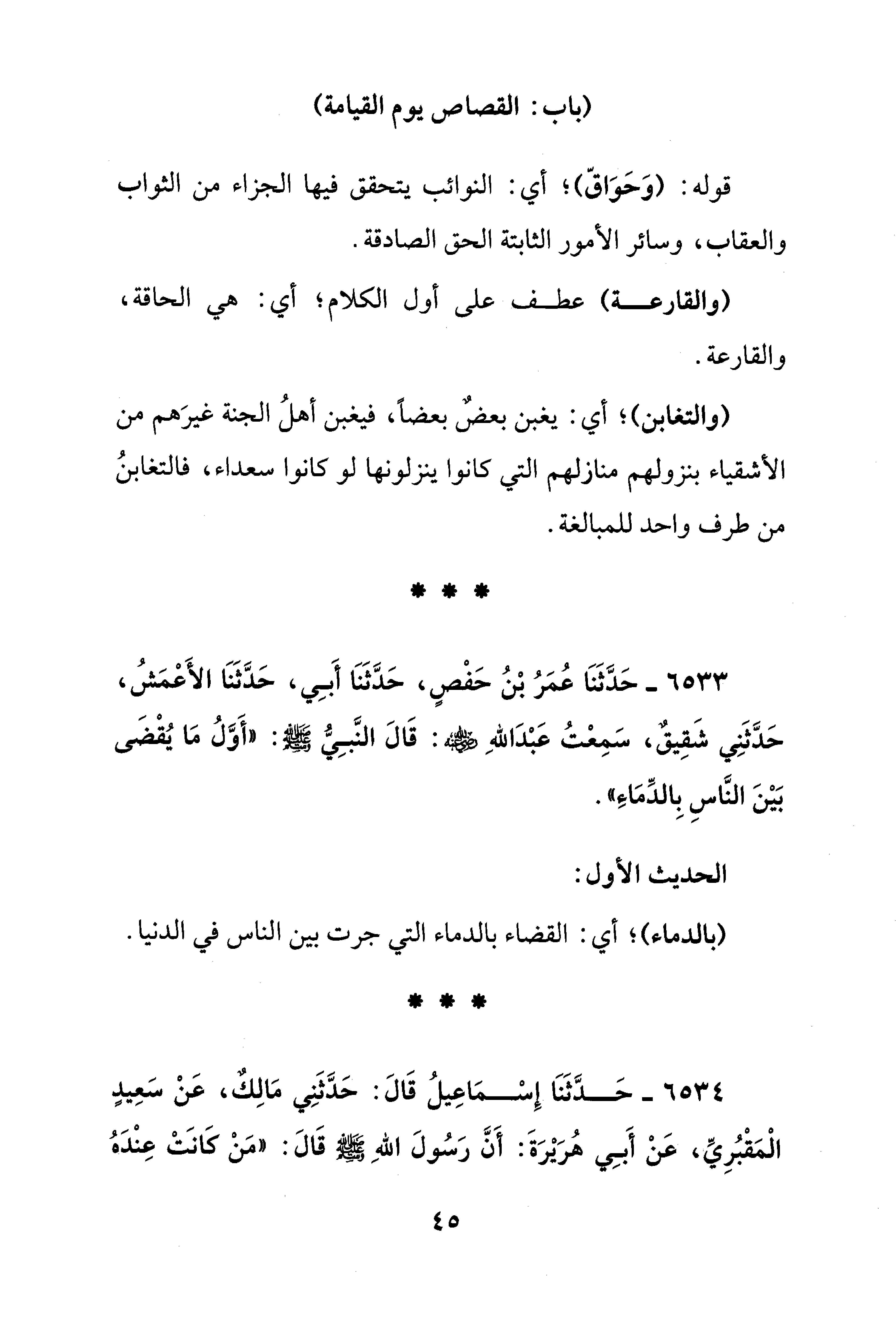 6533 - حَدَّثَنَا عُمَرُ بْنُ حَفْصٍ، حَدَّثَنَا أَبِي، حَدَّثَنَا الأَعْمَشُ، حَدَّثَنِي شَقِيقٌ، سَمِعْتُ عَبْدَ اللهِ - رضي الله عنه -: قَالَ النَّبِيُّ - صلى الله عليه وسلم -: "أَوَّلُ مَا يُقْضَى بَيْنَ النَّاسِ بِالدِّمَاءِ".