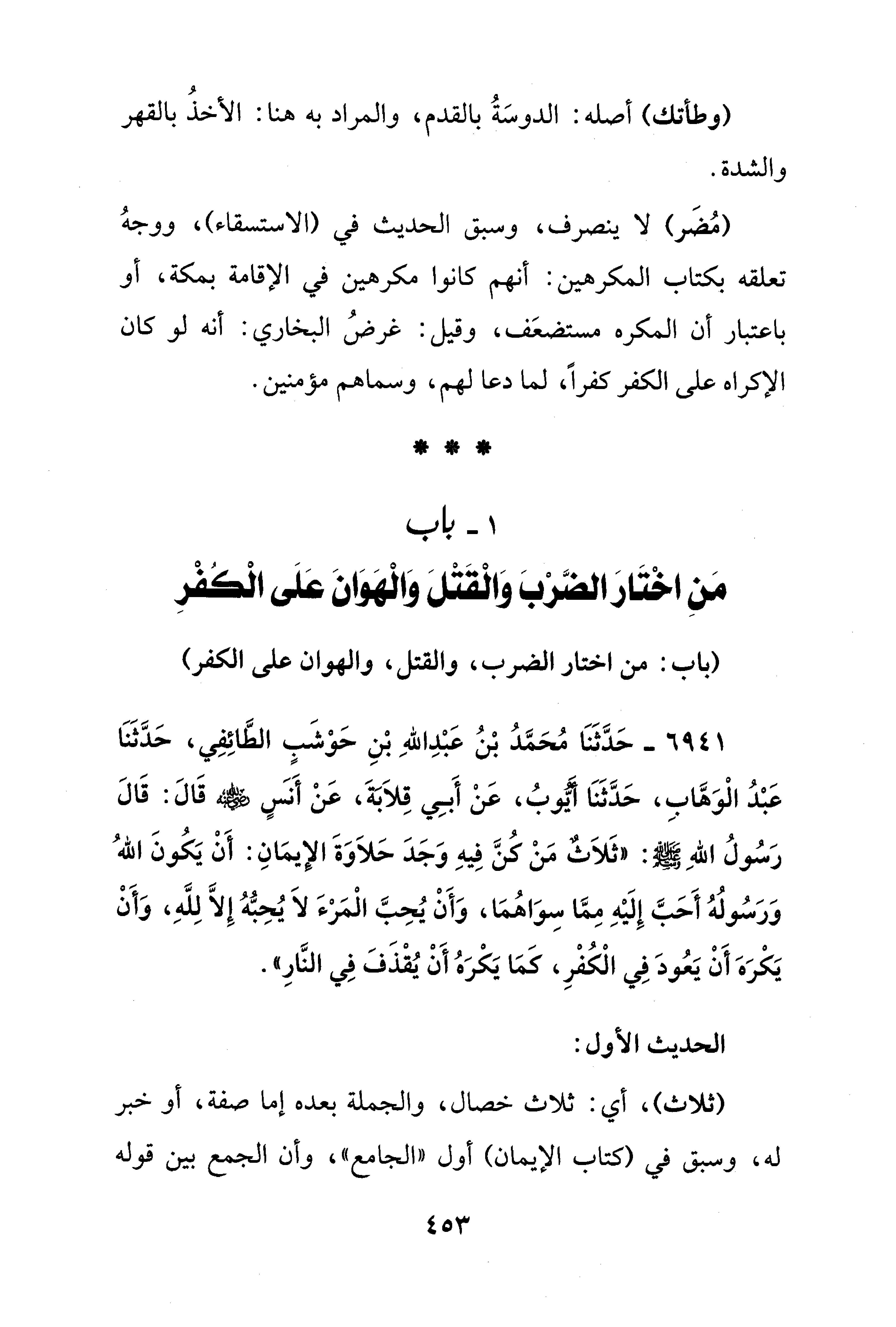 6941 - حَدَّثَنَا مُحَمَّدُ بْنُ عَبْدِ اللهِ بْنِ حَوْشَبٍ الطَّائِفِي، حَدَّثَنَا عَبْدُ الْوَهَّابِ، حَدَّثَنَا أَيُّوبُ، عَنْ أَبِي قِلاَبَةَ، عَنْ أَنسٍ - رضي الله عنه - قَالَ: قَالَ رَسُولُ اللهِ - صلى الله عليه وسلم -: "ثَلاَثٌ مَنْ كُنَّ فِيهِ وَجَدَ حَلاَوَةَ الإِيمَانِ: أَنْ يَكُونَ اللهُ وَرَسُولُهُ أَحَبَّ إِلَيْهِ مِمَّا سِوَاهمَا، وَأَنْ يُحِبَّ الْمَرْءَ لَا يُحِبُّهُ إلا لِلَّهِ، وَأَنْ يَكْرَهَ أَنْ يَعُودَ فِي الْكُفْرِ، كَمَا يَكْرَهُ أَنْ يُقْذَفَ فِي النَّارِ".