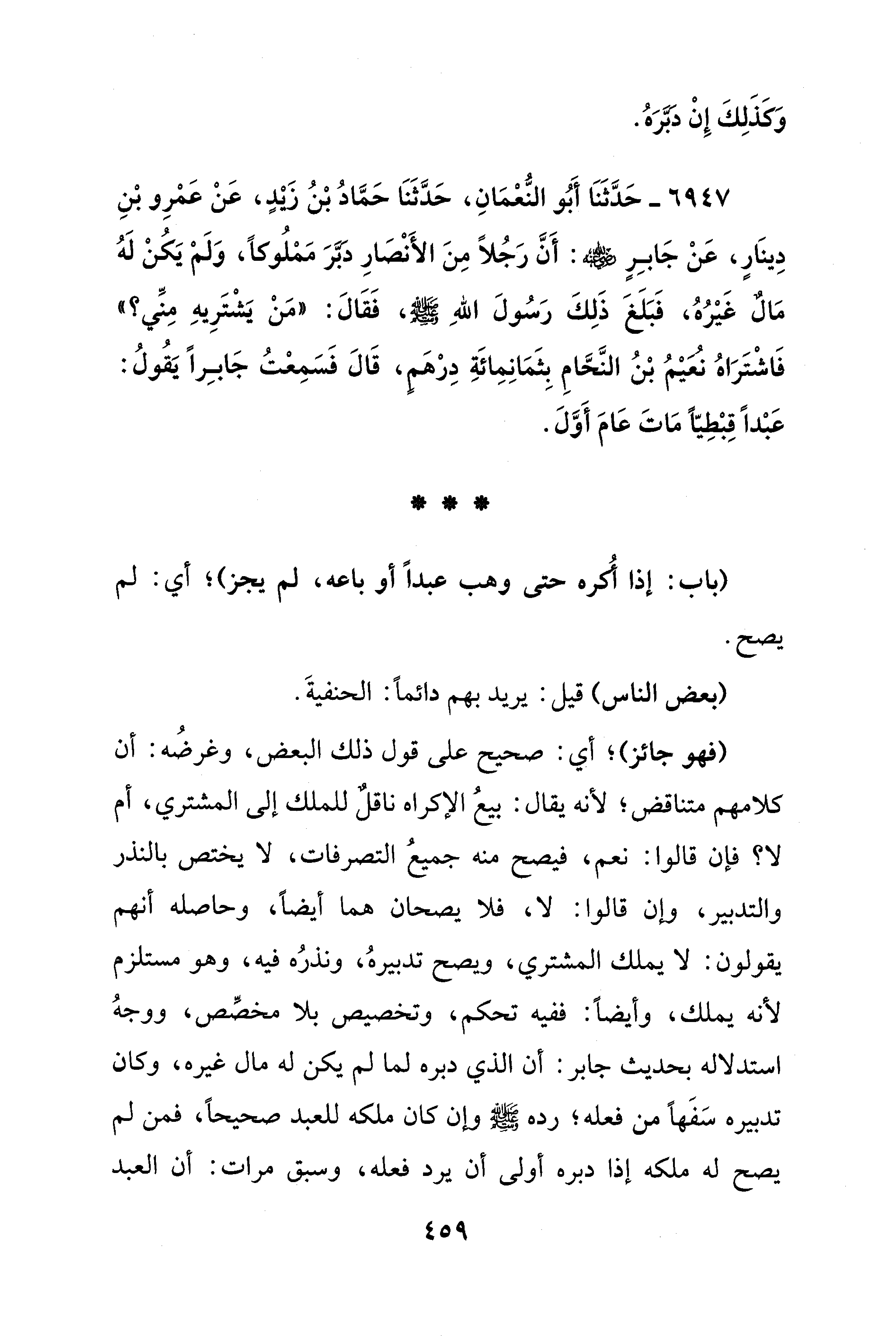 (فهو جائز)؛ أي: صحيح على قول ذلك البعض، وغرضُه: أن كلامهم متناقض؛ لأنه يقال: بيعُ الإكراه ناقلٌ للملك إلى المشتري، أم لا؟ فإن قالوا: نعم، فيصح منه جميعُ التصرفات، لا يختص بالنذر والتدبير، وإن قالوا: لا، فلا يصحان هما أيضًا، وحاصله أنهم يقولون: لا يملك المشتري، ويصح تدبيرهُ، ونذرُه فيه، وهو مستلزم لأنه يملك، وأيضًا: ففيه تحكم، وتخصيص بلا مخصِّص، ووجهُ استدلاله بحديث جابر: أن الذي دبره لما لم يكن له مال غيره، وكان تدبيره سَفَهًا من فعله؛ رده - صلى الله عليه وسلم - وإن كان ملكه للعبد صحيحًا، فمن لم يصح له ملكه إذا دبره أولى أن يرد فعله، وسبق مرات: أن العبد