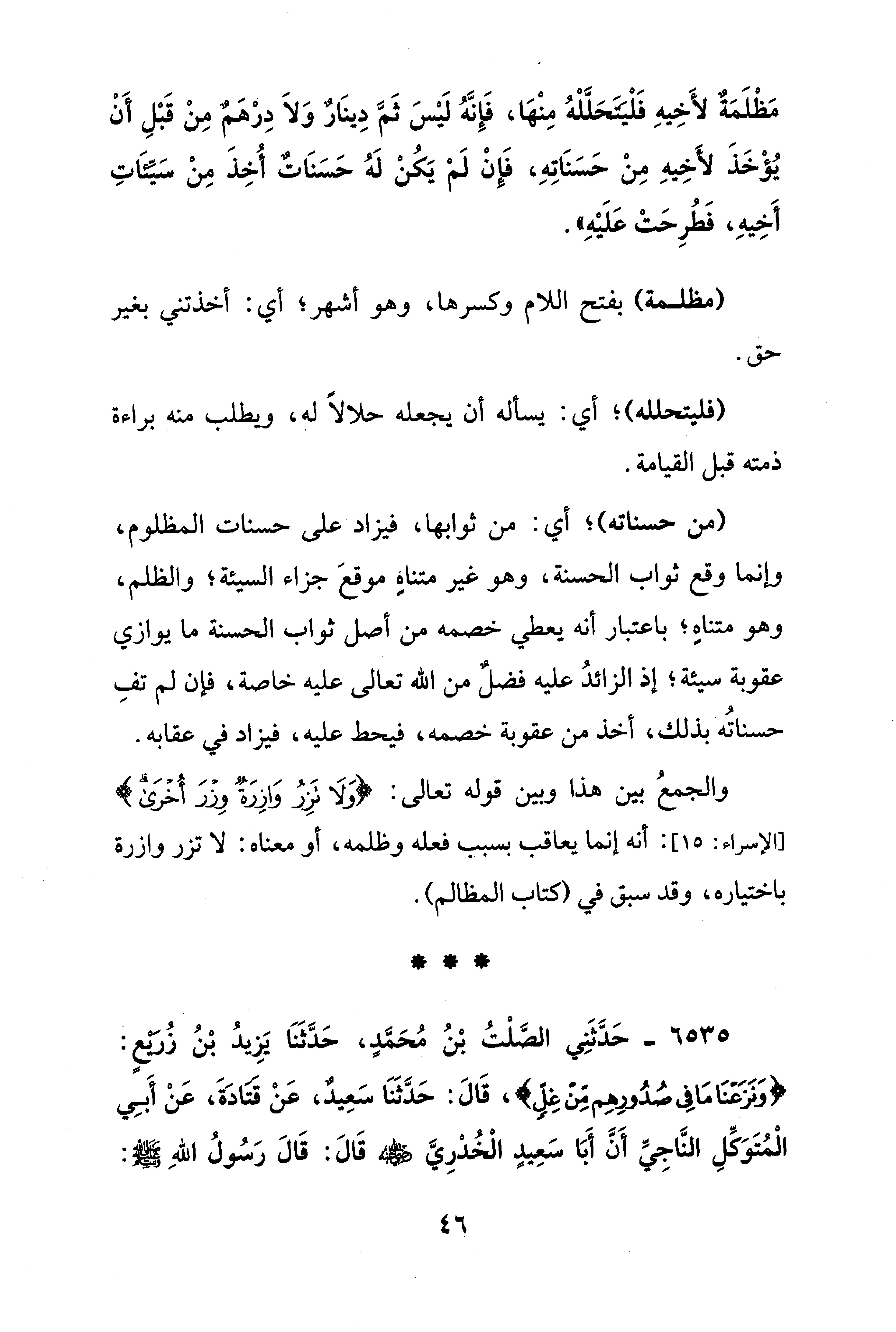 6535 - حَدَّثَنِي الصَّلْتُ بْنُ مُحَمَّدٍ، حَدَّثَنَا يَزِيدُ بْنُ زُرَيْعٍ: {وَنَزَعْنَا مَا فِي صُدُورِهِمْ مِنْ غِلٍّ}، قَالَ: حَدَّثَنَا سَعِيدٌ، عَنْ قتادَةَ، عَنْ أَبِي الْمُتَوَكِّلِ النَّاجِيِّ أَنَّ أَبَا سَعِيدٍ الْخُدْرِيَّ - رضي الله عنه - قَالَ: قَالَ رَسُولُ اللهِ - صلى الله عليه وسلم -: