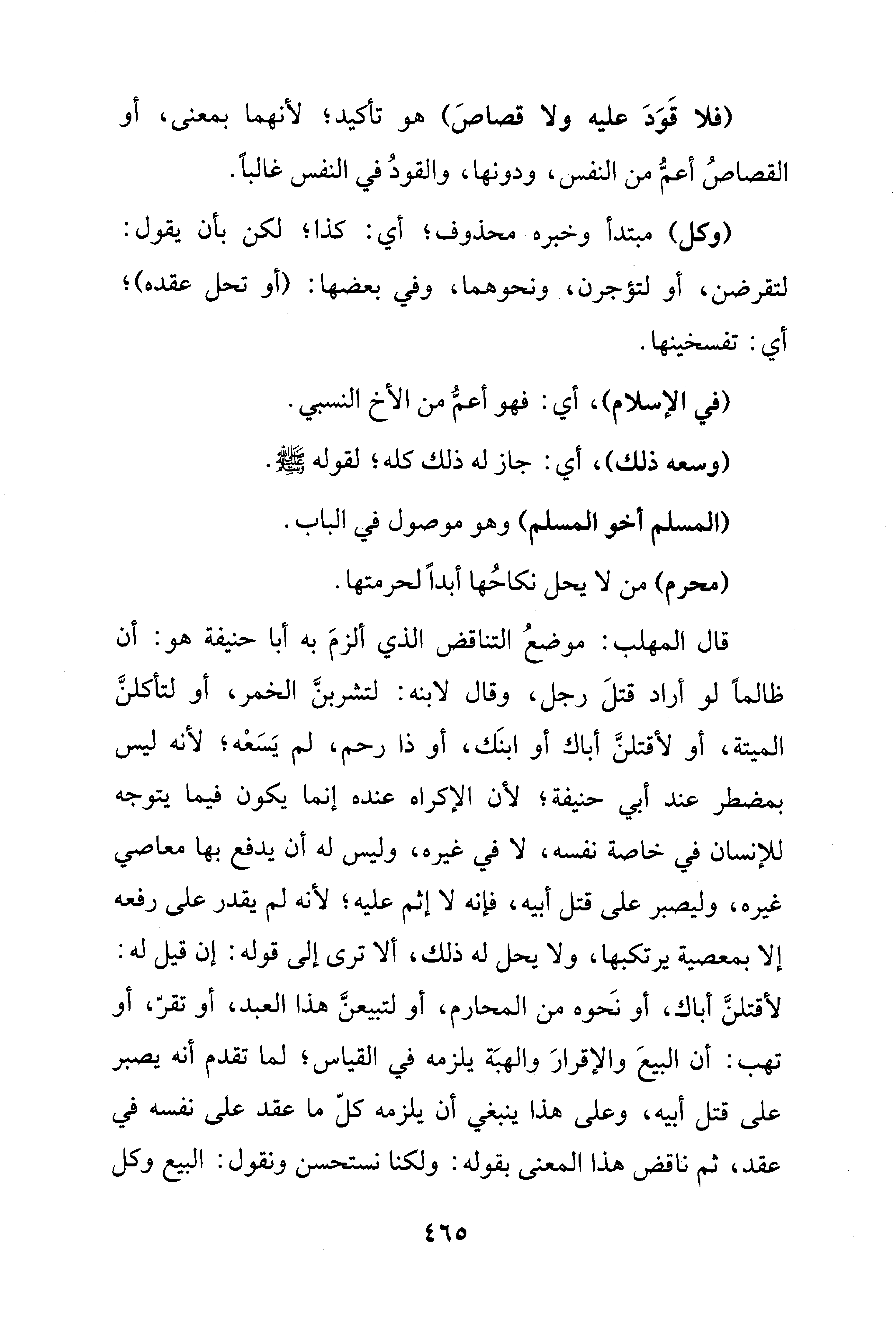 قال المهلب: موضعُ التناقض الذي ألزمَ به أبا حنيفة هو: أن ظالمًا لو أراد قتلَ رجل، وقال لابنه: لتشربنَّ الخمر، أو لتأكلنَّ الميتة، أو لأقتلنَّ أباك أو ابنَك، أو ذا رحم، لم يَسَعْه؛ لأنه ليس بمضطر عند أبي حنيفة؛ لأن الإكراه عنده إنما يكون فيما يتوجه للإنسان في خاصة نفسه، لا في غيره، وليس له أن يدفع بها معاصي غيره، وليصبر على قتل أبيه، فإنه لا إثم عليه؛ لأنه لم يقدر على رفعه إلا بمعصية يرتكبها، ولا يحل له ذلك، ألا ترى إلى قوله: إن قيل له: لأقتلنَّ أباك، أو نَحوه من المحارم، أو لتبيعنَّ هذا العبد، أو تقرّ، أو تهب: أن البيعَ والإقرارَ والهبَة يلزمه في القياس؛ لما تقدم أنه يصبر على قتل أبيه، وعلى هذا ينبغي أن يلزمه كلّ ما عقد على نفسه في عقد، ثم ناقض هذا المعنى بقوله: ولكنا نستحسن ونقول: البيع وكل
