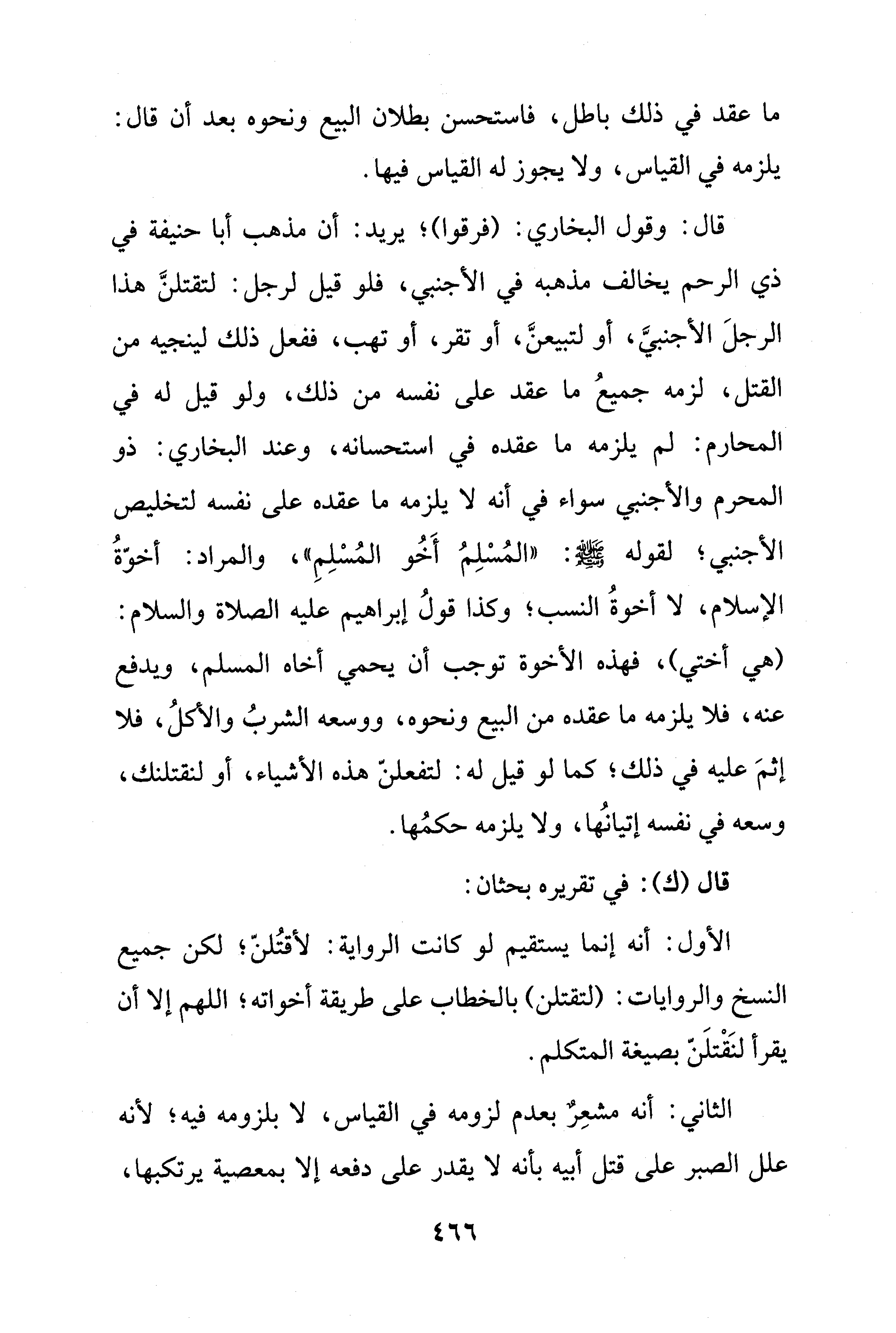 قال: وقول البخاري: (فرقوا)؛ يريد: أن مذهب أبا حنيفة في ذي الرحم يخالف مذهبه في الأجنبي، فلو قيل لرجل: لتقتلنَّ هذا الرجلَ الأجنبيَّ، أو لتبيعنَّ، أو تقر، أو تهب، ففعل ذلك لينجيه من القتل، لزمه جميعُ ما عقد على نفسه من ذلك، ولو قيل له في المحارم: لم يلزمه ما عقده في استحسانه، وعند البخاري: ذو المحرم والأجنبي سواء في أنه لا يلزمه ما عقده على نفسه لتخليص الأجنبي؛ لقوله - صلى الله عليه وسلم -: "المُسْلِمُ أَخُو المُسْلِمِ"، والمراد: أخوّةُ الإسلام، لا أخوةُ النسب؛ وكذا قولُ إبراهيم عليه الصلاة والسلام: (هي أختي)، فهذه الأخوة توجب أن يحمي أخاه المسلم، ويدفع عنه، فلا يلزمه ما عقده من البيع ونحوه، ووسعه الشربُ والأكلُ، فلا إثمَ عليه في ذلك؛ كما لو قيل له: لتفعلنّ هذه الأشياء، أو لنقتلنك، وسعه في نفسه إتيانُها، ولا يلزمه حكمُها.