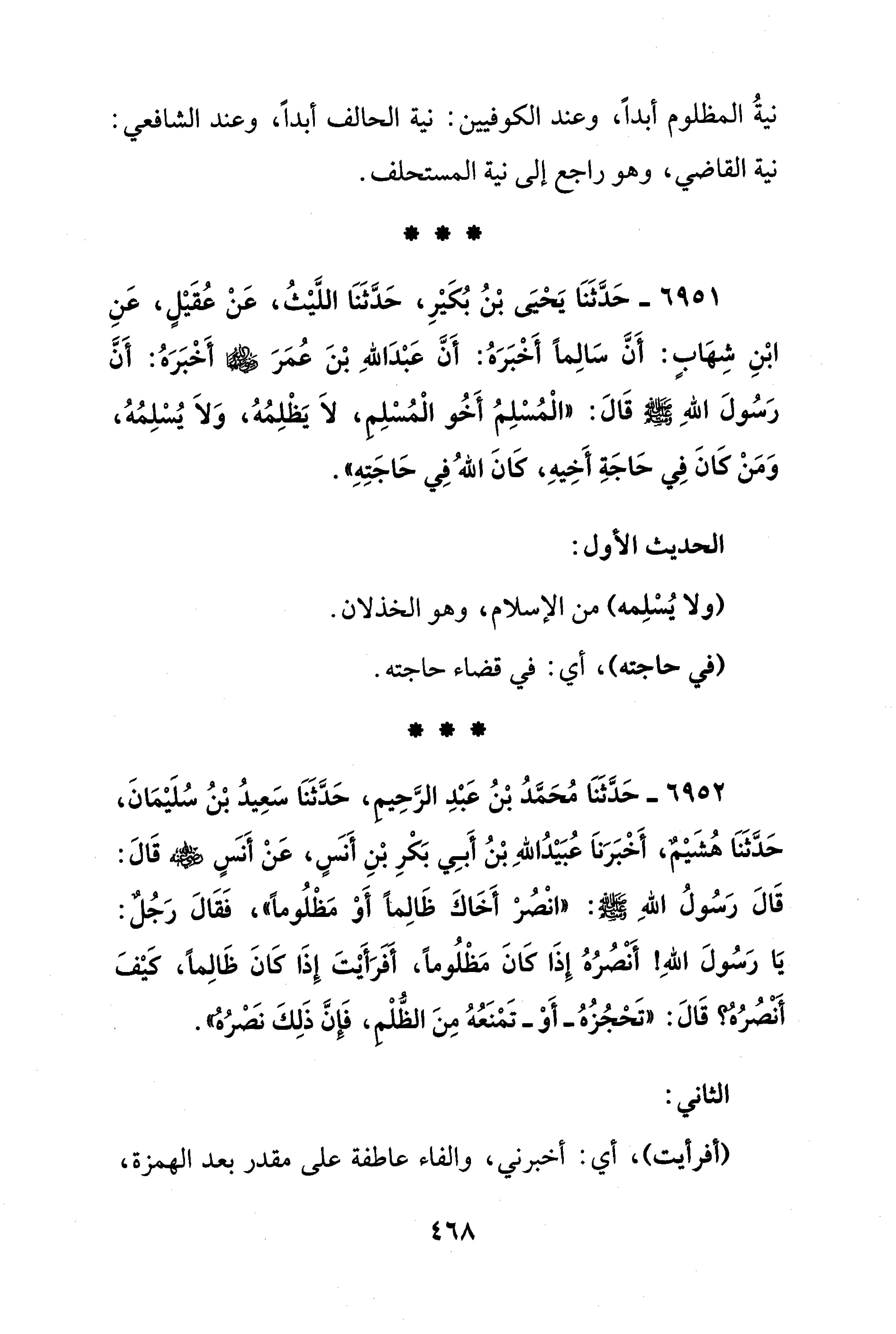 6951 - حَدَّثَنَا يَحْيَى بْنُ بُكَيْرِ، حَدَّثَنَا اللَّيْثُ، عَنْ عُقَيْلٍ، عَنِ ابْنِ شِهَابٍ: أَنَّ سَالِمًا أَخْبَرَهُ: أَنَّ عَبْدَ اللهِ بْنَ عُمَرَ - رضي الله عنهما - أَخْبَرَهُ: أَنَّ رَسُولَ اللهِ - صلى الله عليه وسلم - قَالَ: "الْمُسْلِمُ أَخُو الْمُسْلِم، لَا يَظْلِمُهُ، وَلَا يُسْلِمُهُ، وَمَنْ كَانَ فِي حَاجَةِ أَخِيهِ، كَانَ اللهُ فِي حَاجَتِهِ".