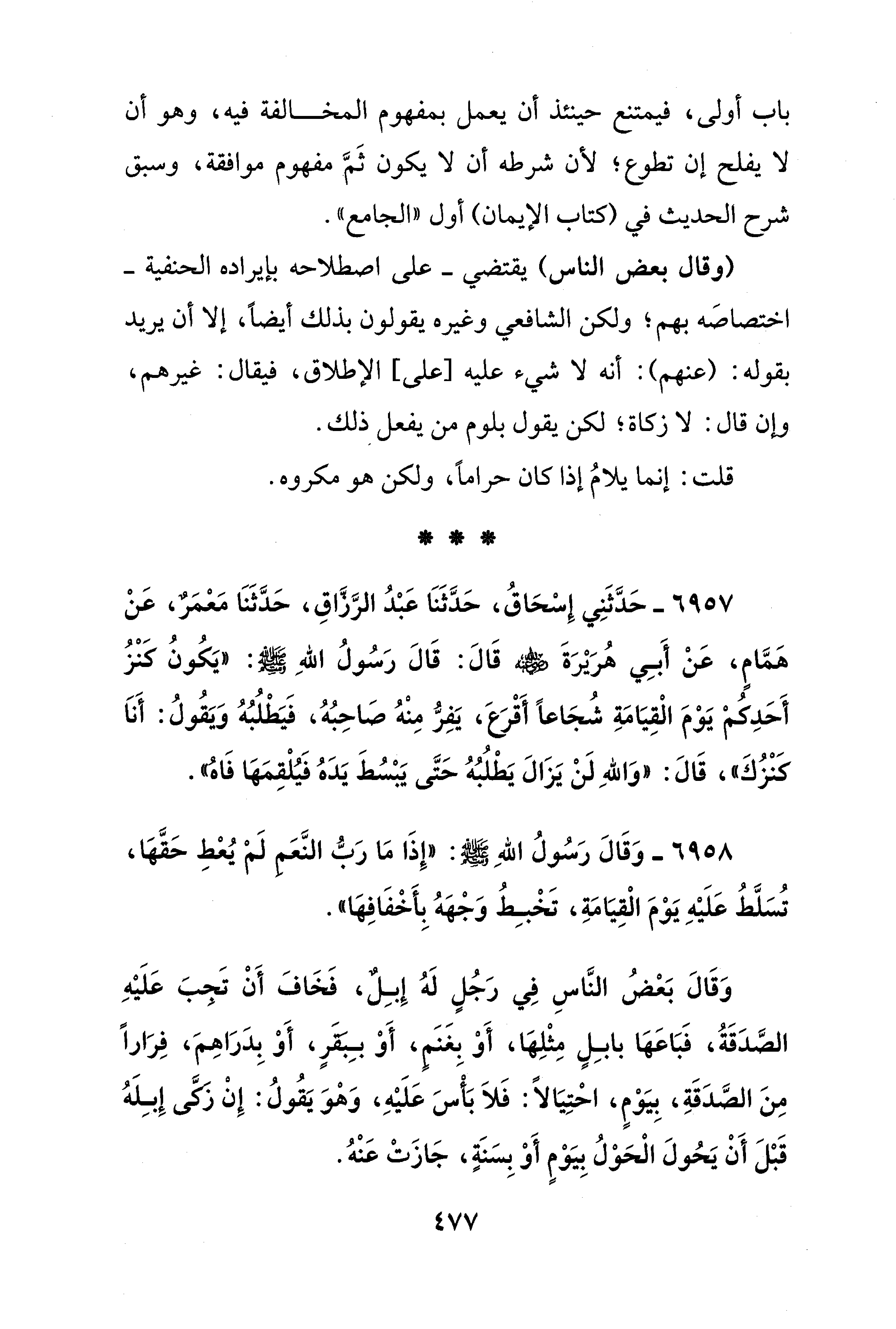 6957 - حَدَّثَنِي إِسْحَاقُ، حَدَّثَنَا عَبْدُ الرَّزَاقِ، حَدَّثَنَا مَعْمَرٌ، عَنْ هَمَّامٍ، عَنْ أَبِي هُرَيْرَةَ - رضي الله عنه - قَالَ: قَالَ رَسُولُ اللهِ - صلى الله عليه وسلم -: "يَكُونُ كَنْزُ أَحَدِكُمْ يَوْمَ الْقِيَامَةِ شُجَاعًا أَقْرَعَ، يَفِرُّ مِنْهُ صَاحِبُهُ، فَيَطْلُبُهُ وَيَقُولُ: أَنَا كَنْزُكَ"، قَالَ: "وَاللهِ لَنْ يَزَالَ يَطْلُبُهُ حَتَّى يَبْسُطَ يَدَهُ فَيُلْقِمَهَا فَاهُ".