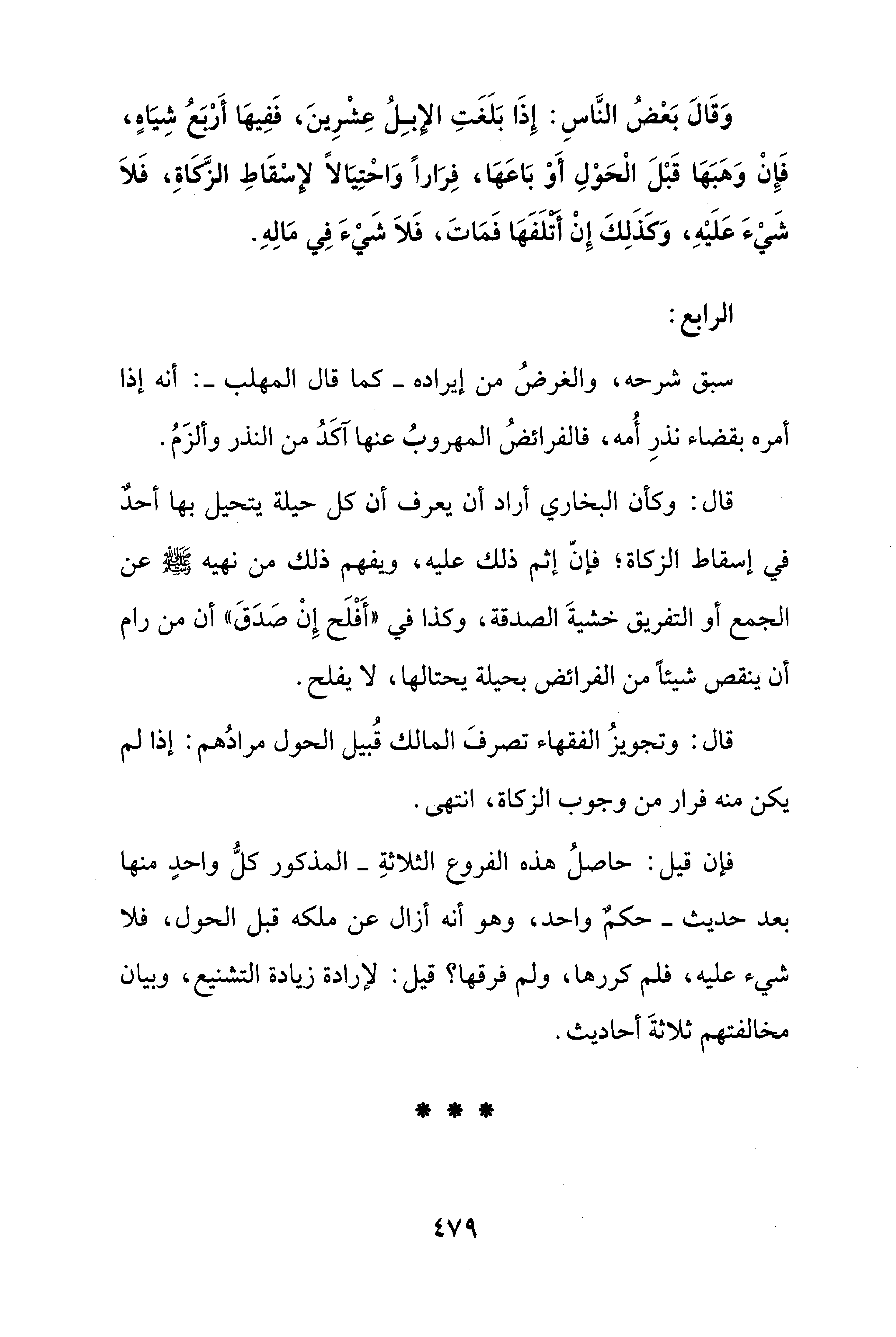 وَقَالَ بَعْضُ النَّاسِ: إِذَا بَلَغَتِ الإِبِلُ عِشْرِينَ، فَفِيهَا أَرْبَعُ شِيَاهٍ، فَإِنْ وَهَبَهَا قَبْلَ الْحَوْلِ أَوْ بَاعَهَا، فِرَارًا وَاحْتِيَالًا لإسْقَاطِ الزَّكَاةِ، فَلَا شَيْءَ عَلَيْهِ، وَكَذَلِكَ إِنْ أَتْلَفَهَا فَمَاتَ، فَلَا شَيْءَ فِي مَالِهِ.
