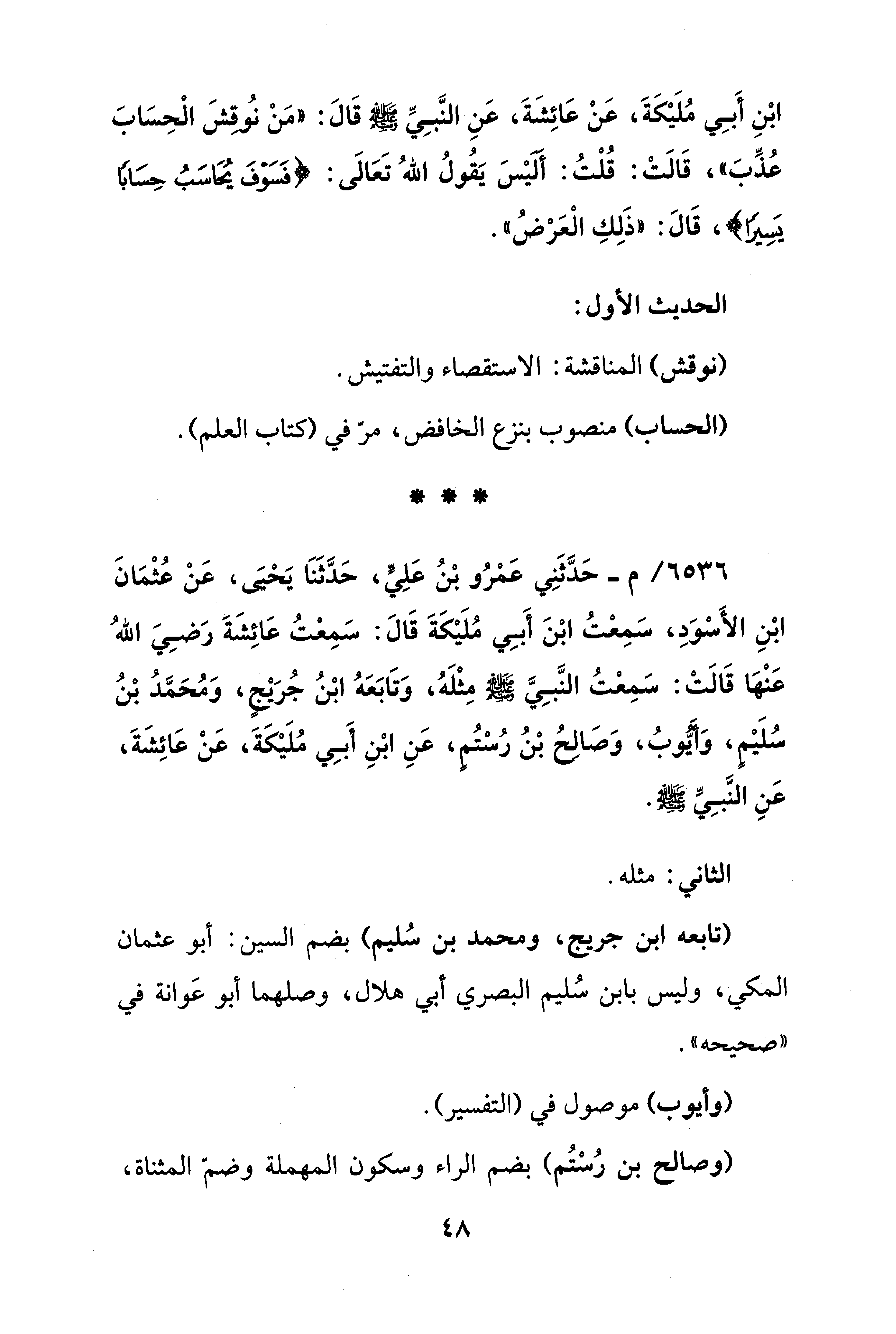 6536 / -م - حَدَّثَنِي عَمْرُو بْنُ عَلِيٍّ، حَدَّثَنَا يَحْيَى، عَنْ عُثْمَانَ بْنِ الأَسْوَدِ، سَمِعْتُ ابْنَ أَبِي مُلَيْكَةَ قَالَ: سَمِعْتُ عَائِشَةَ رَضِيَ اللهُ عَنْهَا قَالَتْ: سَمِعْتُ النَّبِيَّ - صلى الله عليه وسلم - مِثْلَهُ، وَتَابَعَهُ ابْنُ جُرَيْجٍ، وَمُحَمَّدُ بْنُ سُلَيْمٍ، وَأَيُّوبُ، وَصَالِحُ بْنُ رُسْتُم، عَنِ ابْنِ أَبِي مُلَيْكَةَ، عَنْ عَائِشَةَ، عَنِ النَّبِيِّ - صلى الله عليه وسلم -.