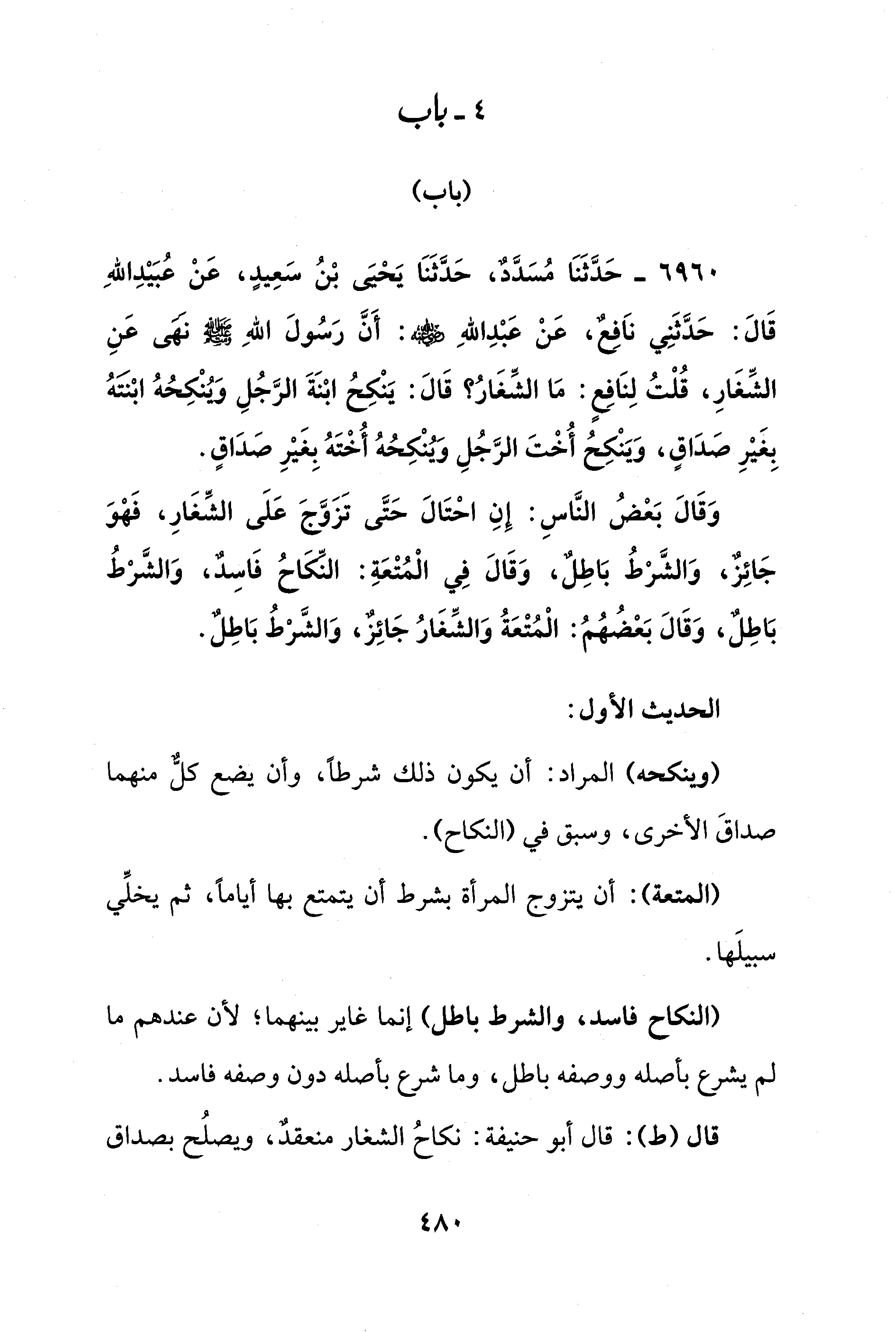 6960 - حَدَّثَنَا مُسَدَّدٌ، حَدَّثَنَا يَحْيَى بْنُ سَعِيدٍ، عَنْ عُبَيْدِ اللهِ قَالَ: حَدَّثَنِي نَافِعٌ، عَنْ عَبْدِ اللهِ - رضي الله عنه -: أَنَّ رَسُولَ اللهِ - صلى الله عليه وسلم - نَهَى عَنِ الشِّغَارِ، قُلْتُ لِنَافِعٍ: مَا الشِّغَارُ؟ قَالَ: يَنْكِحُ ابْنَةَ الرَّجُلِ وَيُنْكِحُهُ ابْنتَهُ بِغَيْرِ صَدَاقٍ، وَيَنْكِحُ أُخْتَ الرَّجُلِ وَيُنْكِحُهُ أُخْتَهُ بِغَيْرِ صَدَاقٍ.