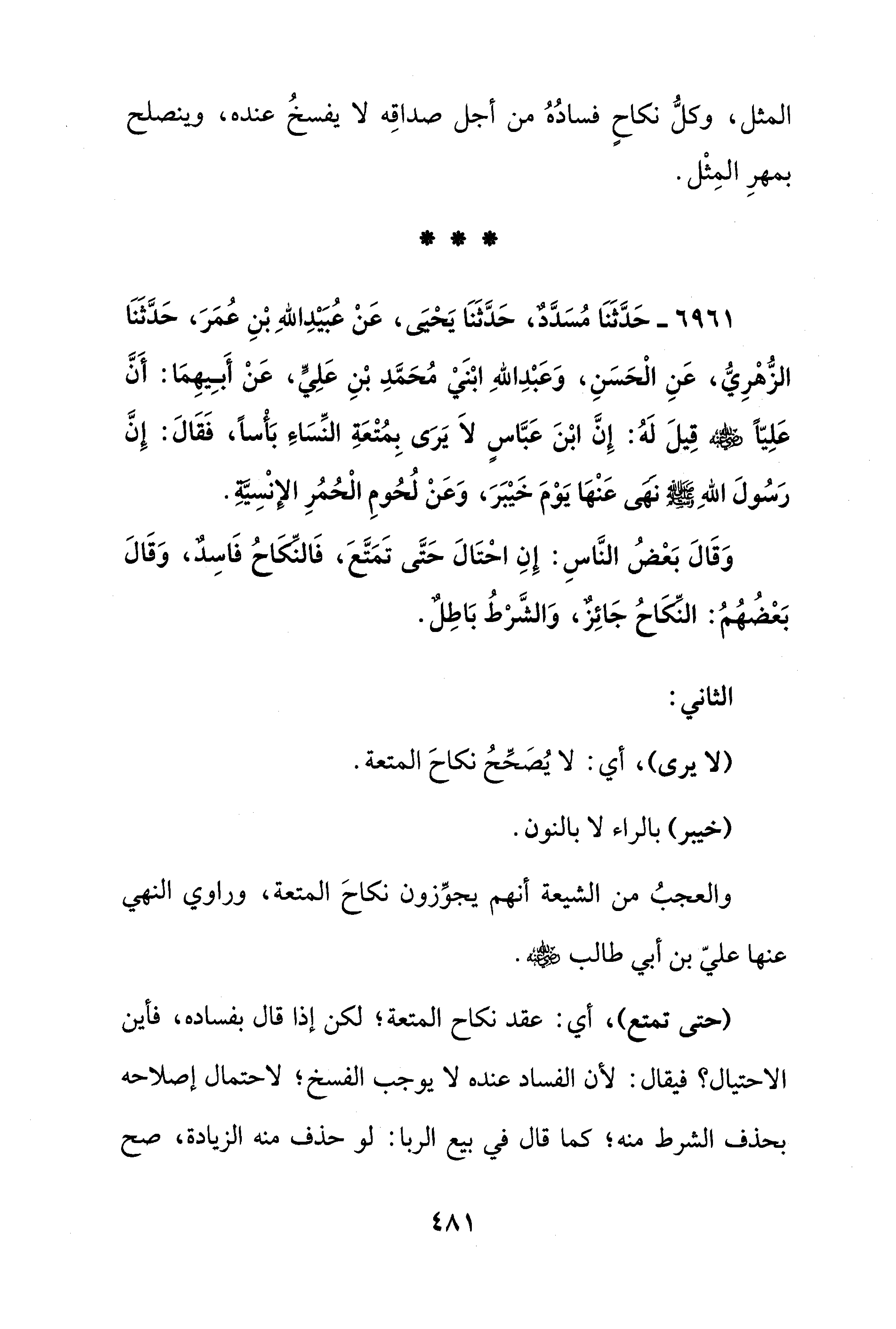 6961 - حَدَّثَنَا مُسَدَّدٌ، حَدَّثَنَا يَحْيَى، عَنْ عُبَيْدِ اللهِ بْنِ عُمَرَ، حَدَّثَنَا الزُّهْرِيُّ، عَنِ الْحَسَنِ، وَعَبْدِ اللهِ ابْنَيْ مُحَمَّدِ بْنِ عَلِيٍّ، عَنْ أَبِيهِمَا: أَنَّ عَلِيًّا - رضي الله عنه - قِيلَ لَهُ: إِنَّ ابْنَ عَبَّاسٍ لَا يَرَى بِمُتْعَةِ النِّسَاءِ بَأْسًا، فَقَالَ: إِنَّ رَسُولَ اللهِ - صلى الله عليه وسلم - نَهَى عَنْهَا يَوْمَ خَيْبَرَ، وَعَنْ لُحُومِ الْحُمُرِ الإِنْسِيَّةِ.