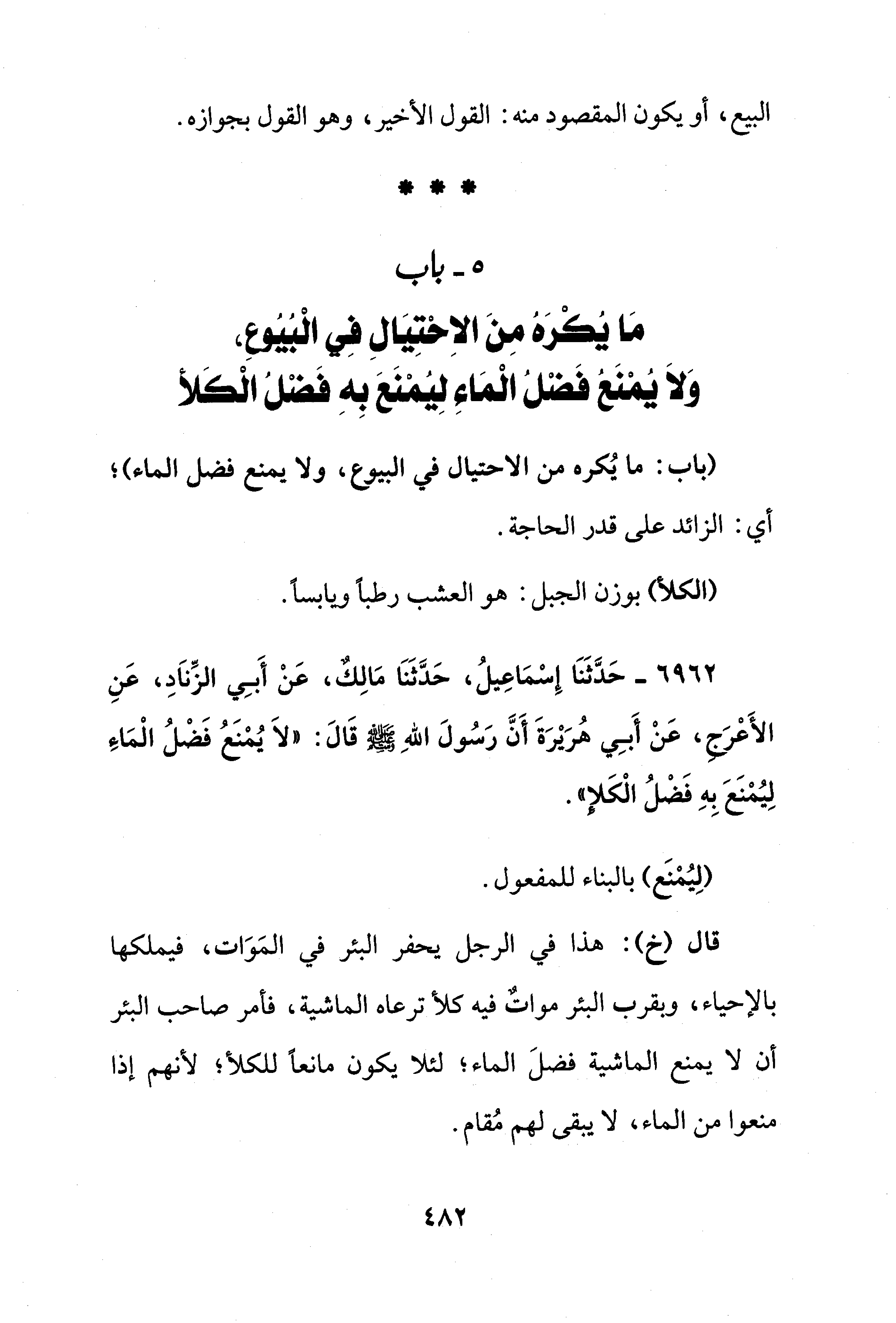 5 - باب مَا يُكْرَهُ مِنَ الاِحْتِيَالِ فِي الْبُيُوعِ، وَلَا يُمْنَعَ فَضْلُ الْمَاءِ لِيُمْنَعَ بِهِ فَضْلُ الْكَلأ