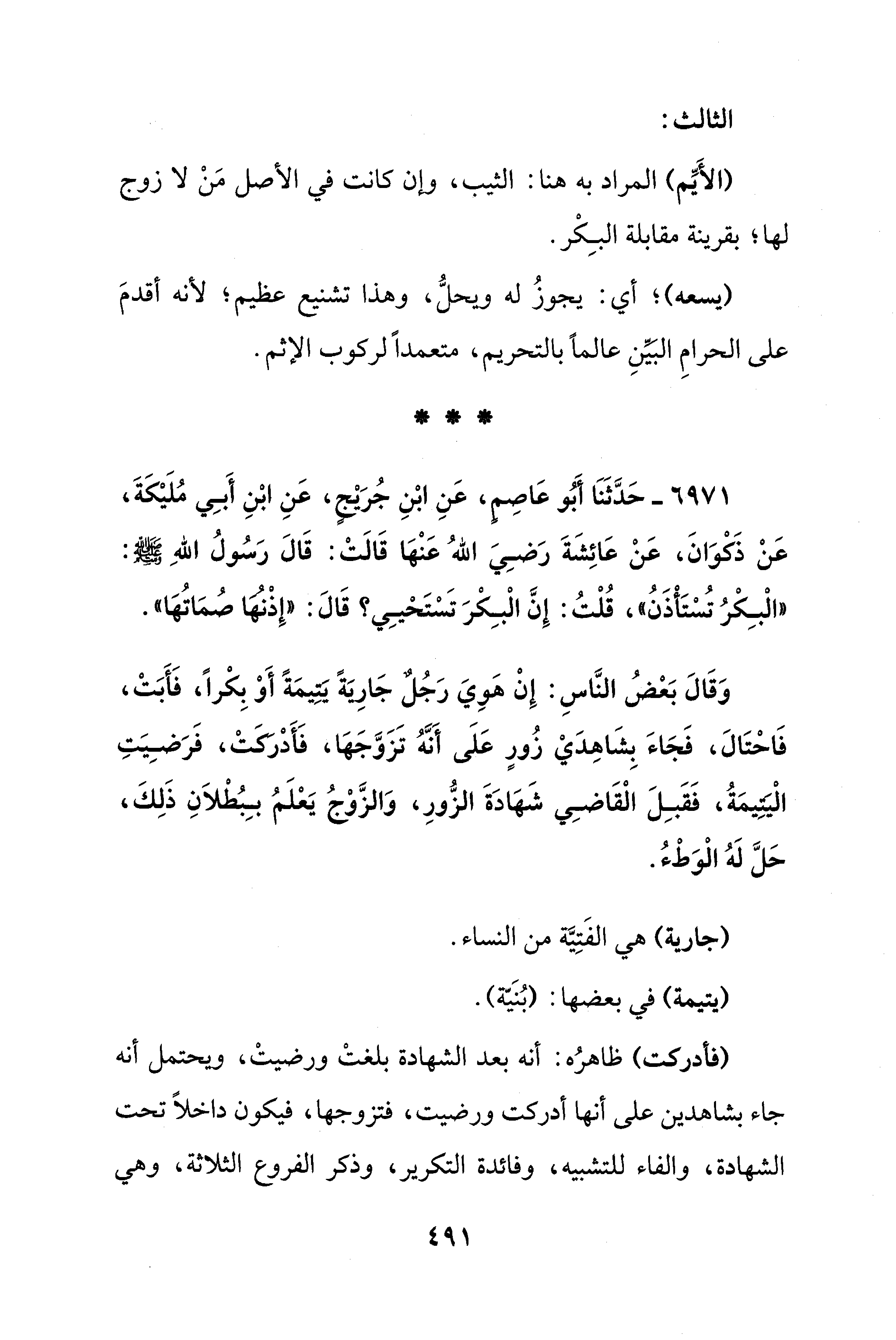 6971 - حَدَّثَنَا أَبُو عَاصِمٍ، عَنِ ابْنِ جُرَيْجٍ عَنِ ابْنِ أَبِي مُلَيْكَةَ، عَنْ ذَكْوَانَ، عَنْ عَائِشَةَ رَضِيَ اللهُ عَنْهَا قَالَتْ: قَالَ رَسُولُ اللهِ - صلى الله عليه وسلم -: "الْبِكْرُ تُسْتَأْذَنُ"، قُلْتُ: إِنَّ الْبِكْرَ تَسْتَحْيِي؟ قَالَ: "إِذْنُها صُمَاتُهَا".