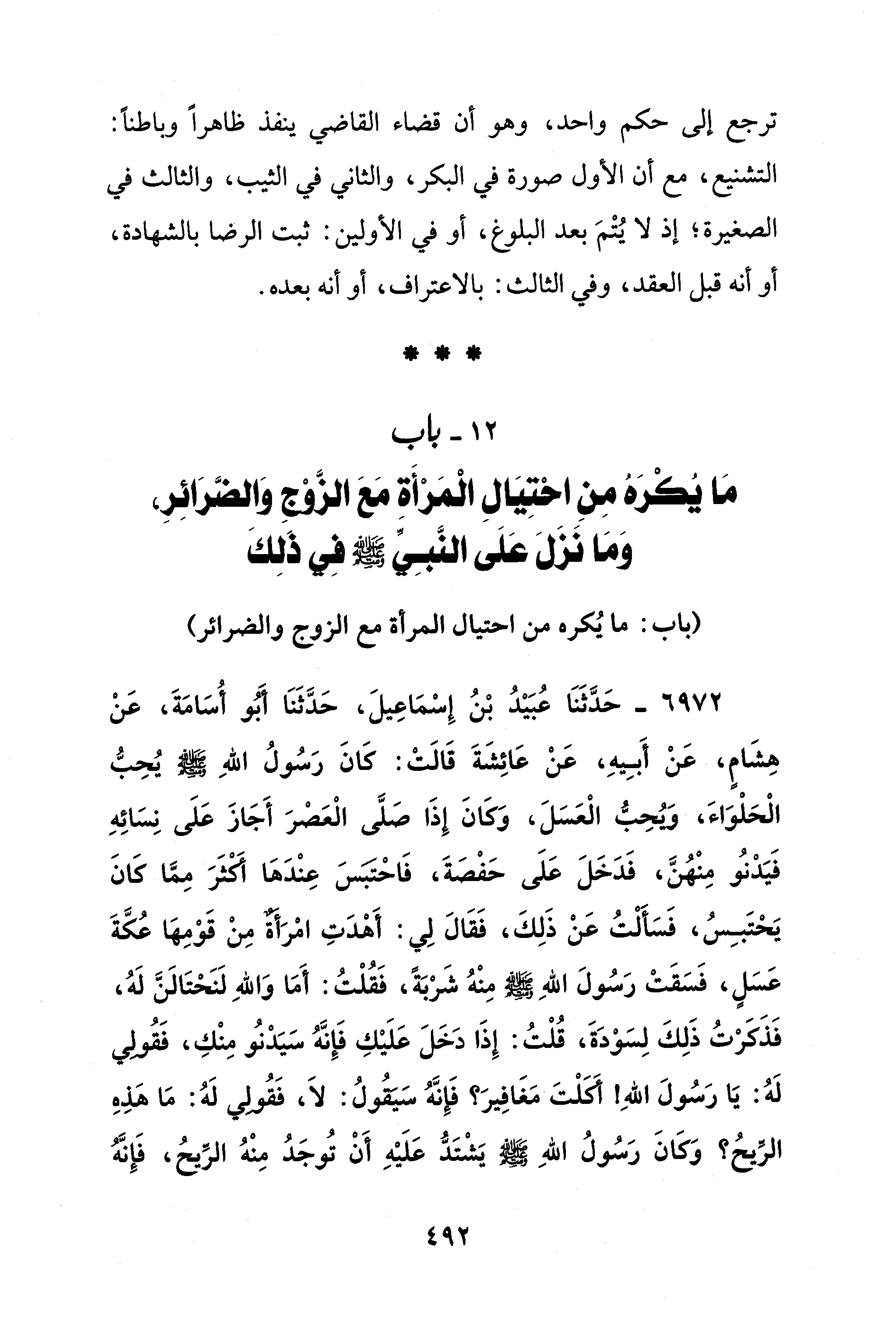 6972 - حَدَّثَنَا عُبَيْدُ بْنُ إِسْمَاعِيلَ، حَدَّثَنَا أَبُو أُسَامَةَ، عَنْ هِشَامٍ، عَنْ أَبِيهِ، عَنْ عَائِشَةَ قَالَتْ: كَانَ رَسُولُ اللهِ - صلى الله عليه وسلم - يُحِبُّ الْحَلْوَاءَ، ويُحِبُّ الْعَسَلَ، وَكَانَ إِذَا صَلَّى الْعَصْرَ أَجَازَ عَلَى نِسَائِهِ فَيَدْنُو مِنْهُنَّ، فَدَخَلَ عَلَى حَفْصَةَ، فَاحْتَبسَ عِنْدَهَا أَكْثَرَ مِمَّا كَانَ يَحْتَبِسُ، فَسَألتُ عَنْ ذَلِكَ، فَقَالَ لِي: أَهْدَتِ امْرَأَةٌ مِنْ قَوْمِهَا عُكَّةَ عَسَلٍ، فَسَقَتْ رَسُولَ اللهِ - صلى الله عليه وسلم - مِنْهُ شَرْبَةً، فَقُلْتُ: أَمَا وَاللهِ لنحْتَالَنَّ لَهُ، فَذَكَرْتُ ذَلِكَ لِسَوْدَةَ، قُلْتُ: إِذَا دَخَلَ عَلَيْكِ فَإِنَّهُ سَيَدْنُو مِنْكِ، فَقُولِي لَهُ: يَا رَسُولَ اللهِ! أَكَلْتَ مَغَافِيرَ؟ فَإِنَّهُ سَيَقُولُ: لَا، فَقُولِي لَهُ: مَا هَذِهِ الرِّيحُ؟ وَكَانَ رَسُولُ اللهِ - صلى الله عليه وسلم - يَشْتَدُّ عَلَيْهِ أَنْ تُوجَدُ مِنْهُ الرِّيحُ، فَإِنَّهُ