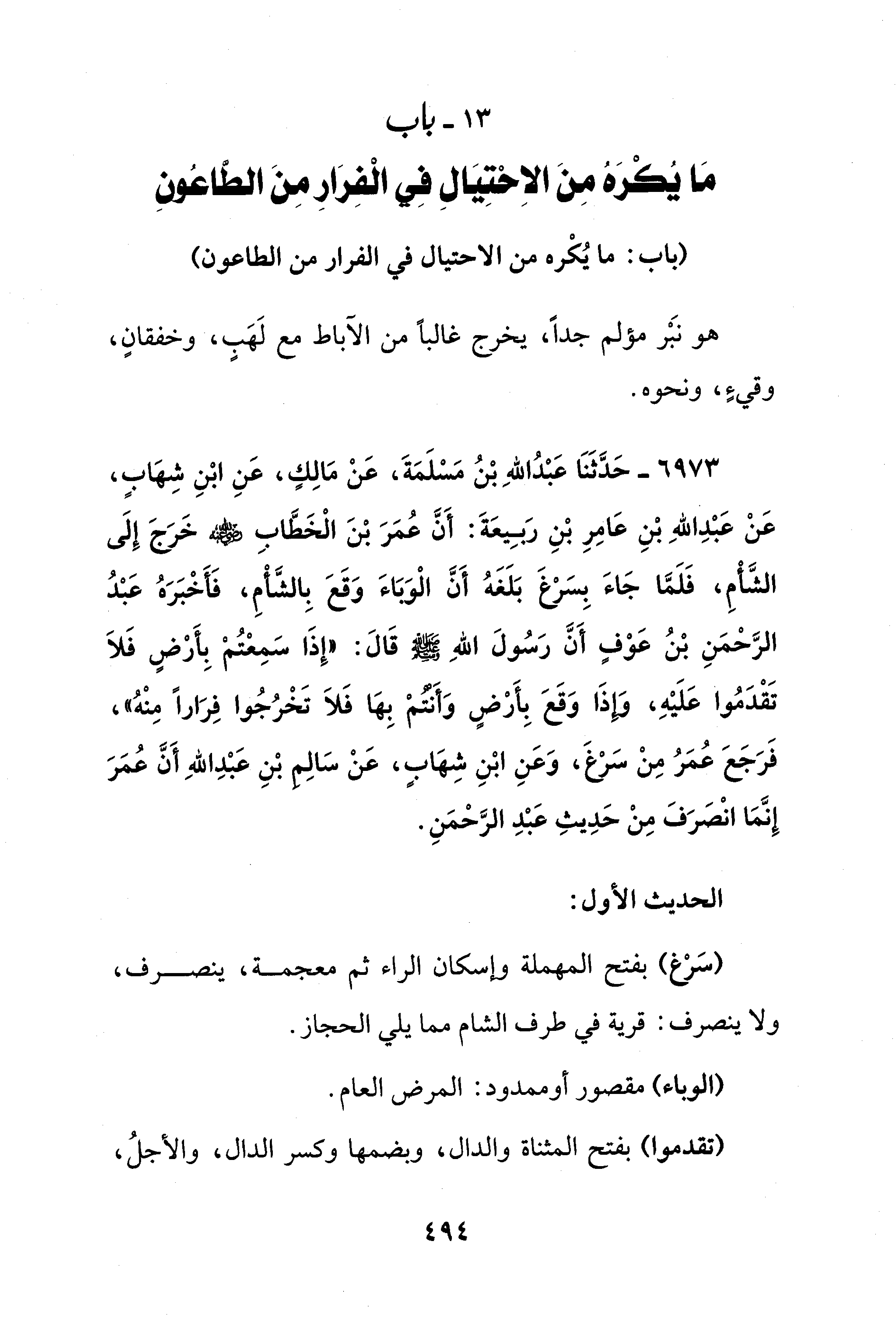 6973 - حَدَّثَنَا عَبْدُ اللهِ بْنُ مَسْلَمَةَ، عَنْ مَالِكٍ، عَنِ ابْنِ شِهَابٍ، عَنْ عَبْدِ اللهِ بْنِ عَامِرِ بْنِ رَبِيعَةَ: أَنَّ عُمَرَ بْنَ الْخَطَّابِ - رضي الله عنه - خَرَجَ إِلَى الشَّأْمِ، فَلَمَّا جَاءَ بِسَرْغَ بَلَغَهُ أَنَّ الْوَبَاءَ وَقَعَ بِالشَّأْمِ، فَأَخْبَرَهُ عَبْدُ الرَّحْمَنِ بْنُ عَوْفٍ أَنَّ رَسُولَ اللهِ - صلى الله عليه وسلم - قَالَ: "إِذَا سَمِعْتُمْ بِأَرْضٍ فَلَا تَقْدَمُوا عَلَيْهِ، وَإِذَا وَقَعَ بِأَرْضٍ وَأَنتمْ بِهَا فَلَا تَخْرُجُوا فِرَارًا مِنْهُ"، فَرَجَعَ عُمَرُ مِنْ سَرْغَ، وَعَنِ ابْنِ شِهَابٍ، عَنْ سَالِم بْنِ عَبْدِ اللهِ أَنَّ عُمَرَ إِنَّمَا انْصَرَفَ مِنْ حَدِيثِ عَبْدِ الرَّحْمَنِ.