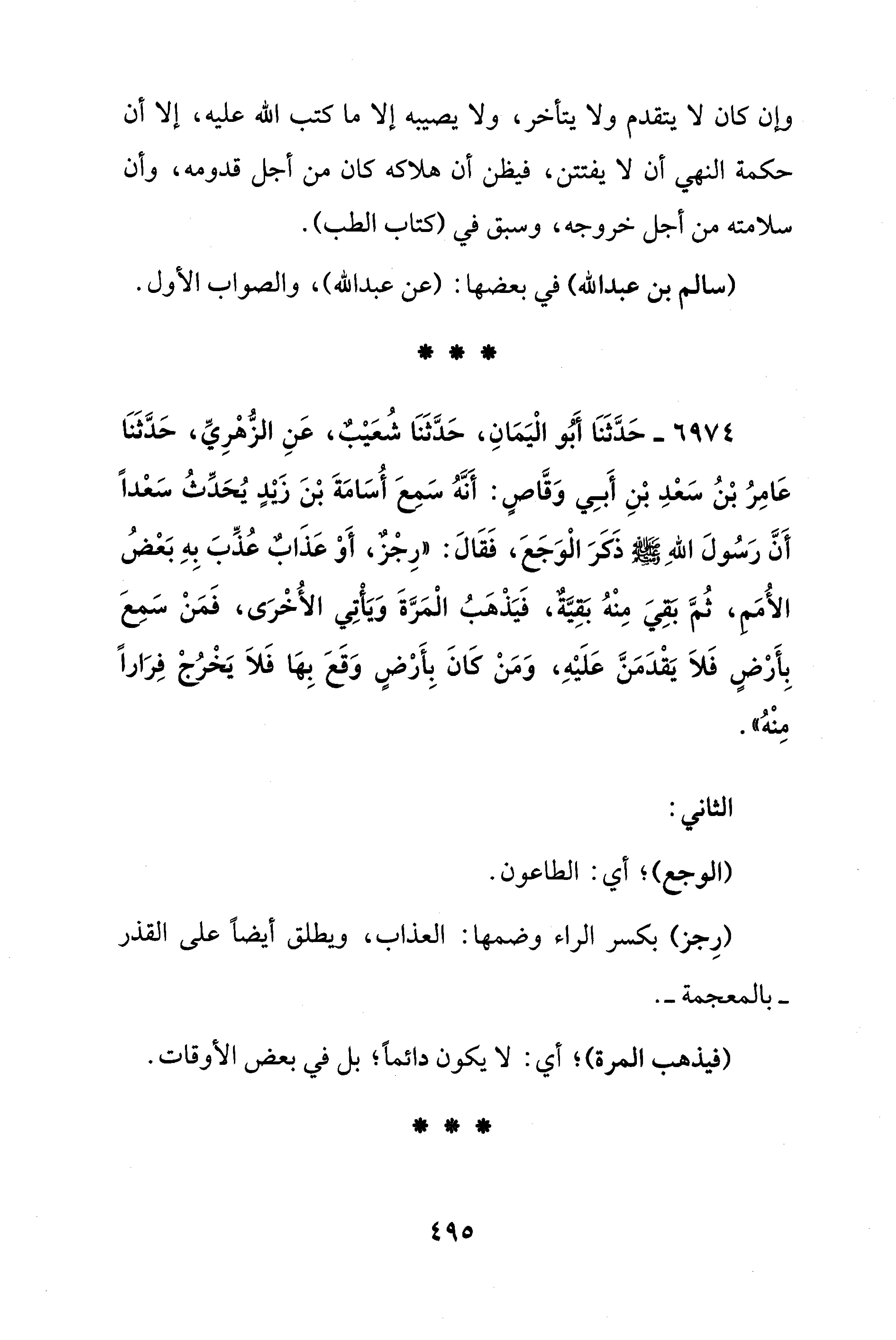 6974 - حَدَّثَنَا أَبُو الْيَمَانِ، حَدَّثَنَا شُعَيْبٌ، عَنِ الزُّهْرِيِّ، حَدَّثَنَا عَامِرُ بْنُ سَعْدِ بْنِ أَبِي وَقَّاصٍ: أَنَّهُ سَمعَ أُسَامَةَ بْنَ زيدٍ يُحَدِّثُ سَعْدًا أَنَّ رَسُولَ اللهِ - صلى الله عليه وسلم - ذَكَرَ الْوَجَعَ، فَقَالَ: "رِجْزٌ، أَوْ عَذَابٌ عُذِّبَ بِهِ بَعْضُ الأُمَمِ، ثُمَّ بَقِيَ مِنْهُ بَقِيَّةٌ، فَيَذْهَبُ الْمَرَّةَ وَيَأْتِي الأُخْرَى، فَمَنْ سَمعَ بِأَرْضٍ فَلَا يَقْدَمَنَّ عَلَيْهِ، وَمَنْ كَانَ بِأَرْضٍ وَقَعَ بِهَا فَلَا يَخْرُجْ فِرَارًا مِنْهُ".