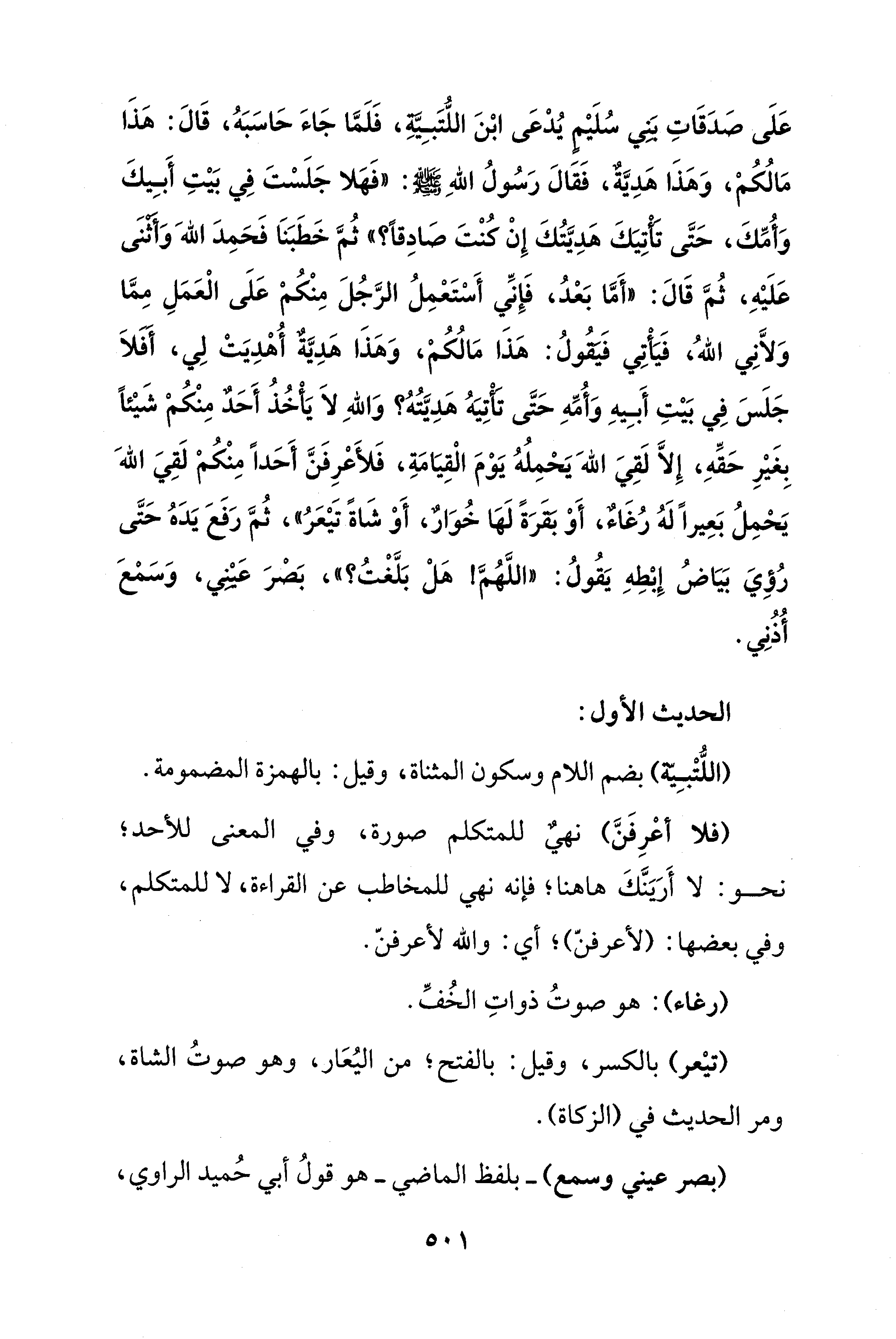 عَلَى صَدَقَاتِ بَنِي سُلَيْمٍ يُدْعَى ابْنَ اللُّتَبِيَّةِ، فَلَمَّا جَاءَ حَاسَبَهُ، قَالَ: هَذَا مَالُكُمْ، وَهَذَا هَدِيَّةٌ، فَقَالَ رَسُولُ اللهِ - صلى الله عليه وسلم -: "فَهَلا جَلَسْتَ فِي بَيْتِ أَبِيكَ وَأُمِّكَ، حَتَّى تَأْتِيَكَ هَدِيَّتُكَ إِنْ كُنْتَ صَادِقًا؟ " ثُمَّ خَطَبَنَا فَحَمِدَ اللهَ وَأَثْنَى عَلَيْهِ، ثُمَّ قَالَ: "أَمَّا بَعْدُ، فَإِنِّي أَسْتَعْمِلُ الرَّجُلَ مِنْكُمْ عَلَى الْعَمَلِ مِمَّا وَلَّانِي اللهُ، فَيَأْتِي فَيَقُولُ: هَذَا مَالُكُمْ، وَهَذَا هَدِيَّةٌ أُهْدِيَتْ لِي، أفلاَ جَلَسَ فِي بَيْتِ أَبِيهِ وَأُمِّهِ حَتَّى تَأْتِيَهُ هَدِيَّتُهُ؟ وَاللهِ لَا يَأْخُذُ أَحَدٌ مِنْكُمْ شَيْئًا بِغَيْرِ حَقِّهِ، إِلَّا لَقِيَ اللهَ يَحْمِلُهُ يَوْمَ الْقِيَامَةِ، فَلأَعْرِفَنَّ أَحَدًا مِنْكُمْ لَقِيَ اللهَ يَحْمِلُ بَعِيرًا لَهُ رُغَاءٌ: أَوْ بَقَرَةً لَهَا خُوَارٌ، أَوْ شَاةً تَيْعَرُ"، ثُمَّ رَفَعَ يَدَهُ حَتَّى رُؤِيَ بَيَاضُ إِبْطِهِ يَقُولُ: "اللَّهُمَّ! هَلْ بَلَّغْتُ؟ "، بَصْرَ عَيْنِي، وَسَمْعَ أُذُنِي.