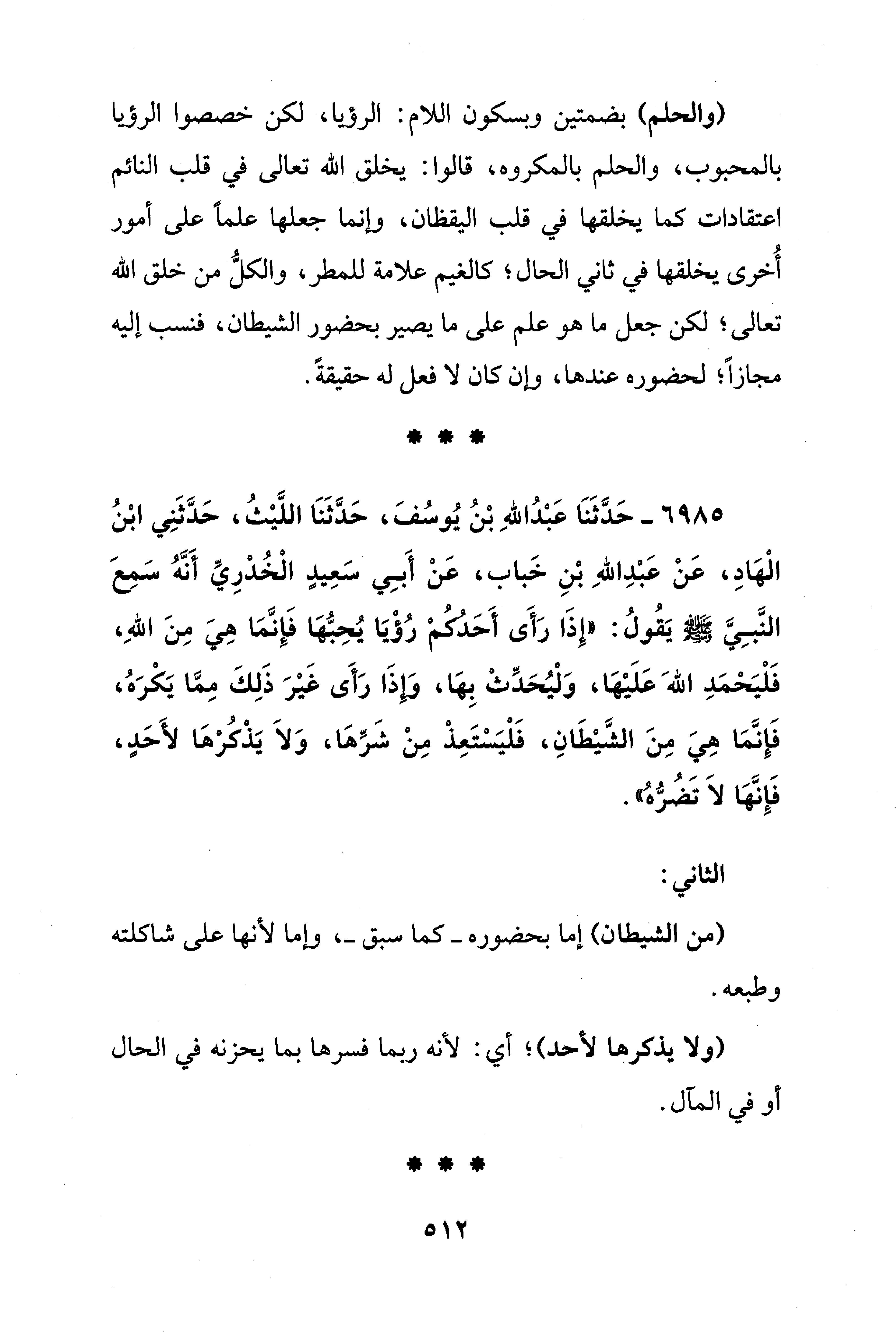 6985 - حَدَّثَنَا عَبْدُ اللهِ بْنُ يُوسُفَ، حَدَّثَنَا اللَّيْثُ، حَدَّثَنِي ابْنُ الْهَادِ، عَنْ عَبْدِ اللهِ بْنِ خَباب، عَنْ أَبِي سَعِيدٍ الْخُدْرِيِّ أَنَّهُ سَمِعَ النَّبِيَّ - صلى الله عليه وسلم - يَقُولُ: "إِذَا رَأَى أَحَدُكُمْ رُؤْيَا يُحِبُّهَا فَإنَّمَا هِيَ مِنَ اللهِ، فَلْيَحْمَدِ اللهَ عَلَيْهَا، وَلْيُحَدِّثْ بِهَا، وَإِذَا رَأَى غَيْرَ ذَلِكَ مِمَّا يَكْرَهُ، فَإِنَّمَا هِيَ مِنَ الشَّيْطَانِ، فَلْيَسْتَعِذْ مِنْ شَرِّهَا، وَلَا يَذْكُرْهَا لأَحَدٍ، فَإِنَّهَا لَا تَضُرُّهُ".