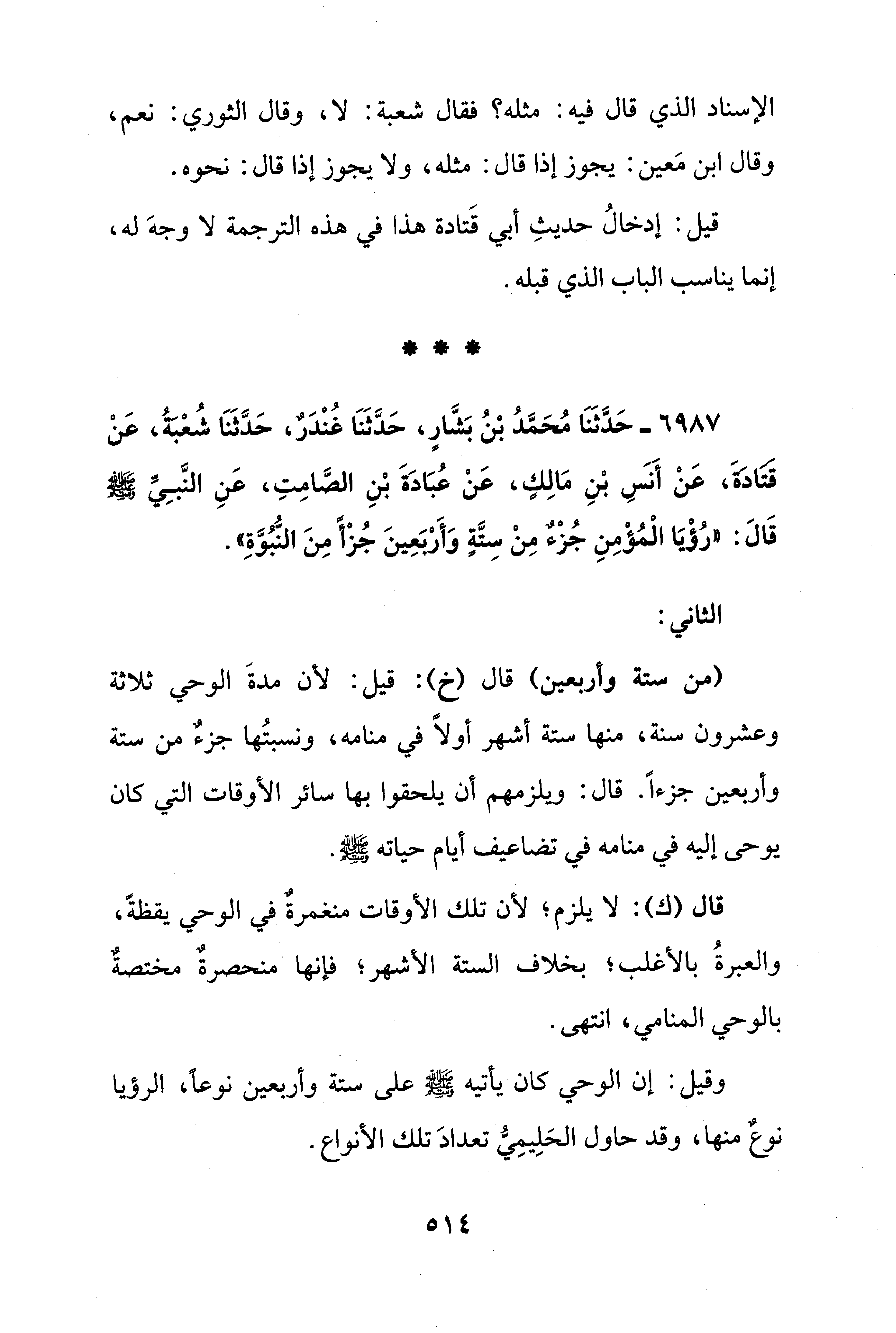 6987 - حَدَّثَنَا مُحَمَّدُ بْنُ بَشَّارٍ، حَدَّثَنَا غُنْدَرٌ، حَدَّثَنَا شُعْبَةُ، عَنْ قتادَةَ، عَنْ أَنس بْنِ مَالِكٍ، عَنْ عُبَادَةَ بْنِ الصَّامِتِ، عَنِ النَّبِيِّ - صلى الله عليه وسلم - قَالَ: "رُؤْيَا الْمُؤْمِنِ جُزْءٌ مِنْ سِتَّةٍ وَأَرْبَعِينَ جُزْأً مِنَ النُّبُوَّةِ".