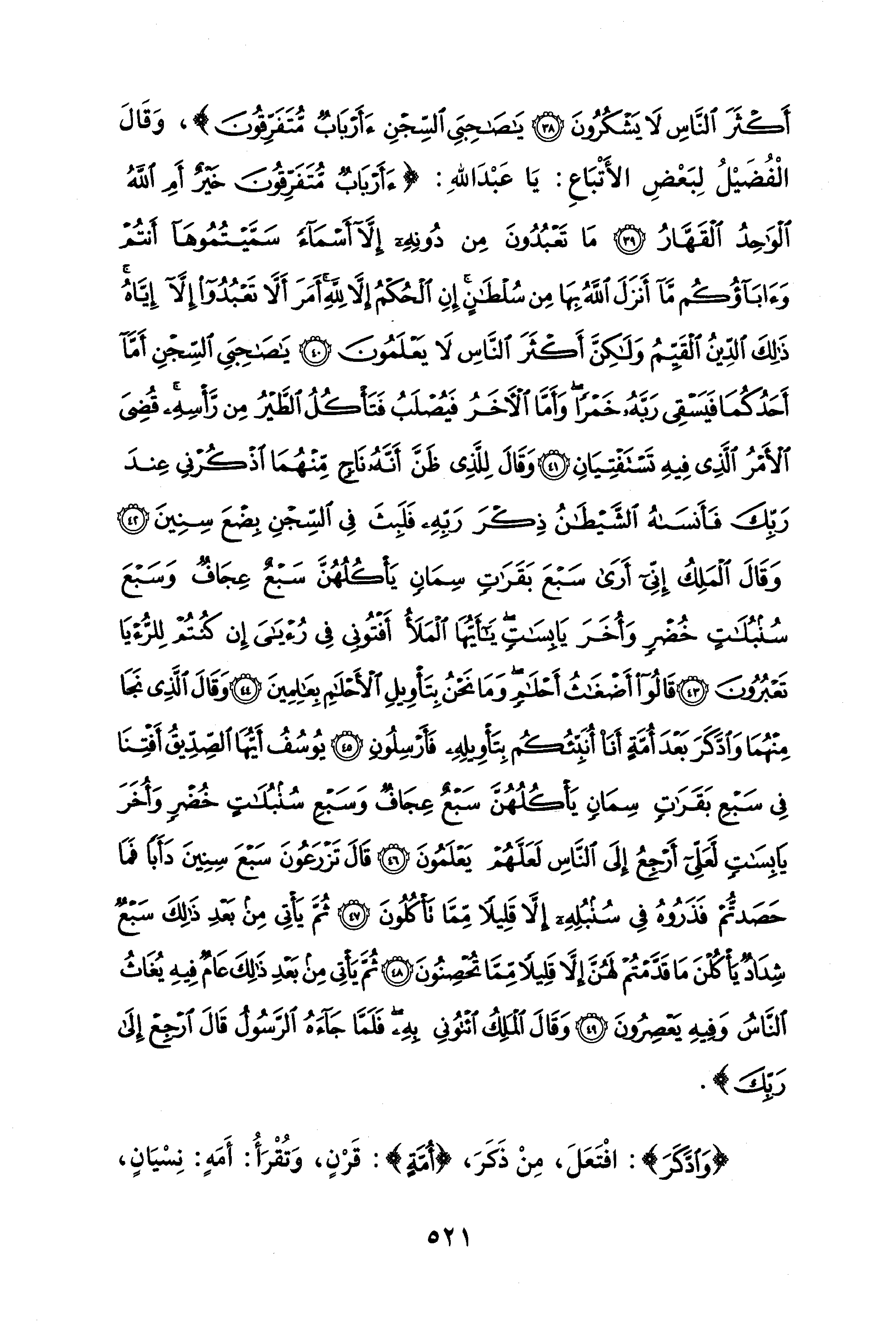 أَكْثَرَ النَّاسِ لَا يَشْكُرُونَ (38) يَاصَاحِبَيِ السِّجْنِ أَأَرْبَابٌ مُتَفَرِّقُونَ}، وَقَالَ الْفُضَيْلُ لِبَعْضِ الأتبَاعِ: يَا عَبْدَ اللهِ: {أَأَرْبَابٌ مُتَفَرِّقُونَ خَيْرٌ أَمِ اللَّهُ الْوَاحِدُ الْقَهَّارُ (39) مَا تَعْبُدُونَ مِنْ دُونِهِ إلا أَسْمَاءً سَمَّيْتُمُوهَا أَنْتُمْ وَآبَاؤُكُمْ مَا أَنْزَلَ اللَّهُ بِهَا مِنْ سُلْطَانٍ إِنِ الْحُكْمُ إلا لِلَّهِ أَمَرَ أَلَّا تَعْبُدُوا إلا إِيَّاهُ ذَلِكَ الدِّينُ الْقَيِّمُ وَلَكِنَّ أَكْثَرَ النَّاسِ لَا يَعْلَمُونَ (40) يَاصَاحِبَيِ السِّجْنِ أَمَّا أَحَدُكُمَا فَيَسْقِي رَبَّهُ خَمْرًا وَأَمَّا الْآخَرُ فَيُصْلَبُ فَتَأْكُلُ الطَّيْرُ مِنْ رَأْسِهِ قُضِيَ الْأَمْرُ الَّذِي فِيهِ تَسْتَفْتِيَانِ (41) وَقَالَ لِلَّذِي ظَنَّ أَنَّهُ نَاجٍ مِنْهُمَا اذْكُرْنِي عِنْدَ رَبِّكَ فَأَنْسَاهُ الشَّيْطَانُ ذِكْرَ رَبِّهِ فَلَبِثَ فِي السِّجْنِ بِضْعَ سِنِينَ (42) وَقَالَ الْمَلِكُ إِنِّي أَرَى سَبْعَ بَقَرَاتٍ سِمَانٍ يَأْكُلُهُنَّ سَبْعٌ عِجَافٌ وَسَبْعَ سُنْبُلَاتٍ خُضْرٍ وَأُخَرَ يَابِسَاتٍ يَا أَيُّهَا الْمَلَأُ أَفْتُونِي فِي رُؤْيَايَ إِنْ كُنْتُمْ لِلرُّؤْيَا تَعْبُرُونَ (43) قَالُوا أَضْغَاثُ أَحْلَامٍ وَمَا نَحْنُ بِتَأْوِيلِ الْأَحْلَامِ بِعَالِمِينَ (44) وَقَالَ الَّذِي نَجَا مِنْهُمَا وَادَّكَرَ بَعْدَ أُمَّةٍ أَنَا أُنَبِّئُكُمْ بِتَأْوِيلِهِ فَأَرْسِلُونِ (45) يُوسُفُ أَيُّهَا الصِّدِّيقُ أَفْتِنَا فِي سَبْعِ بَقَرَاتٍ سِمَانٍ يَأْكُلُهُنَّ سَبْعٌ عِجَافٌ وَسَبْعِ سُنْبُلَاتٍ خُضْرٍ وَأُخَرَ يَابِسَاتٍ لَعَلِّي أَرْجِعُ إِلَى النَّاسِ لَعَلَّهُمْ يَعْلَمُونَ (46) قَالَ تَزْرَعُونَ سَبْعَ سِنِينَ دَأَبًا فَمَا حَصَدْتُمْ فَذَرُوهُ فِي سُنْبُلِهِ إلا قَلِيلًا مِمَّا تَأْكُلُونَ (47) ثُمَّ يَأْتِي مِنْ بَعْدِ ذَلِكَ سَبْعٌ شِدَادٌ يَأْكُلْنَ مَا قَدَّمْتُمْ لَهُنَّ إلا قَلِيلًا مِمَّا تُحْصِنُونَ (48) ثُمَّ يَأْتِي مِنْ بَعْدِ ذَلِكَ عَامٌ فِيهِ يُغَاثُ النَّاسُ وَفِيهِ يَعْصِرُونَ (49) وَقَالَ الْمَلِكُ ائْتُونِي بِهِ فَلَمَّا جَاءَهُ الرَّسُولُ قَالَ ارْجِعْ إِلَى رَبِّكَ}.