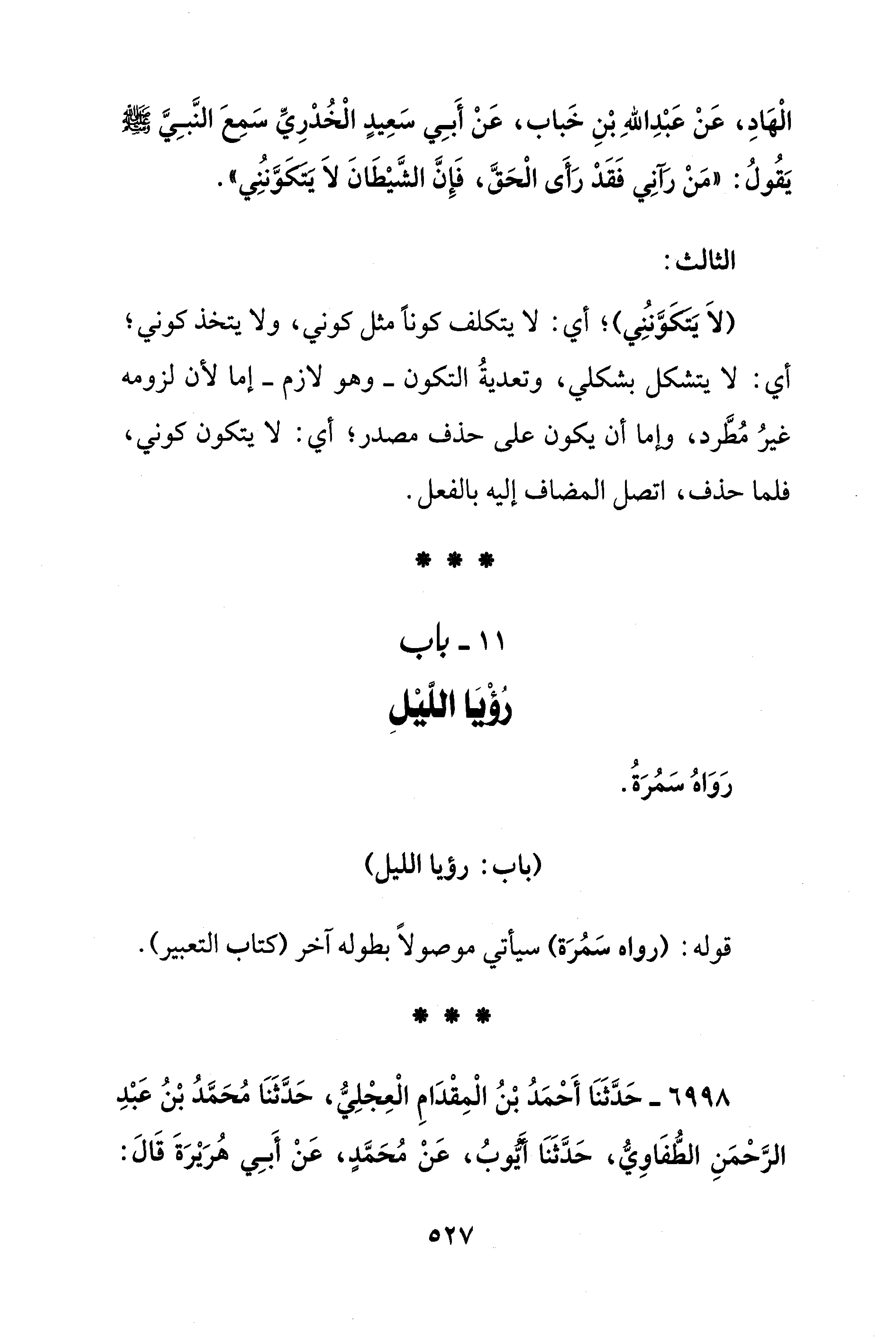 الْهَادِ، عَنْ عَبْدِ اللهِ بْنِ خَباب، عَنْ أَبِي سَعِيدٍ الْخُدْرِيِّ سَمعَ النَّبِيَّ - صلى الله عليه وسلم - يَقُولُ: "مَنْ رَآنِي فَقَدْ رَأَى الْحَقَّ، فَإِنَّ الشَّيْطَانَ لَا يَتَكَوَّننُي".