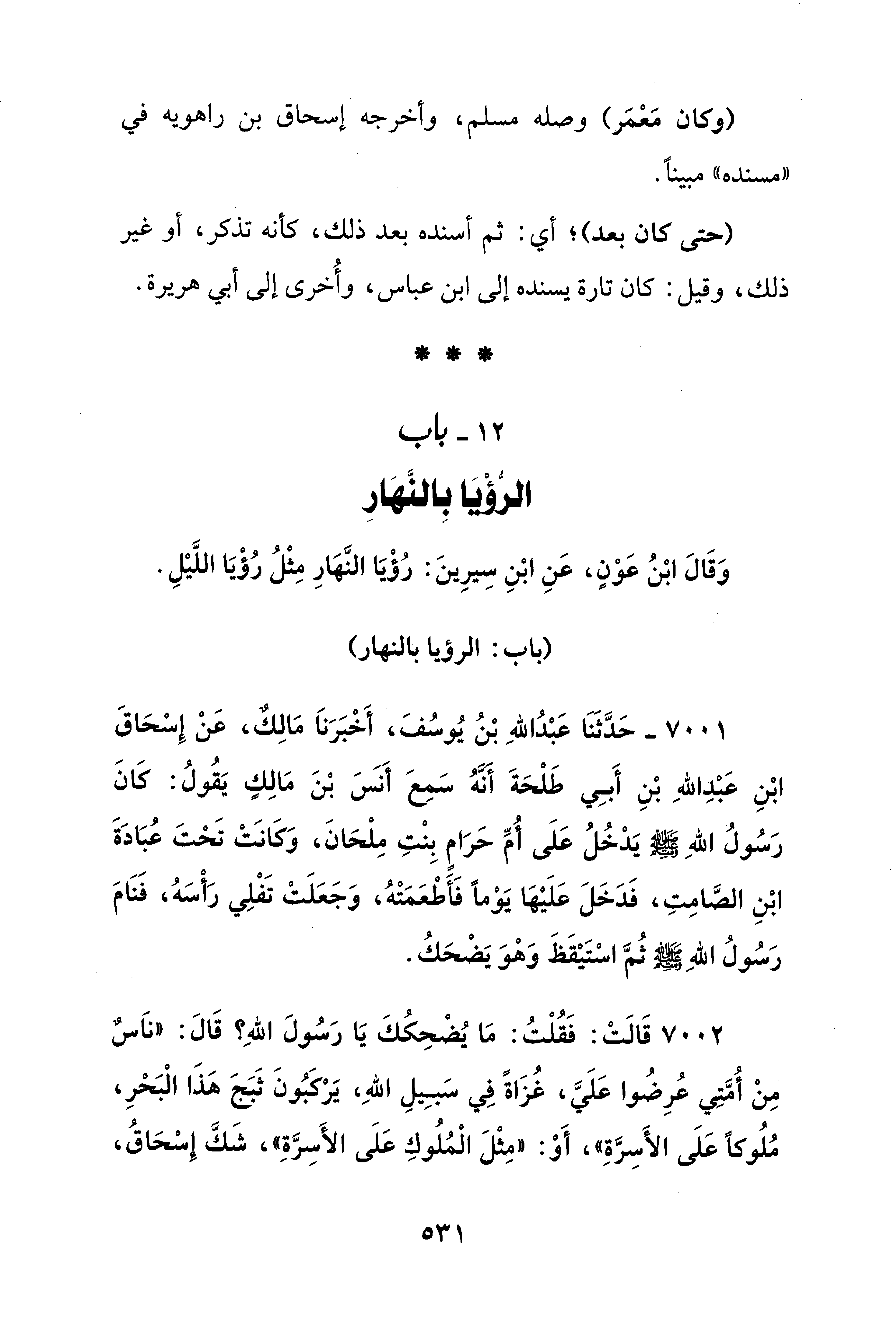 7002 - قَالَتْ: فَقُلْتُ: مَا يُضْحِكُكَ يَا رَسُولَ اللهِ؟ قَالَ: "نَاسٌ مِنْ أُمَّتِي عُرِضُوا عَلَيَّ، غُزَاةً فِي سَبِيلِ اللهِ، يَرْكَبُونَ ثَبَجَ هَذَا الْبَحْرِ، مُلُوكًا عَلَى الأَسِرَّةِ"، أَوْ: "مِثْلَ الْمُلُوكِ عَلَى الأَسِرَّةِ"، شَكَّ إِسْحَاقُ،