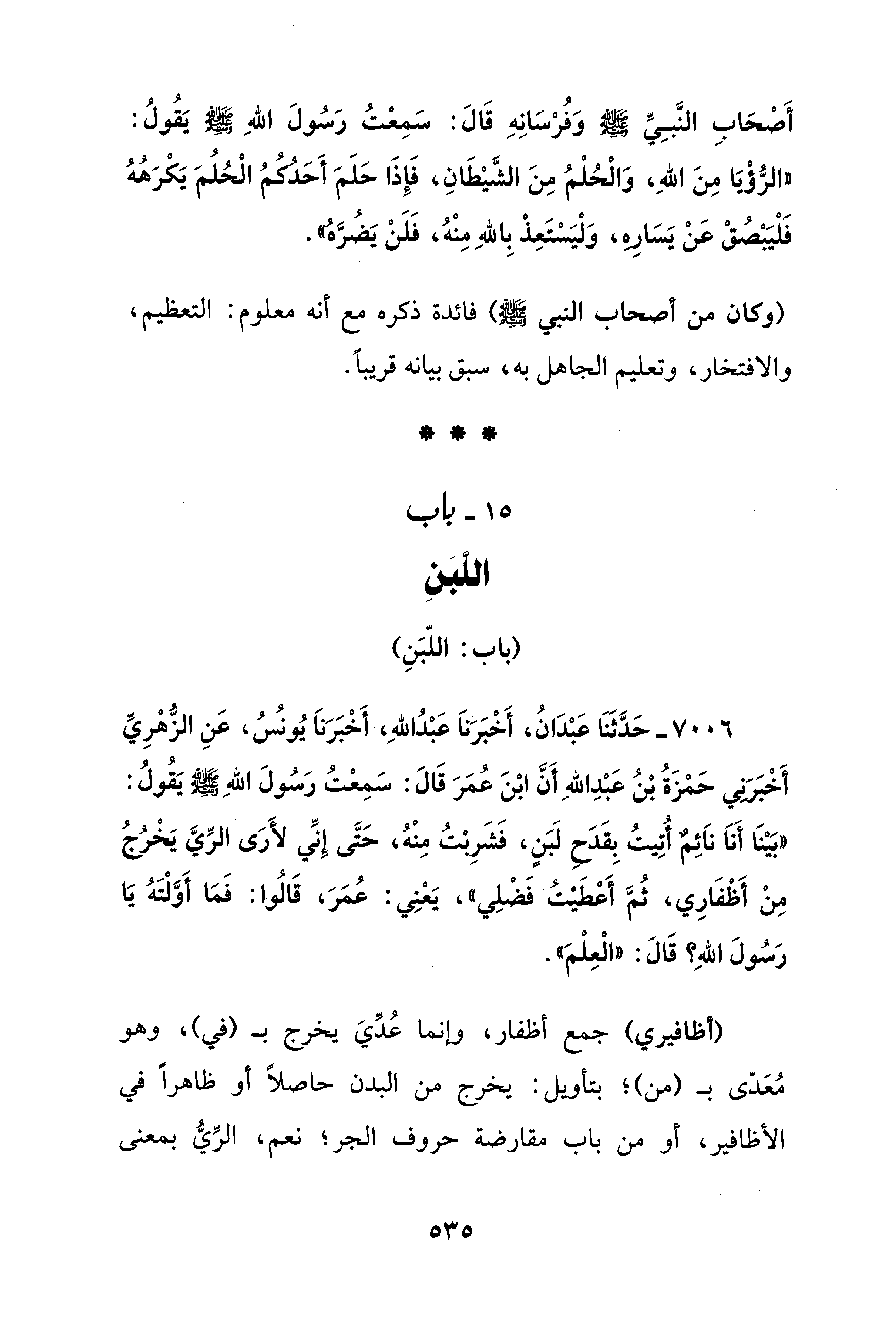 7006 - حَدَّثَنَا عَبْدَانُ، أَخْبَرَنَا عَبْدُ اللهِ، أَخْبَرَنَا يُونُسُ، عَنِ الزُّهْرِيِّ أَخْبَرَنِي حَمْزَةُ بْنُ عَبْدِ اللهِ أَنَّ ابْنَ عُمَرَ قَالَ: سَمِعْتُ رَسُولَ اللهِ - صلى الله عليه وسلم - يَقُولُ: "بَيْنَا أَنَا نَائِمٌ أُتِيتُ بِقَدَحٍ لَبَنٍ، فَشَرِبْتُ مِنْهُ، حَتَّى إِنِّي لأَرَى الرِّيَّ يَخْرُجُ مِنْ أَظْفَارِي، ثُمَّ أَعْطَيْتُ فَضْلِي"، يَعْنِي: عُمَرَ، قَالُوا: فَمَا أَوَّلْتَهُ يَا رَسُولَ اللهِ؟ قَالَ: "الْعِلْمَ".
