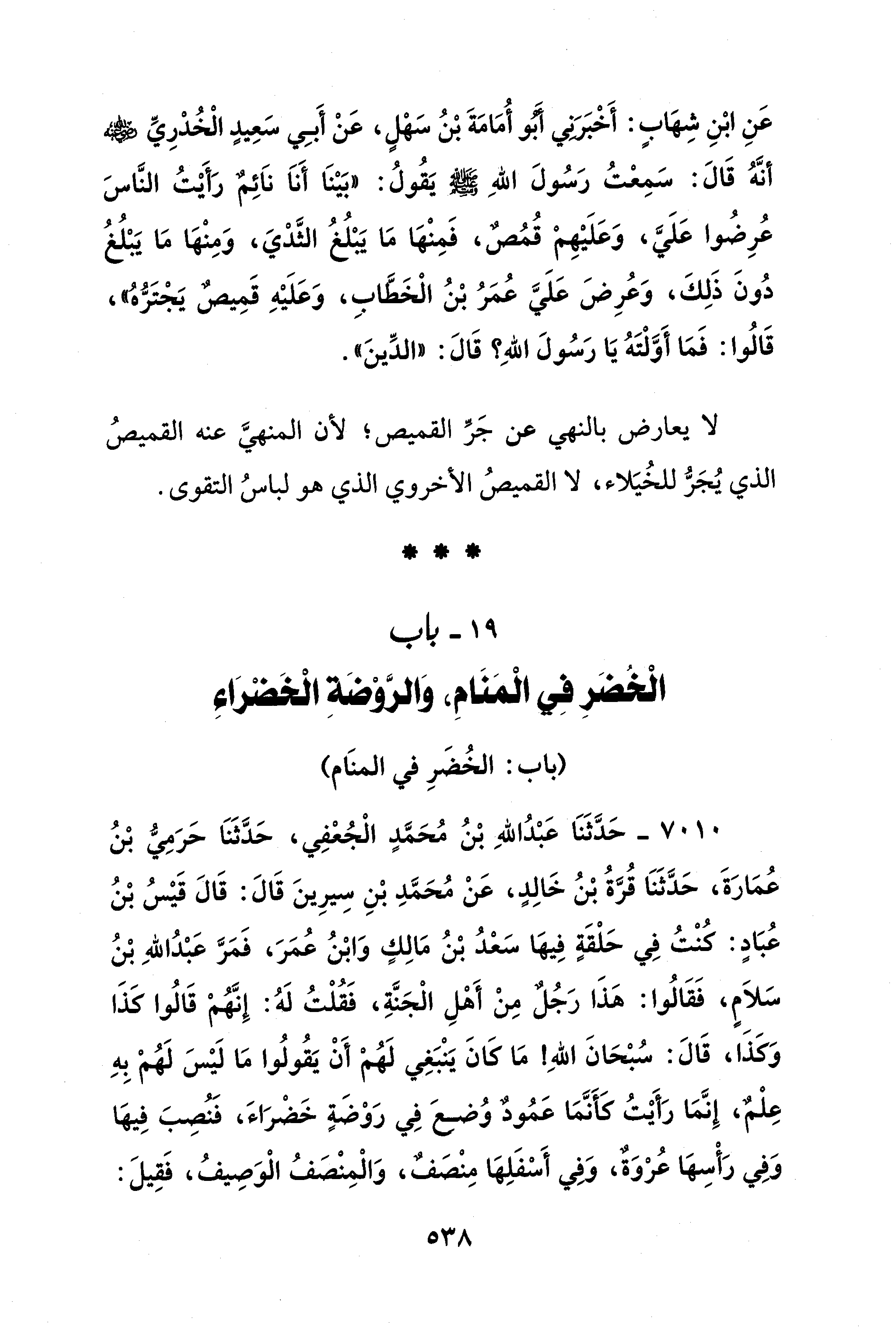 19 - باب الْخُضَرِ فِي الْمَنَامِ، وَالرَّوْضَةِ الْخَضْرَاءِ